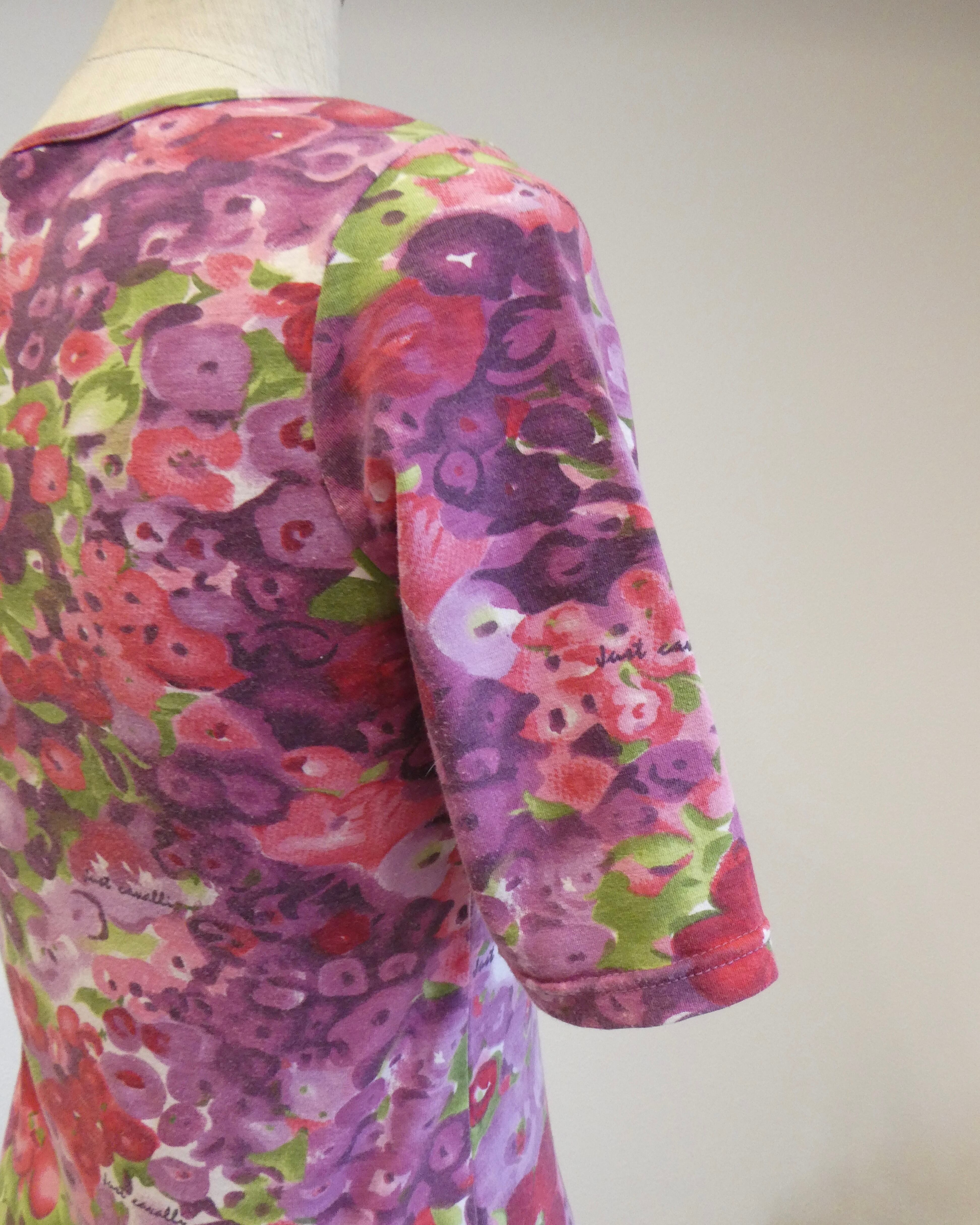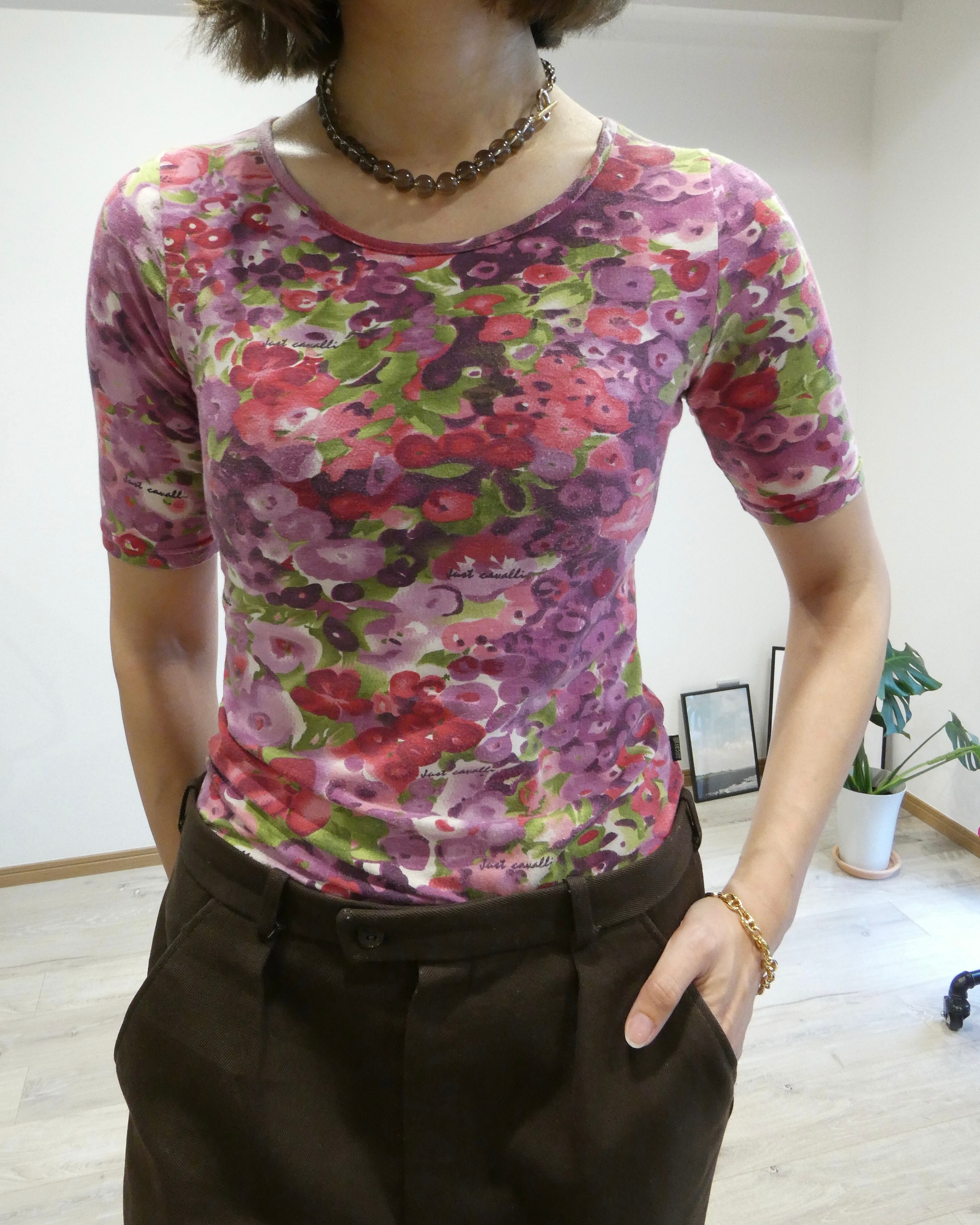 パープル、ピンク、グリーンの絵の具で描いたようなお花がプリントされたチビT