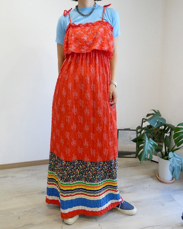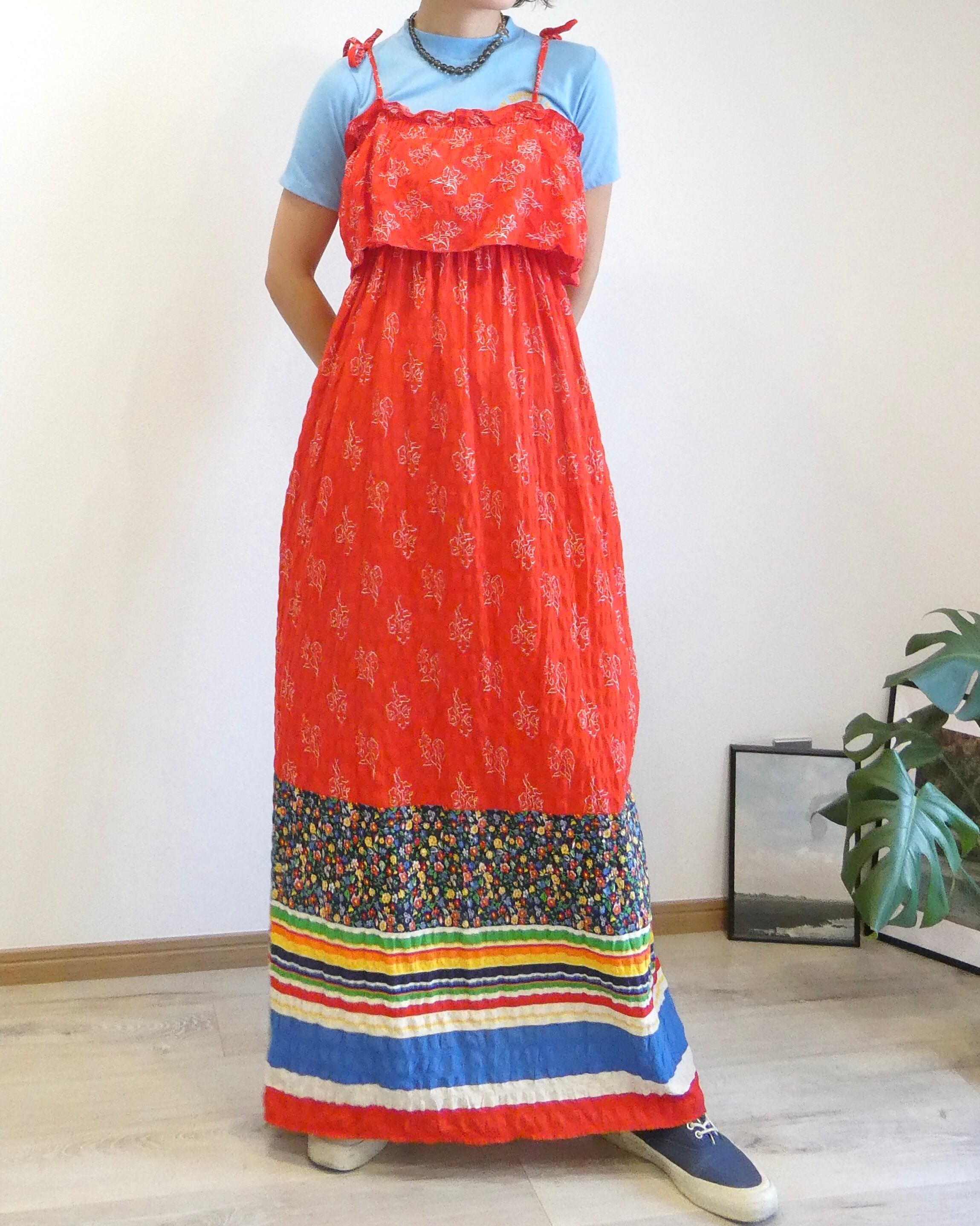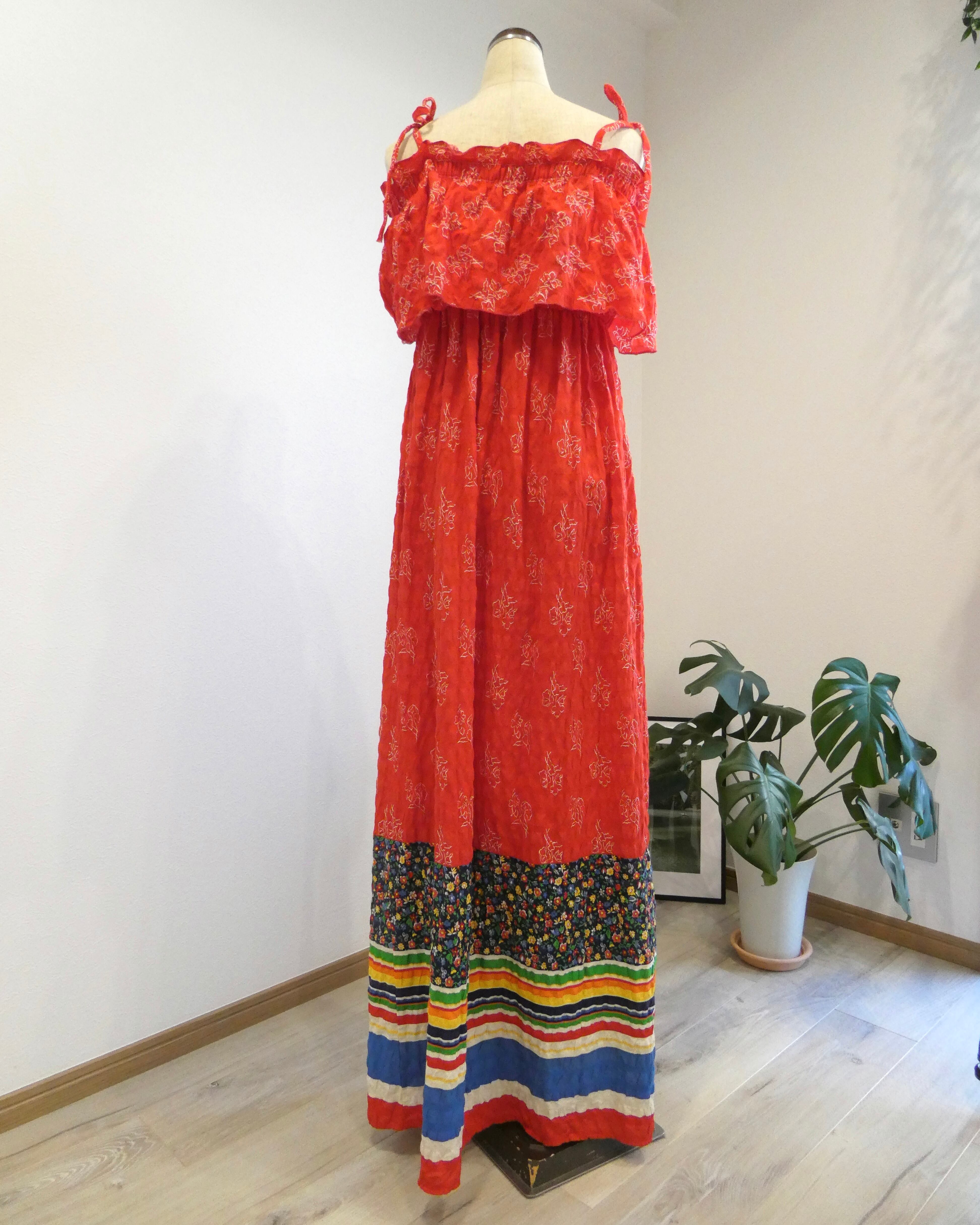 裾にかけてはネイビーベースの小花柄が広がり、その下にはグリーンやイエロー、オレンジ、ブルーなどのボーダーがカラフルにラインを描いています。