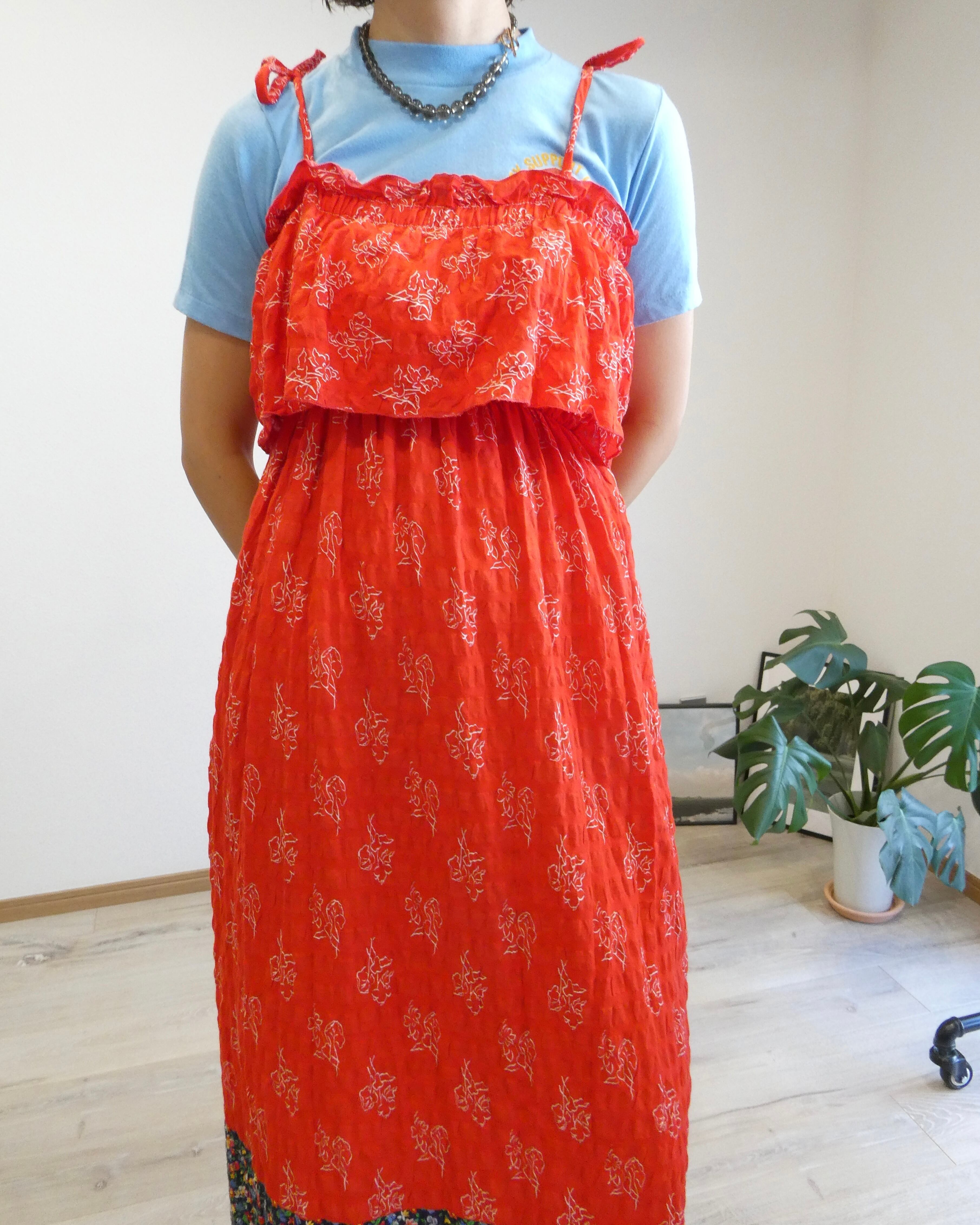 このワンピースは複数の布をつなぎ合わせるのではなく、一枚の布に模様がプリントされています