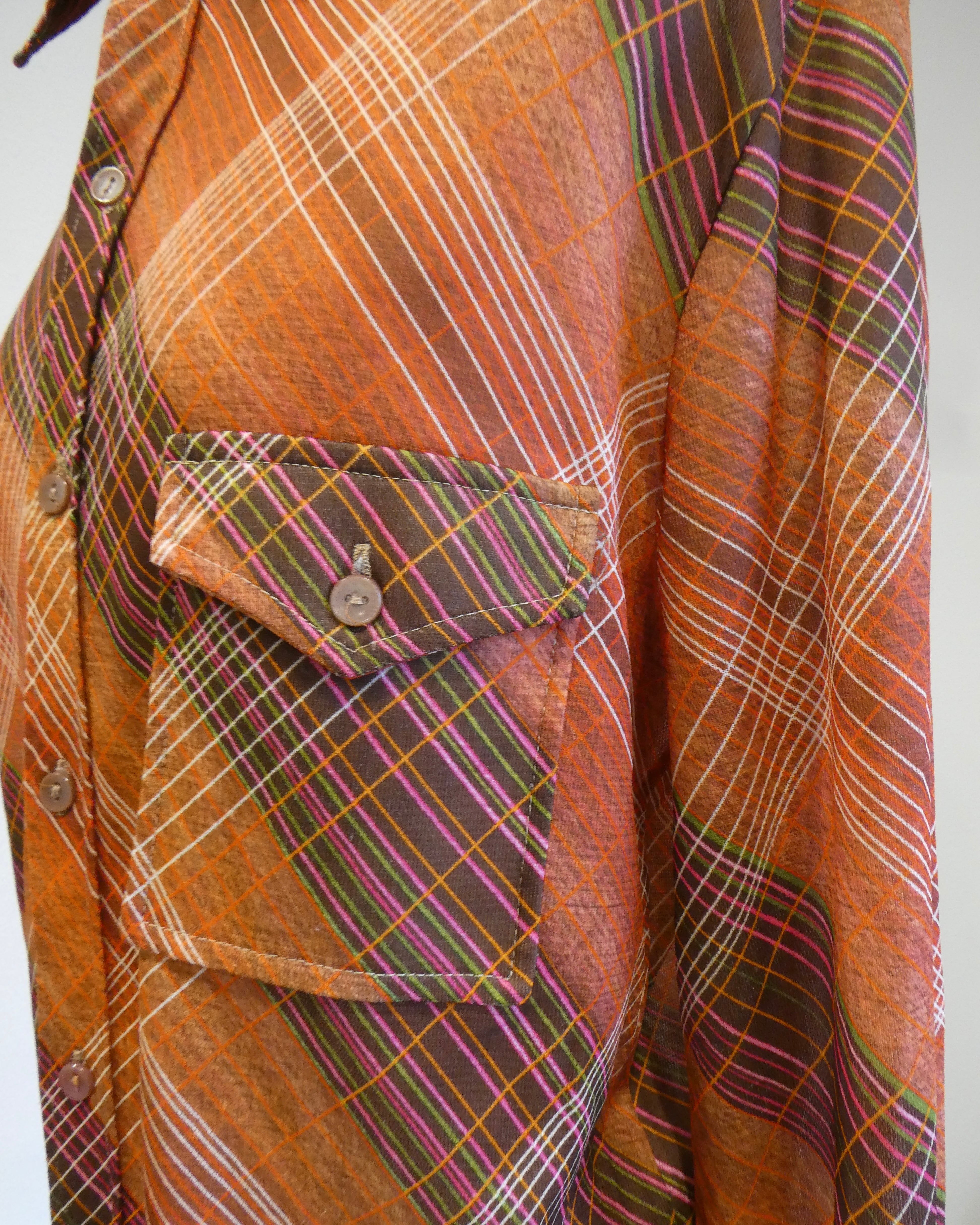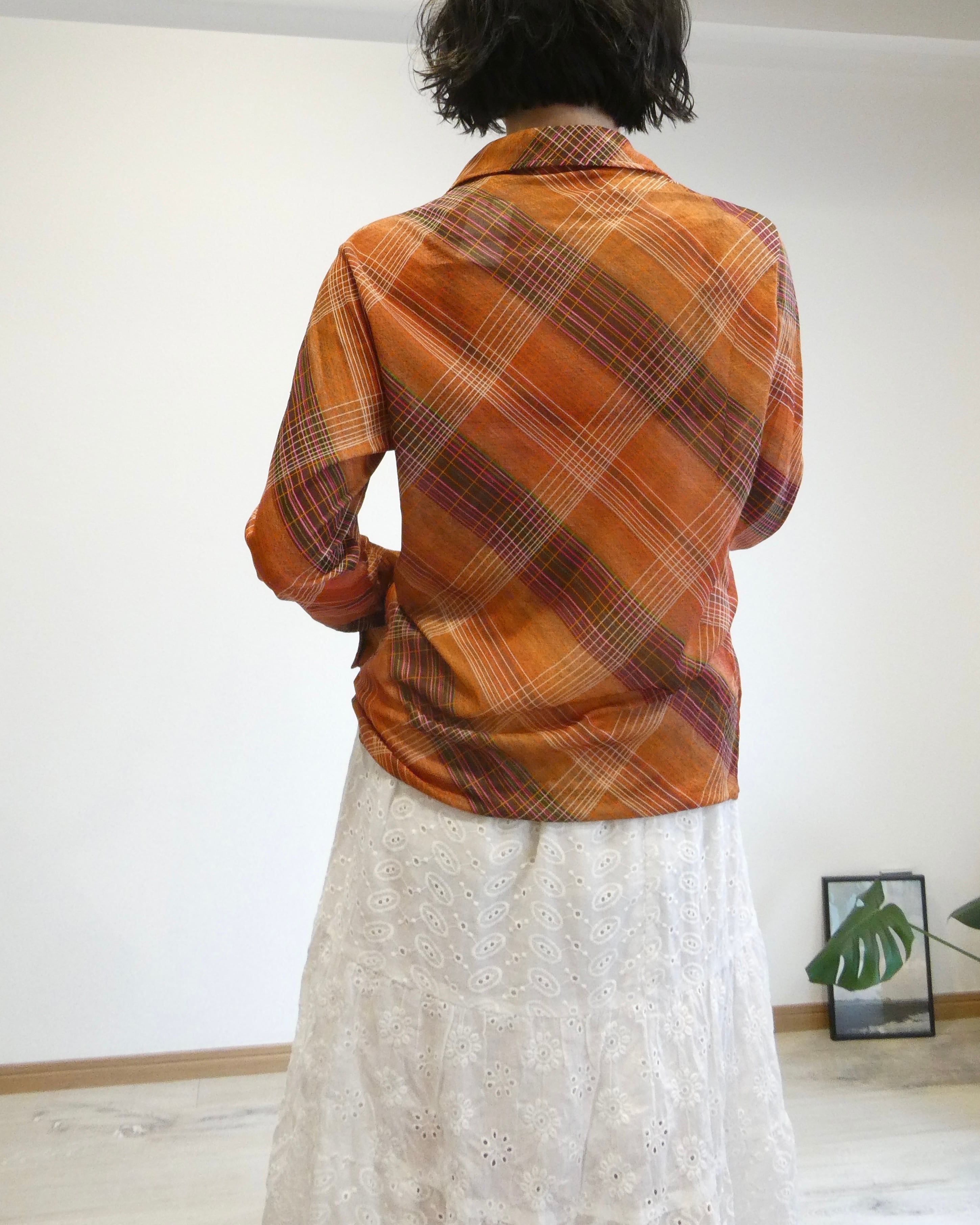 オレンジブラウンにダークブラウン、グリーン、ピンクなどの配色のヴィンテージのブラウス。