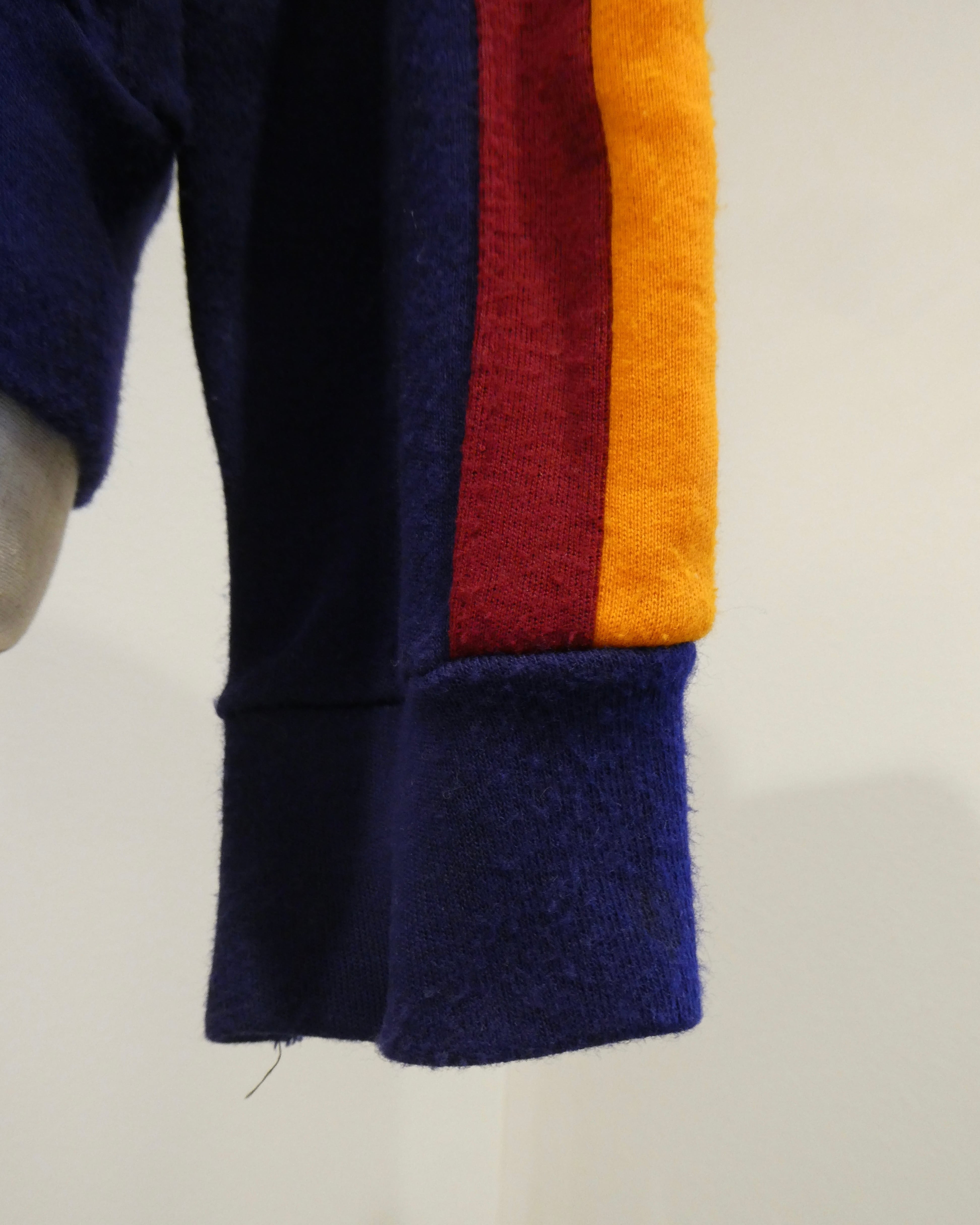 袖にはネイビーにオレンジとバーガンディーのライン