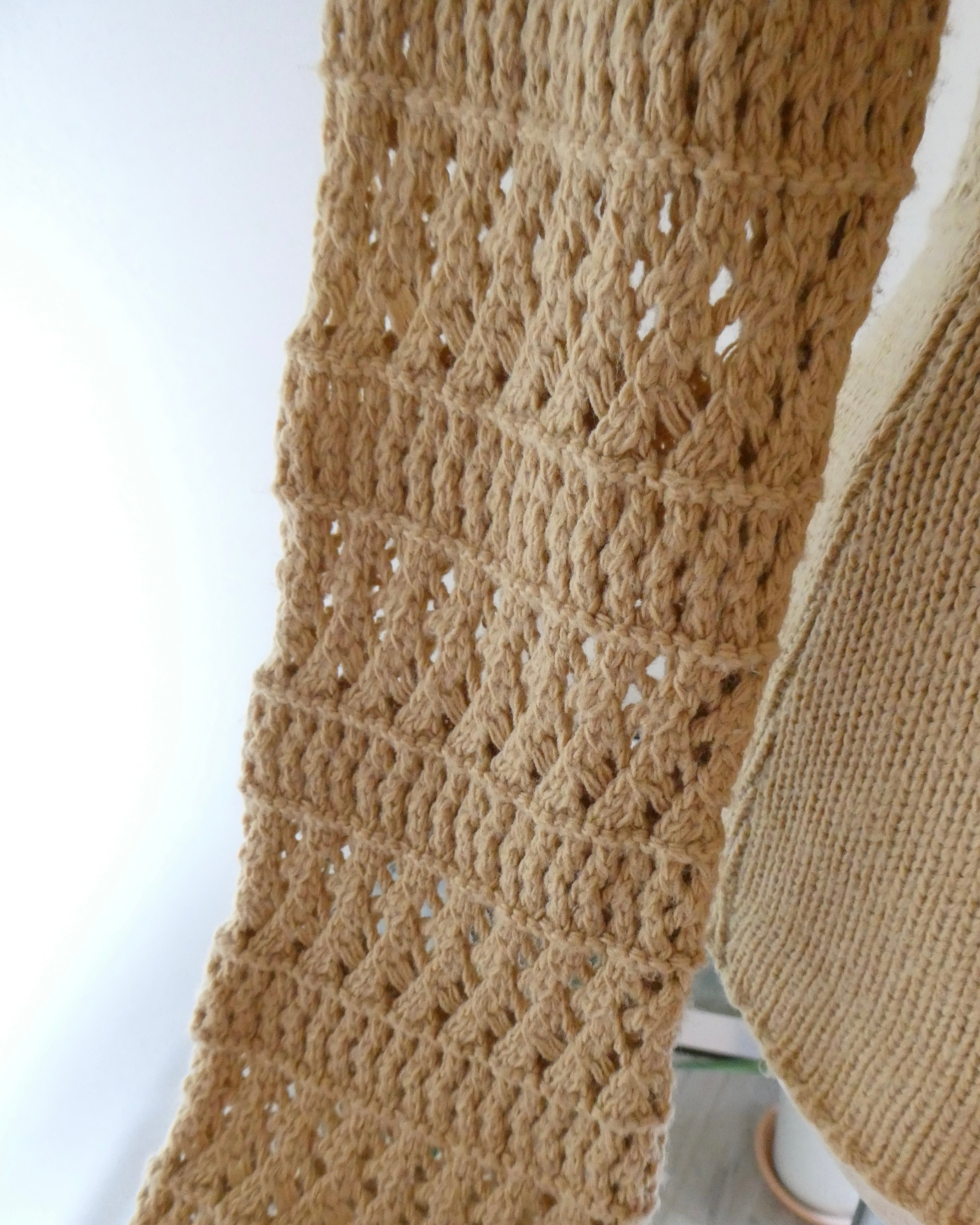 スウェットやフリースの下に重ねて、袖口から透かし編みをちらりとのぞかせるスタイルもおすすめです。