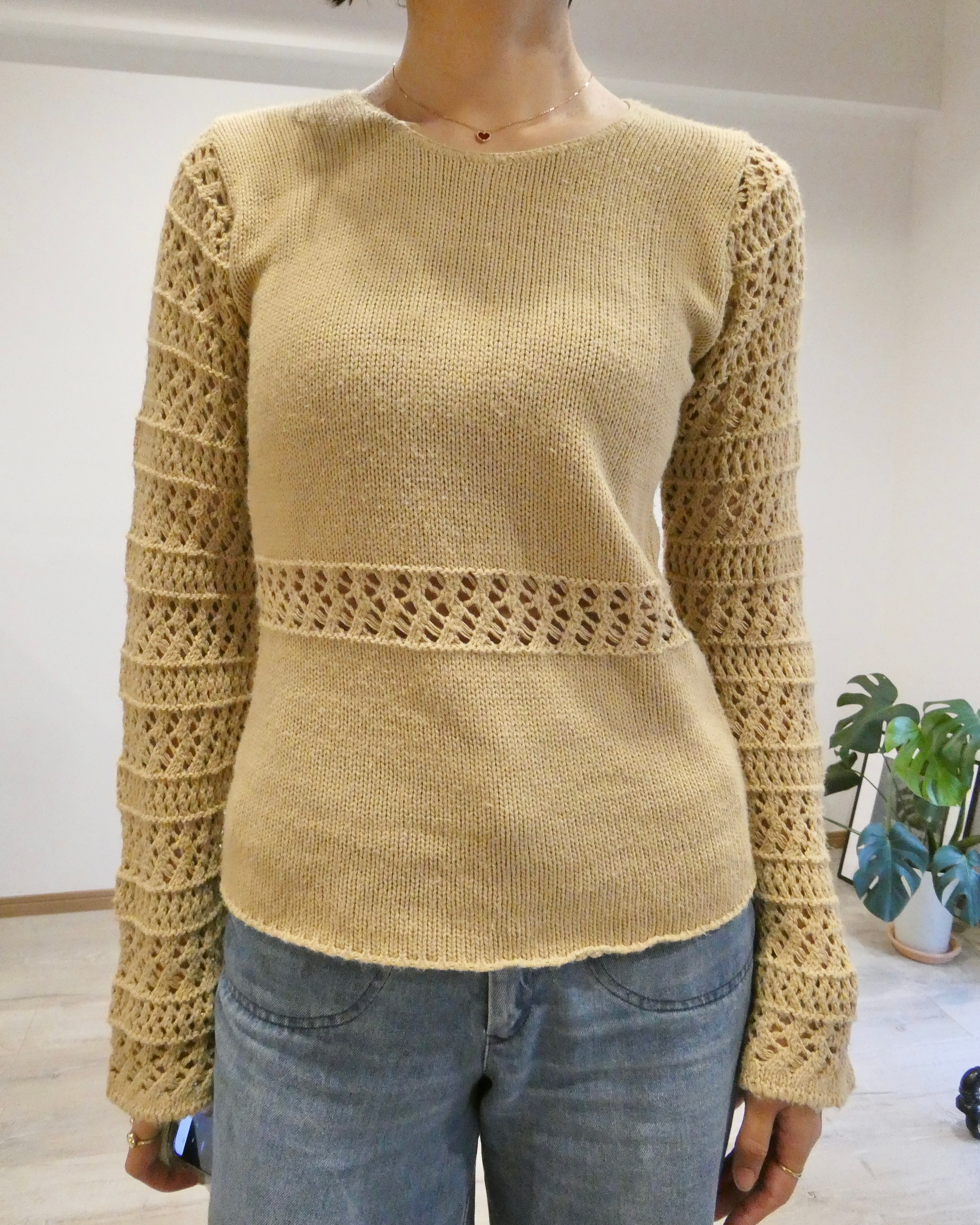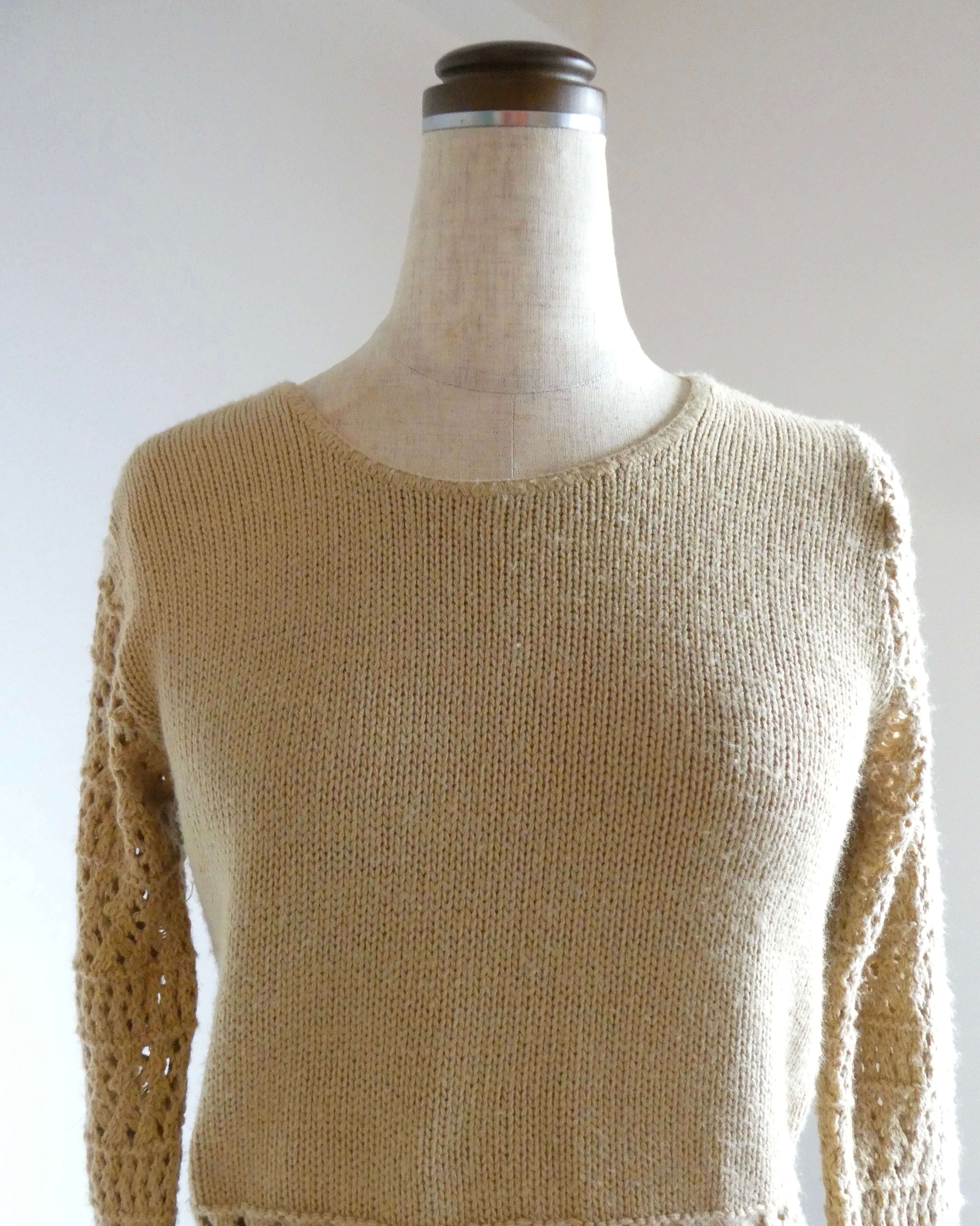 袖とウエストに透かし編みを施した、Made in USAのニットプルオーバー。