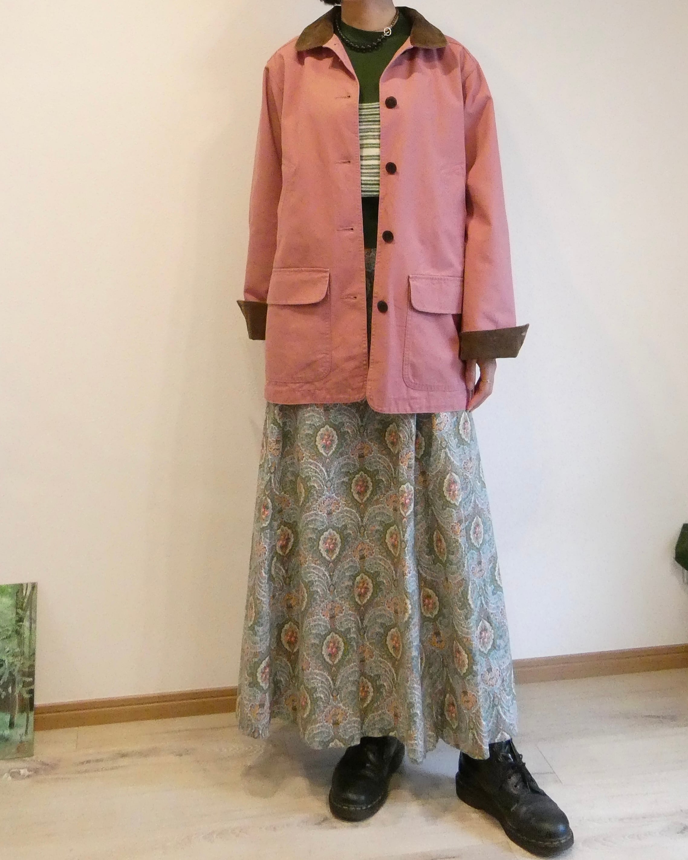 くすみピンクに襟、袖はブラウンのコーデュロイの配色です。