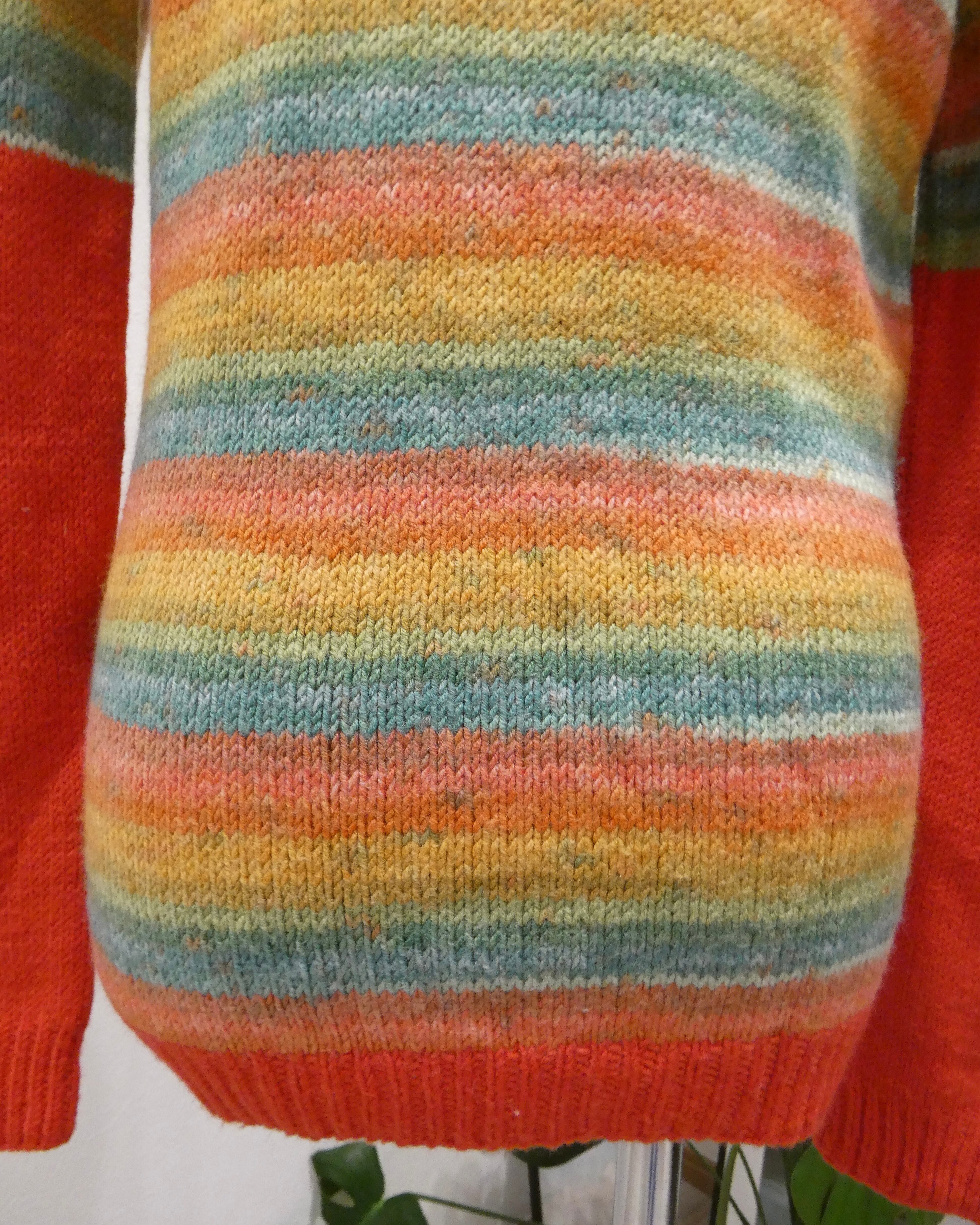 からだにフィットするシルエットや、肘あたりのオレンジのようなレッドのような切り替えがどこかフェミニンさを出してくれて個人的にとても好きなデザインです。