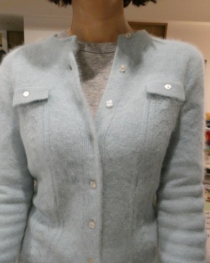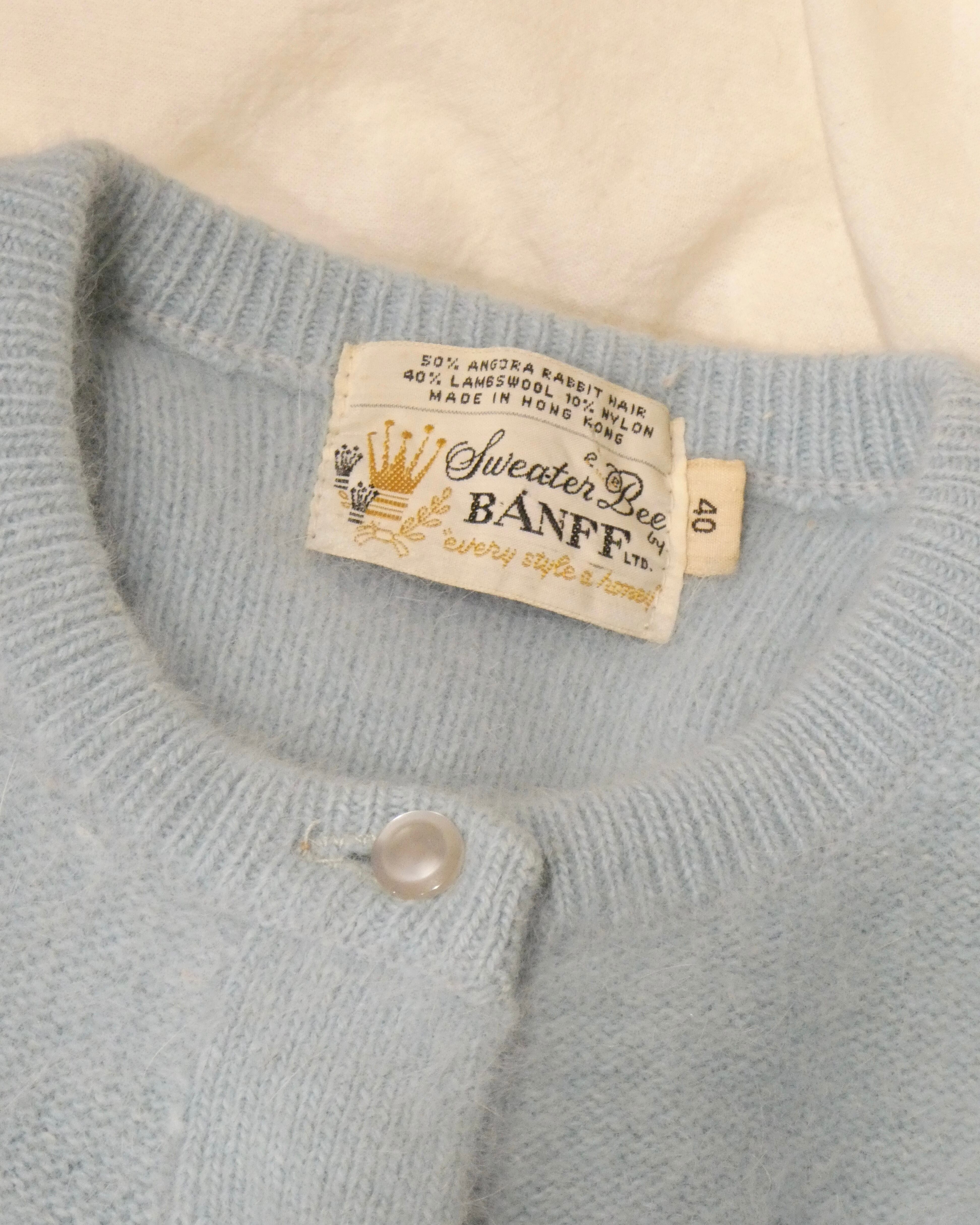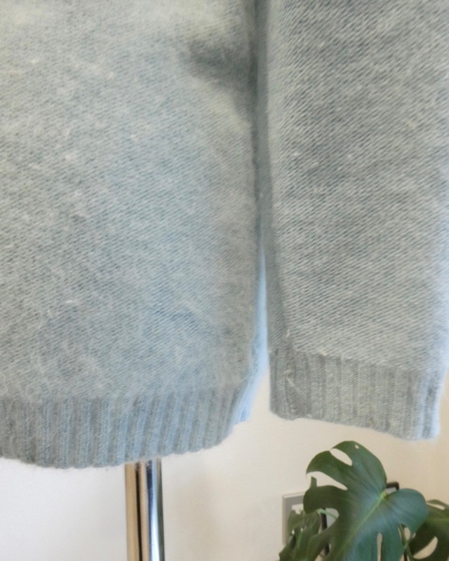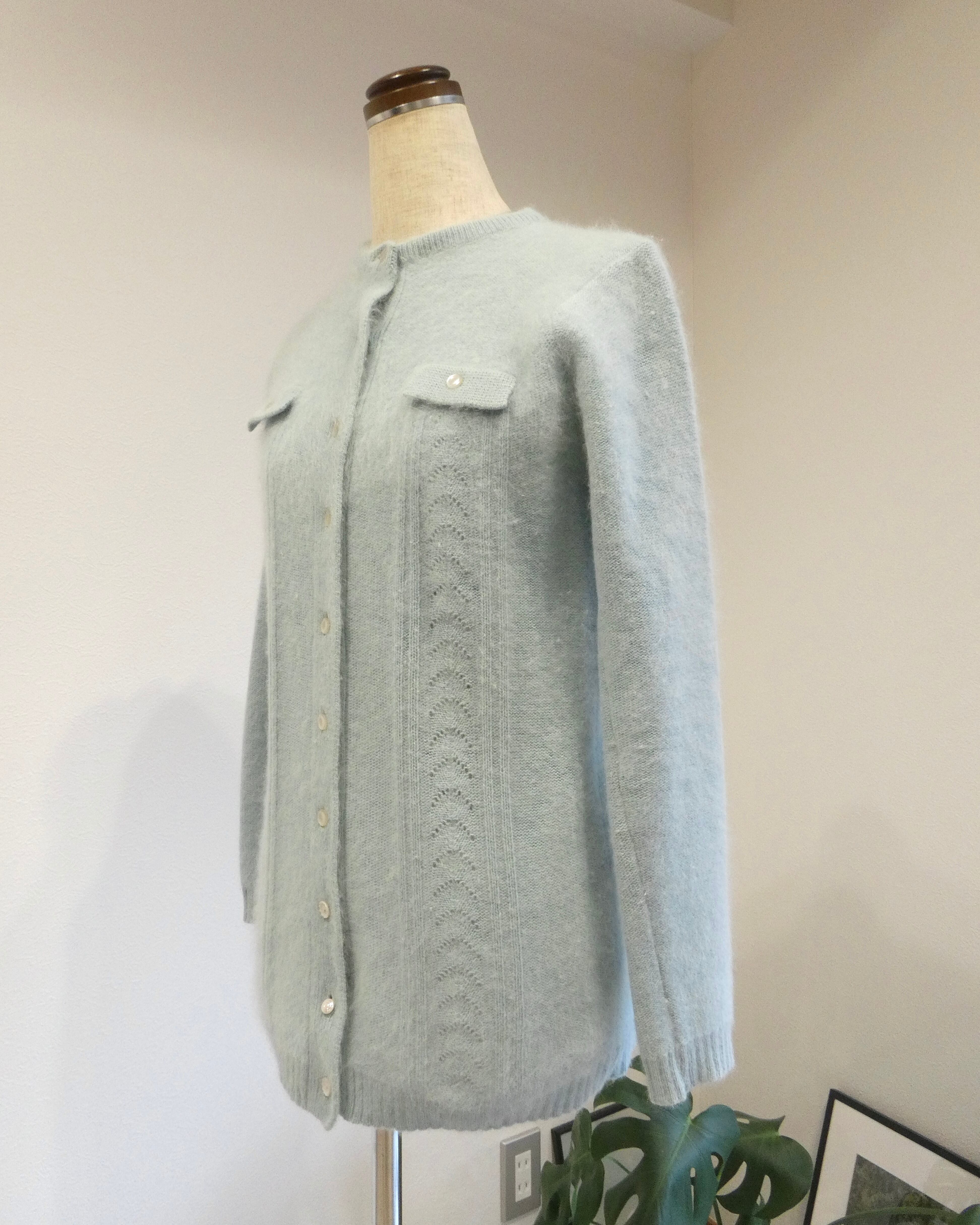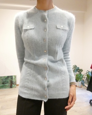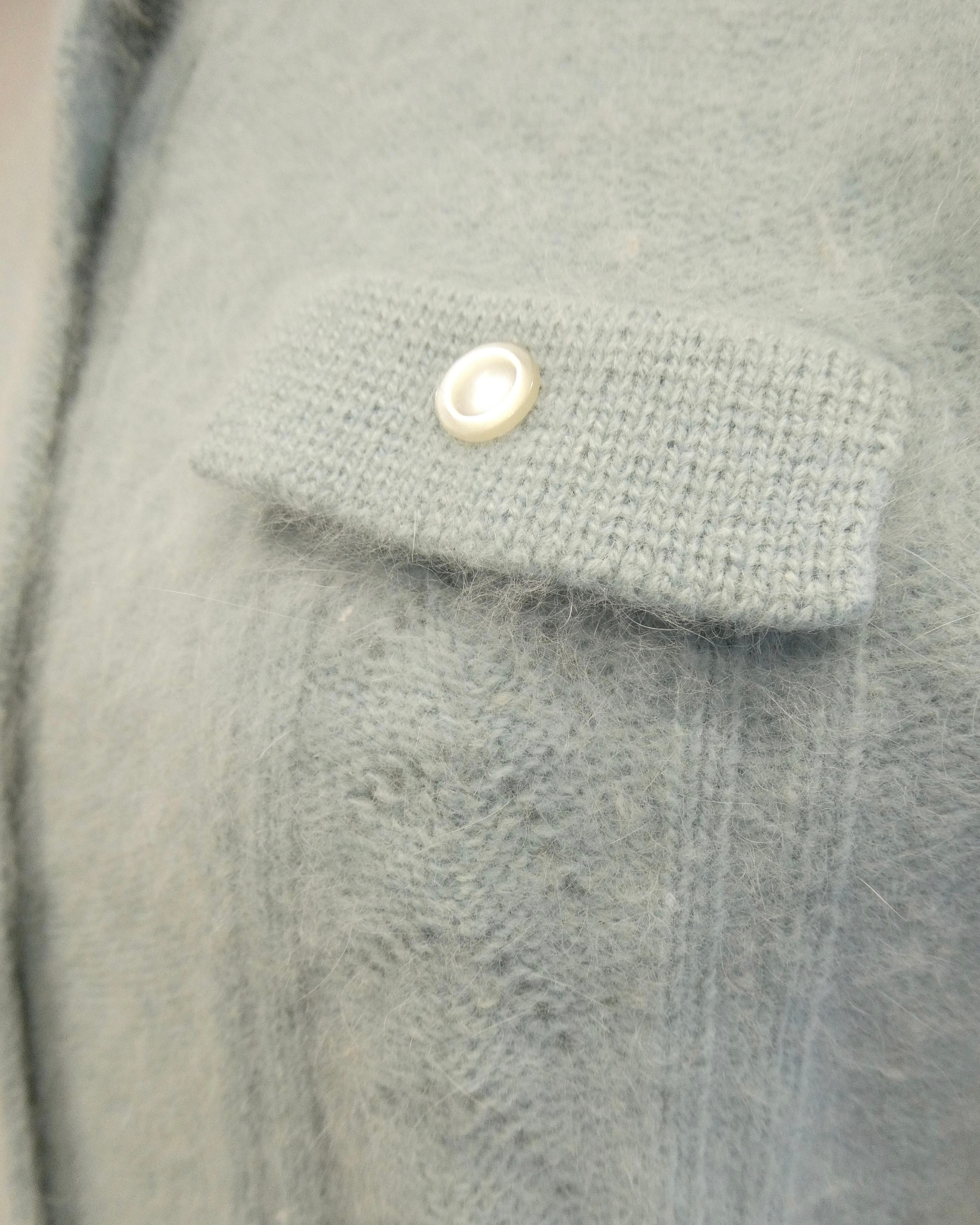 アンゴラ50%、ラムウール40%、ナイロン10%をブレンドしたふわふわとした毛足のライトブルーのヴィンテージカーディガンです。