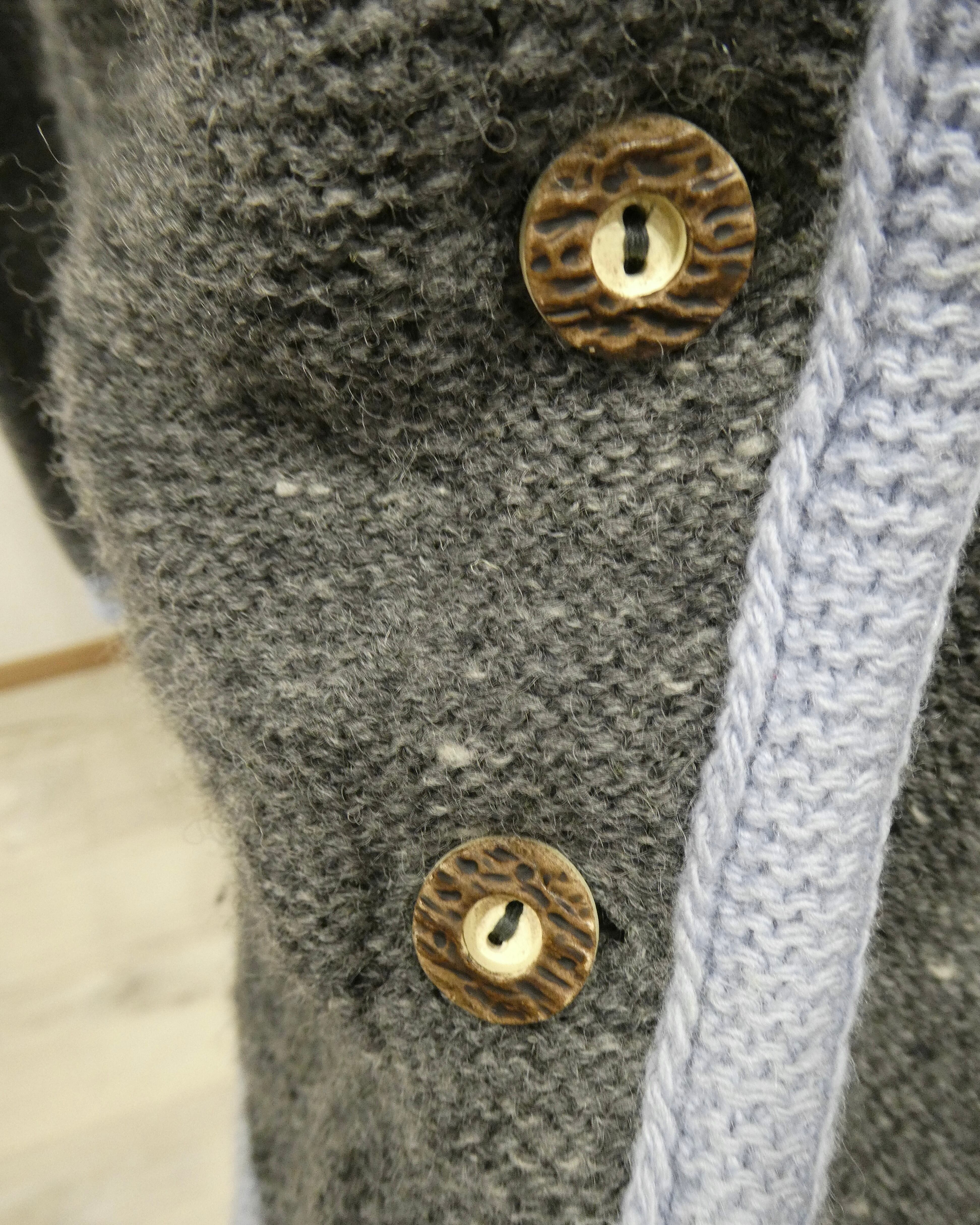 グレーにところどころホワイトが混ざったボディに袖や襟のライトブルーのパイピング