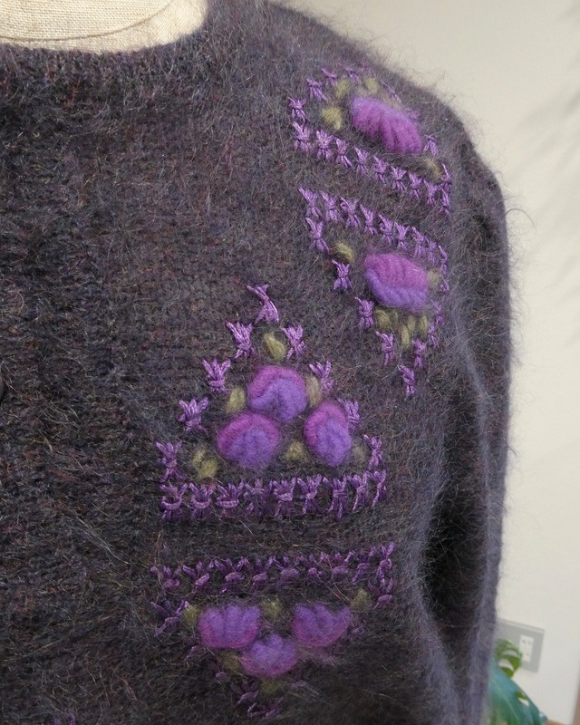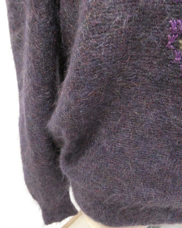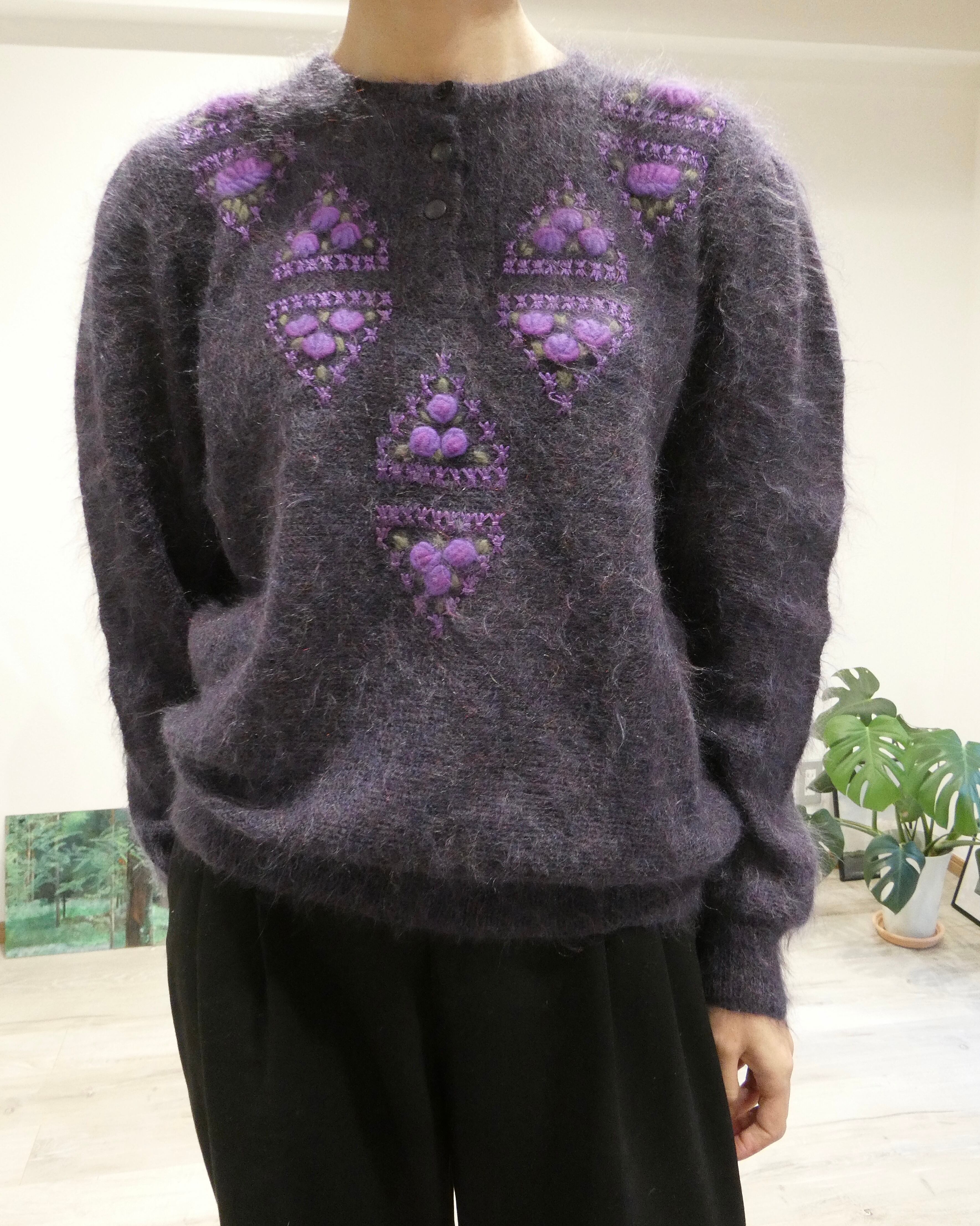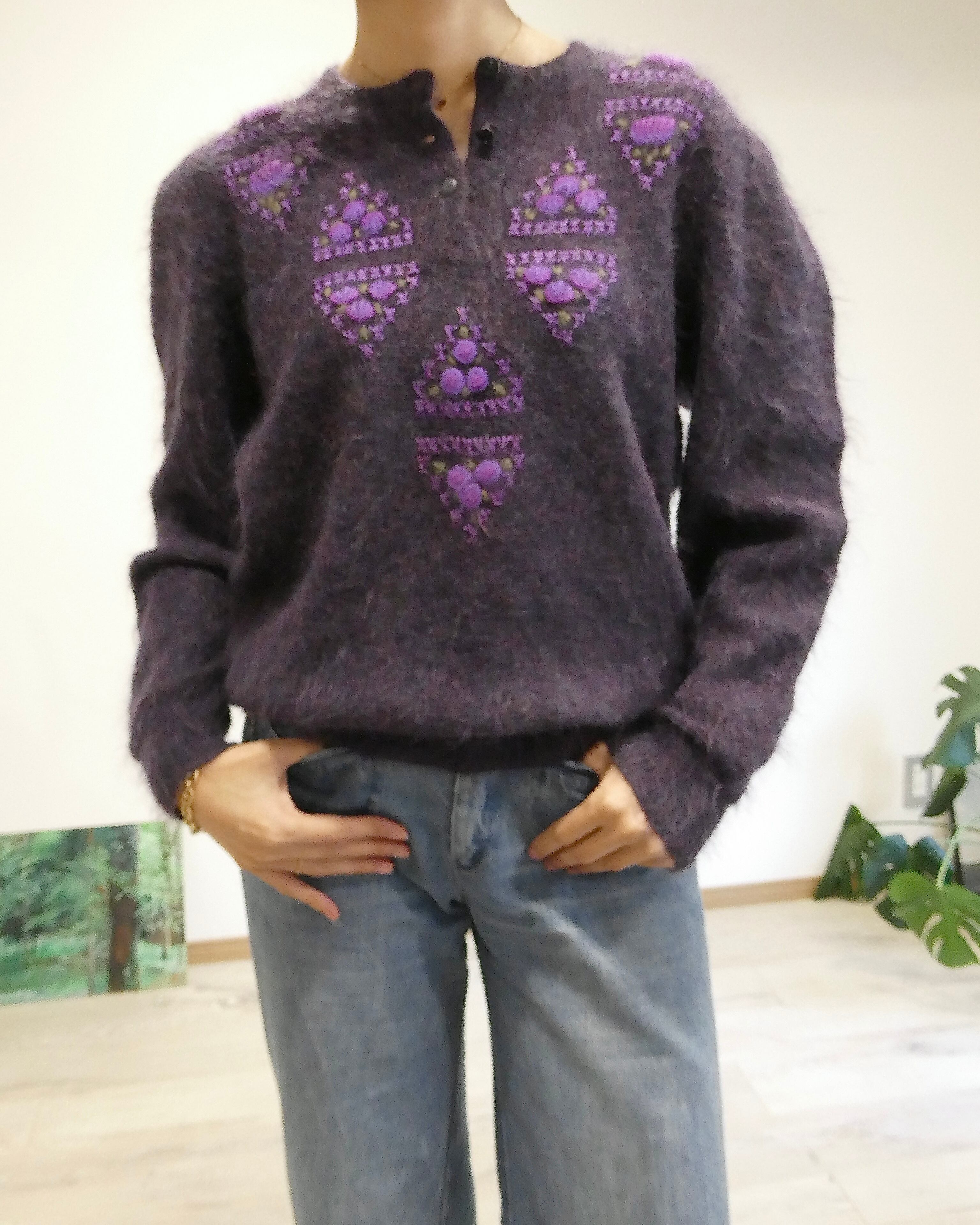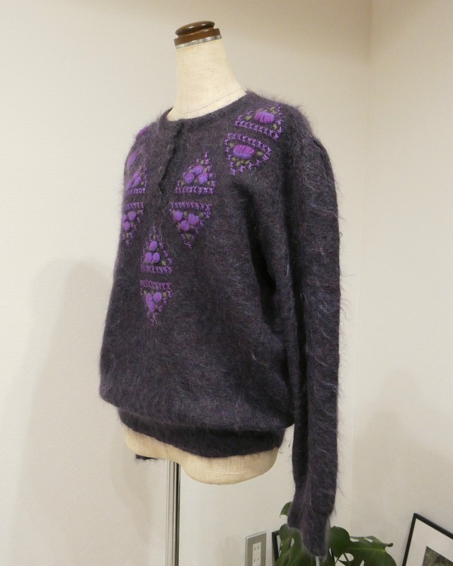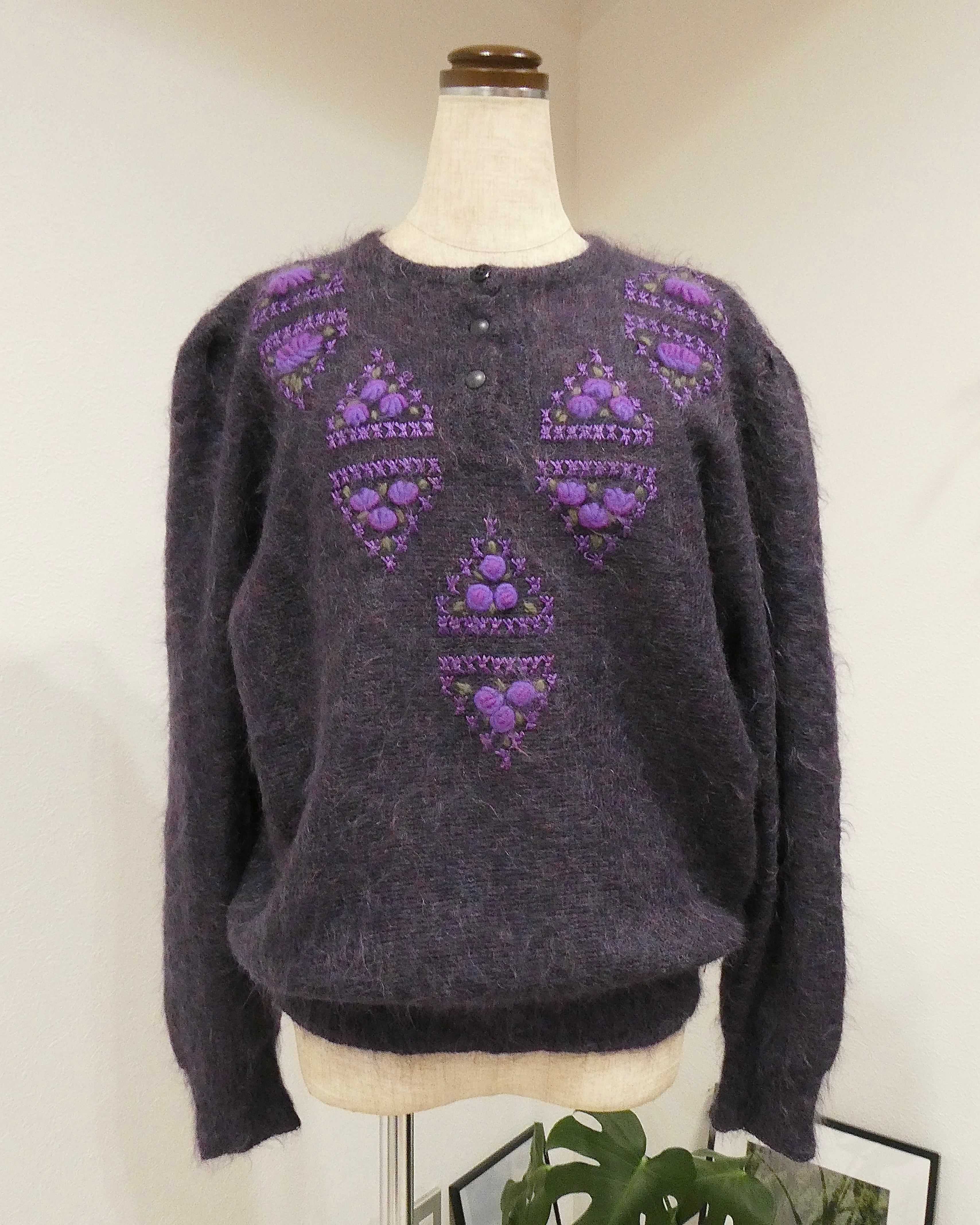 深みのあるパープルに紫の刺繍モチーフが映え、甘さとクラシカルさのバランスがほどよいデザイン。