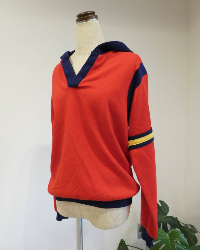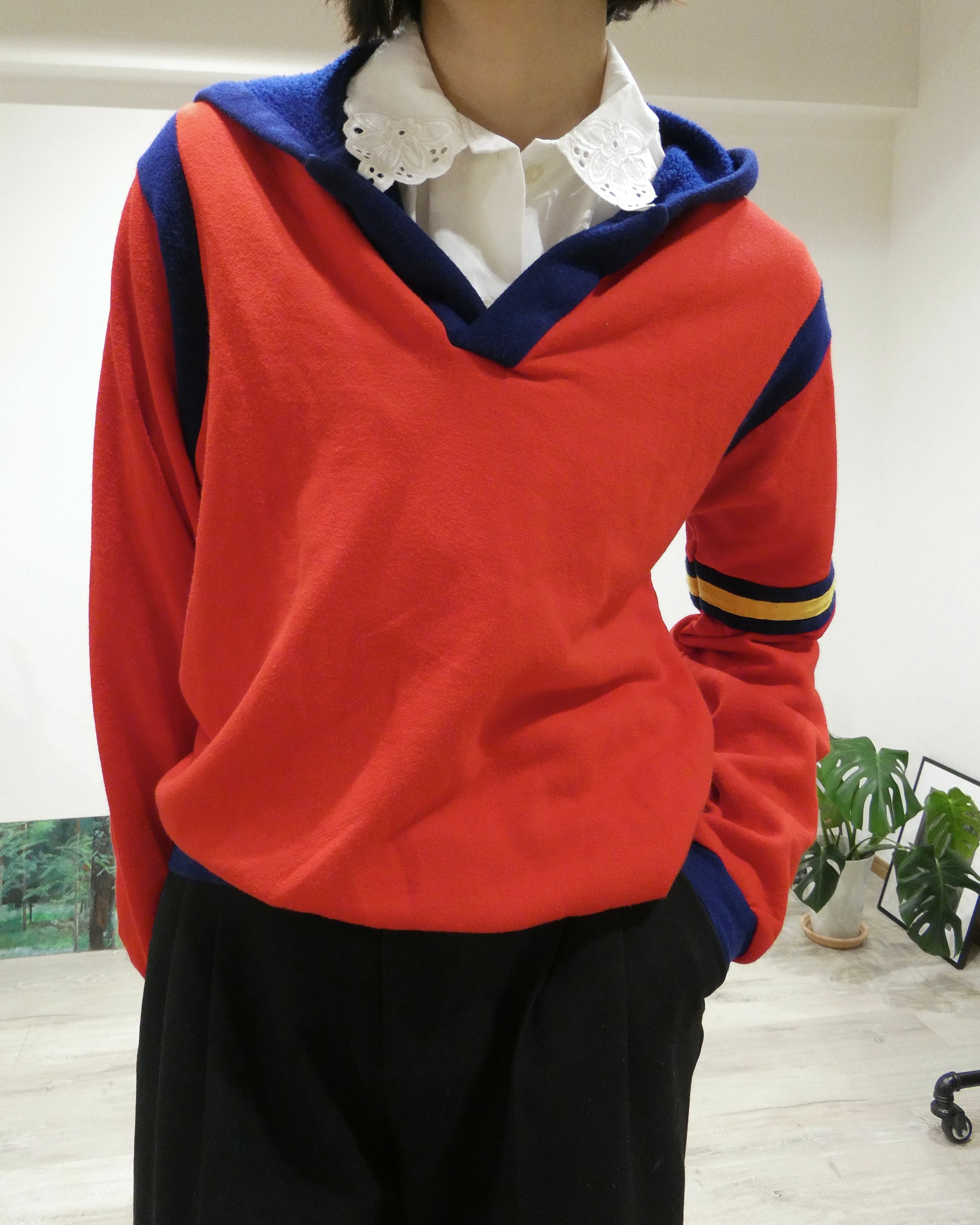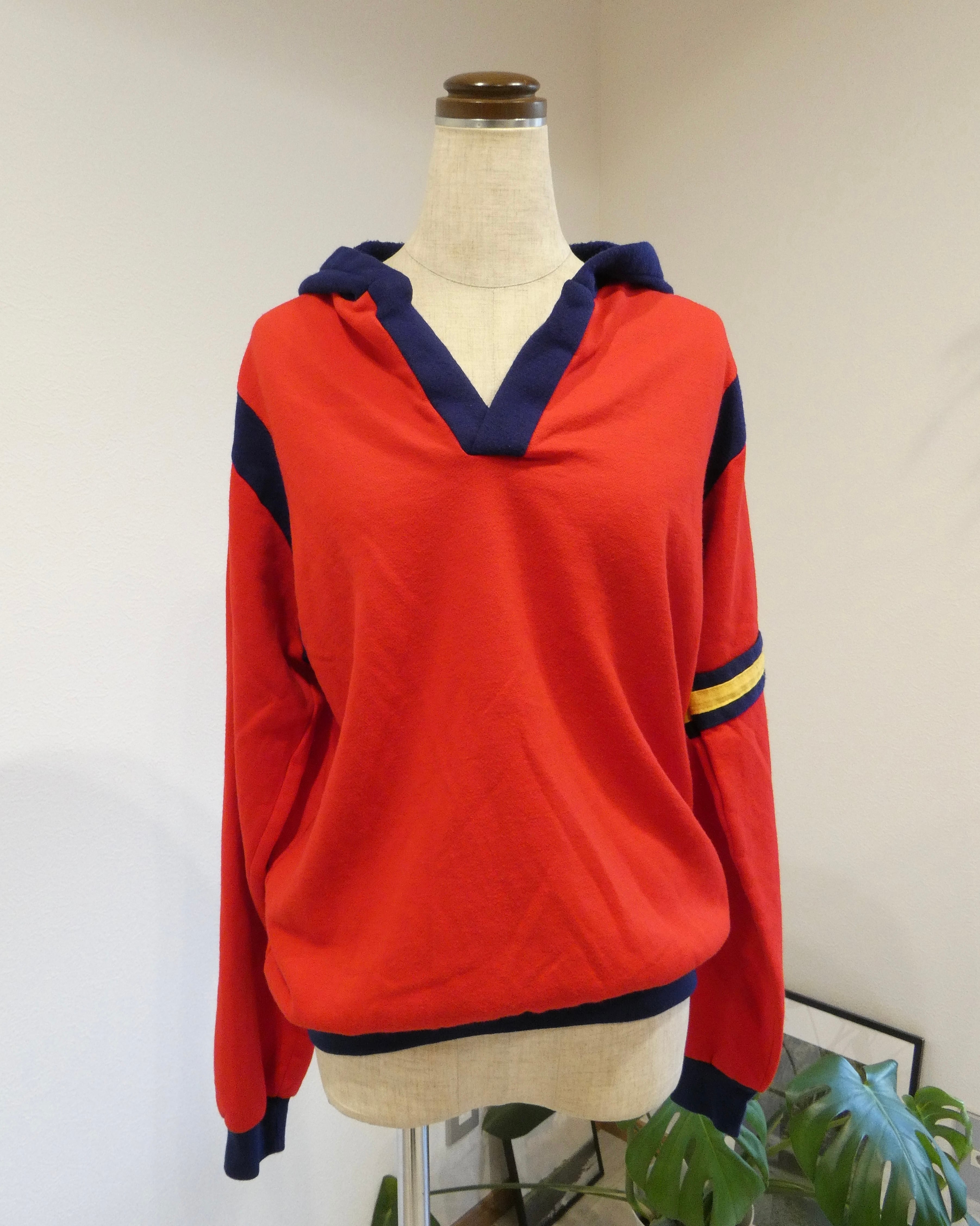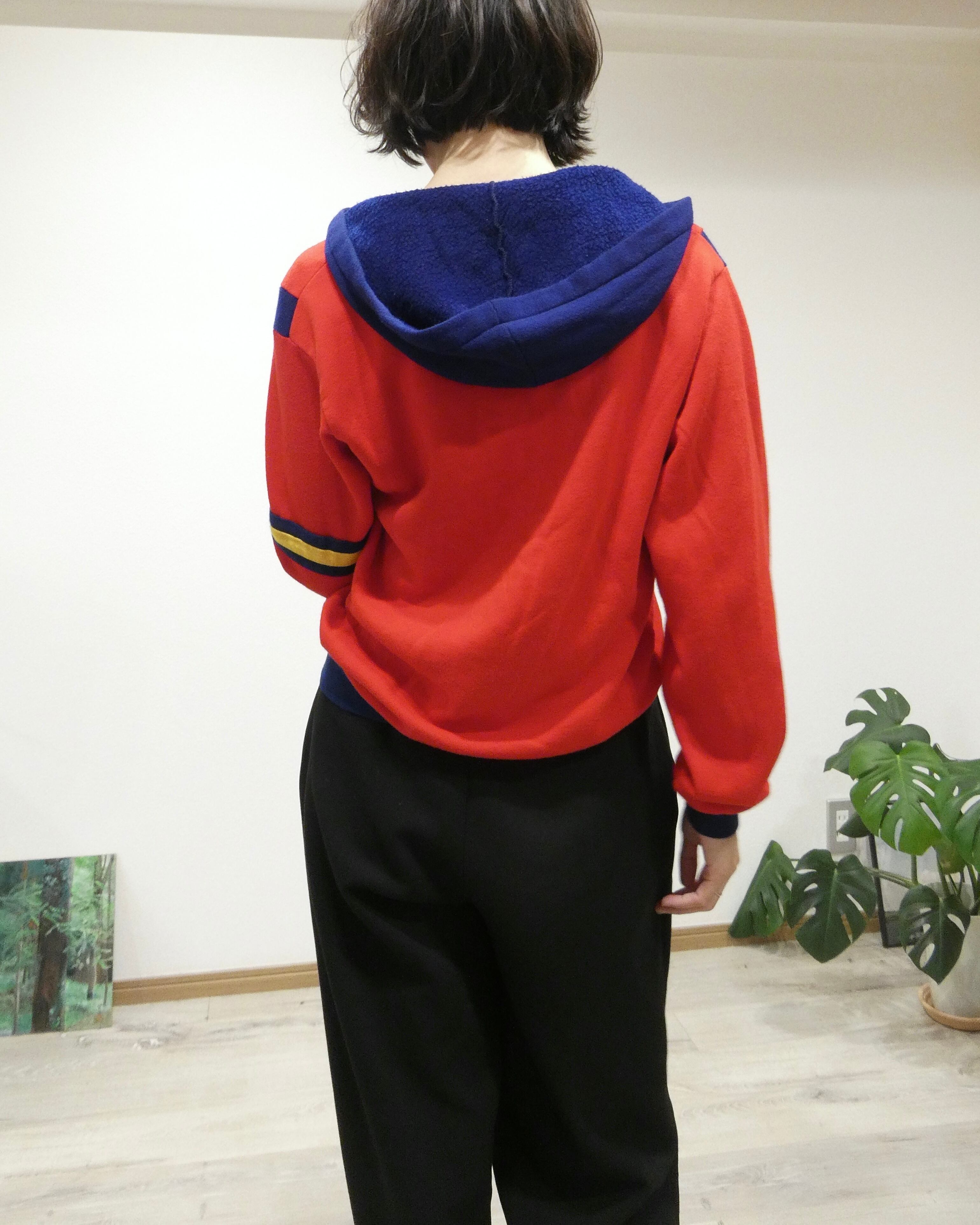 鮮やかなレッドのボディにネイビーのフードと袖のイエローのラインがアクセントになっています。