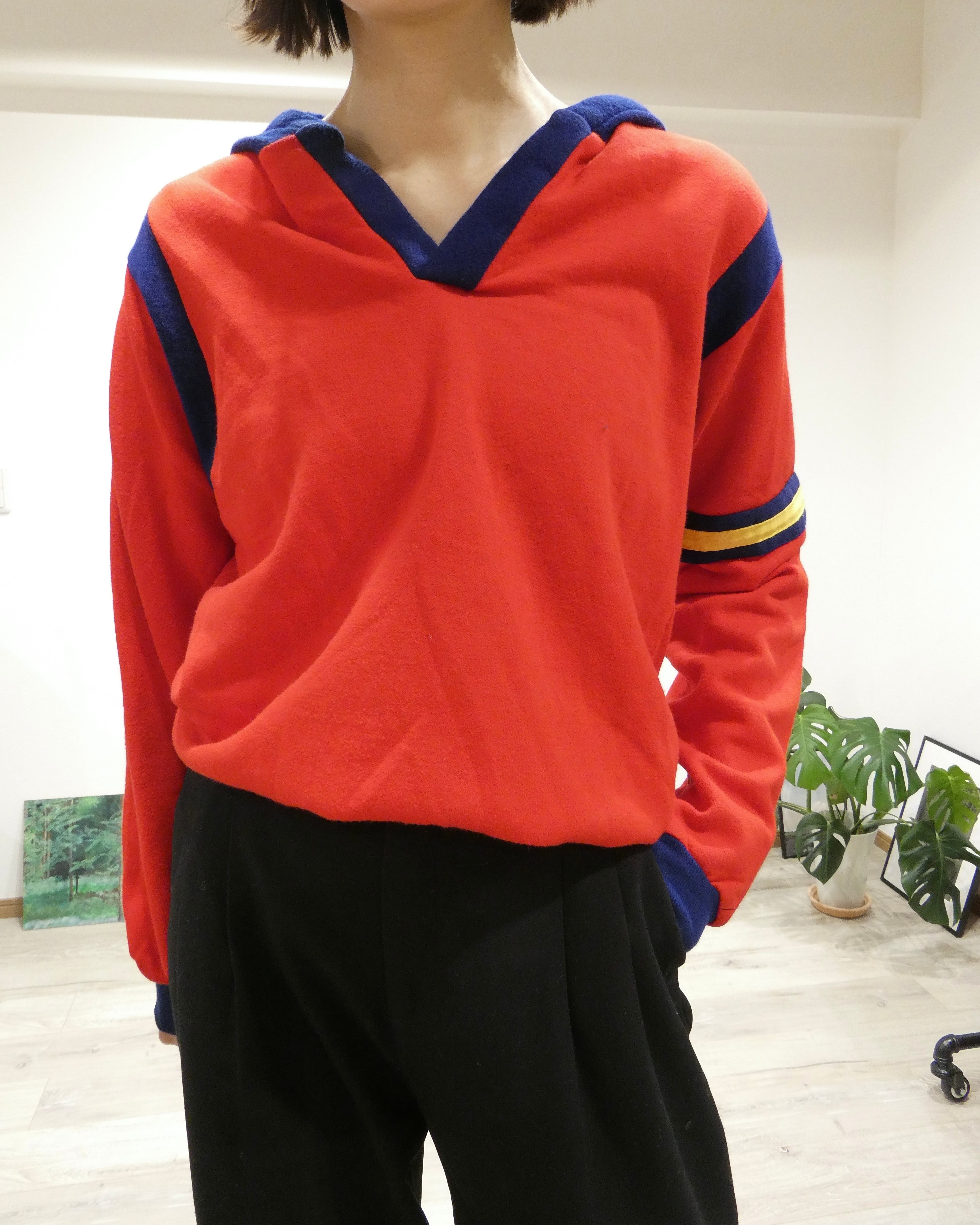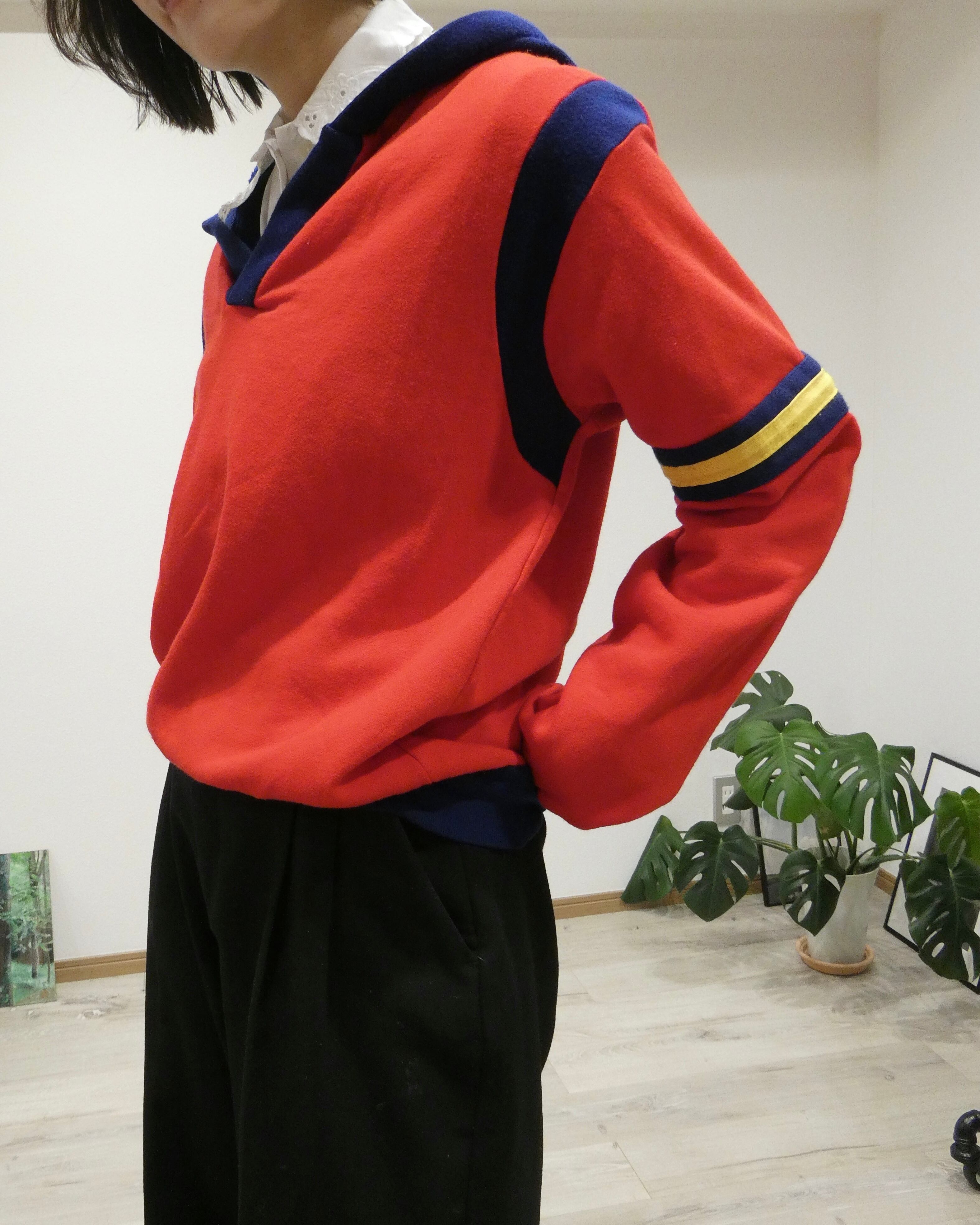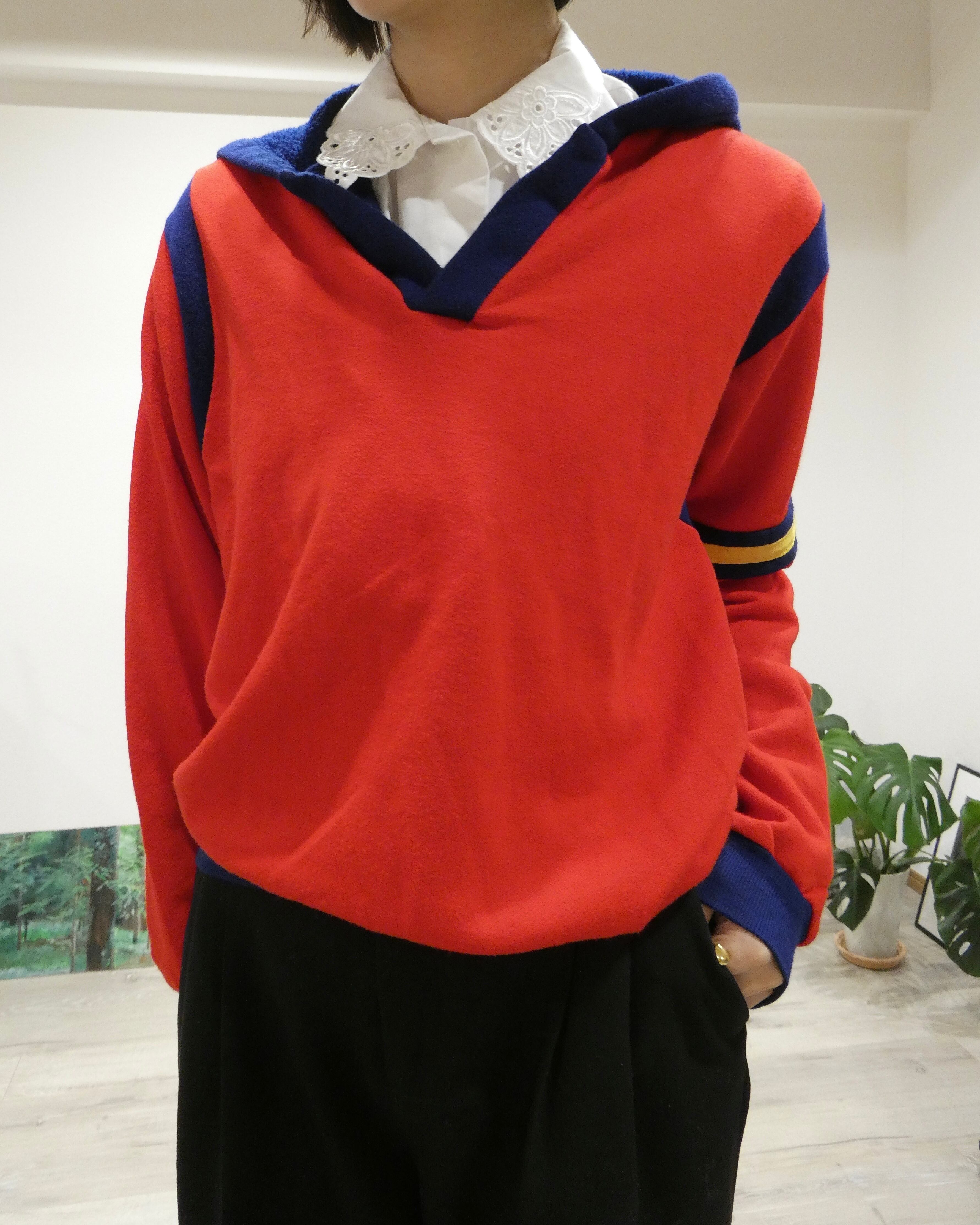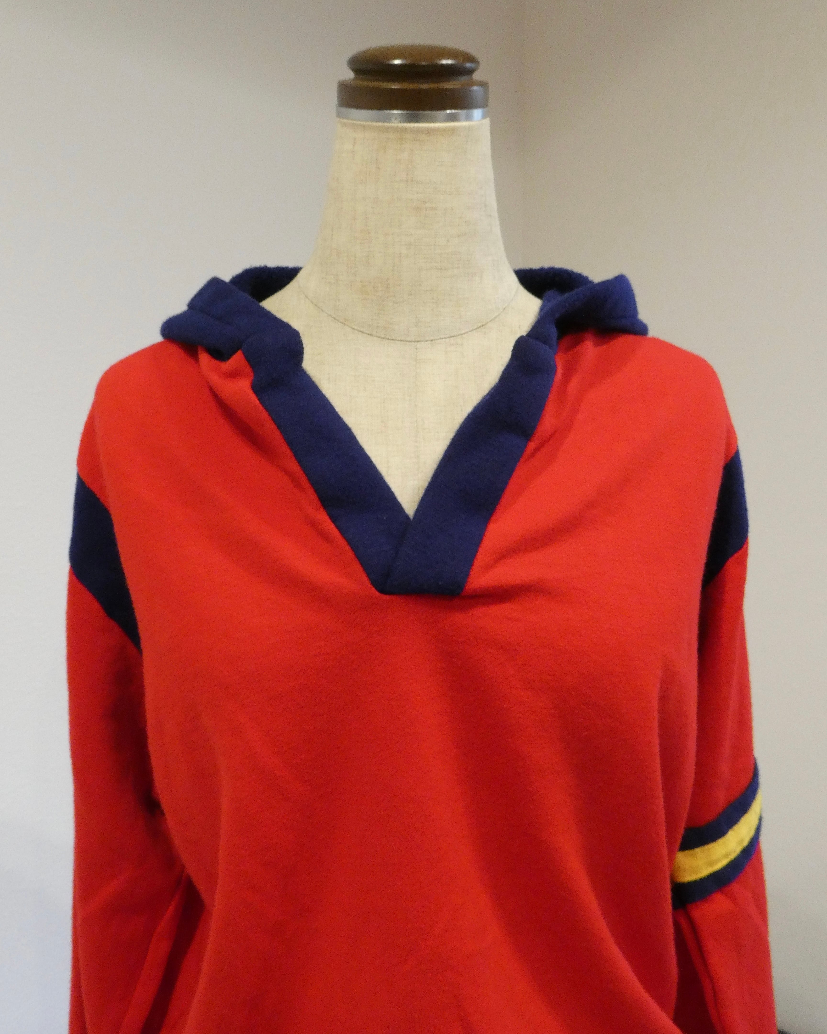 鮮やかなレッドのボディにネイビーのフードと袖のイエローのラインがアクセントになっています。