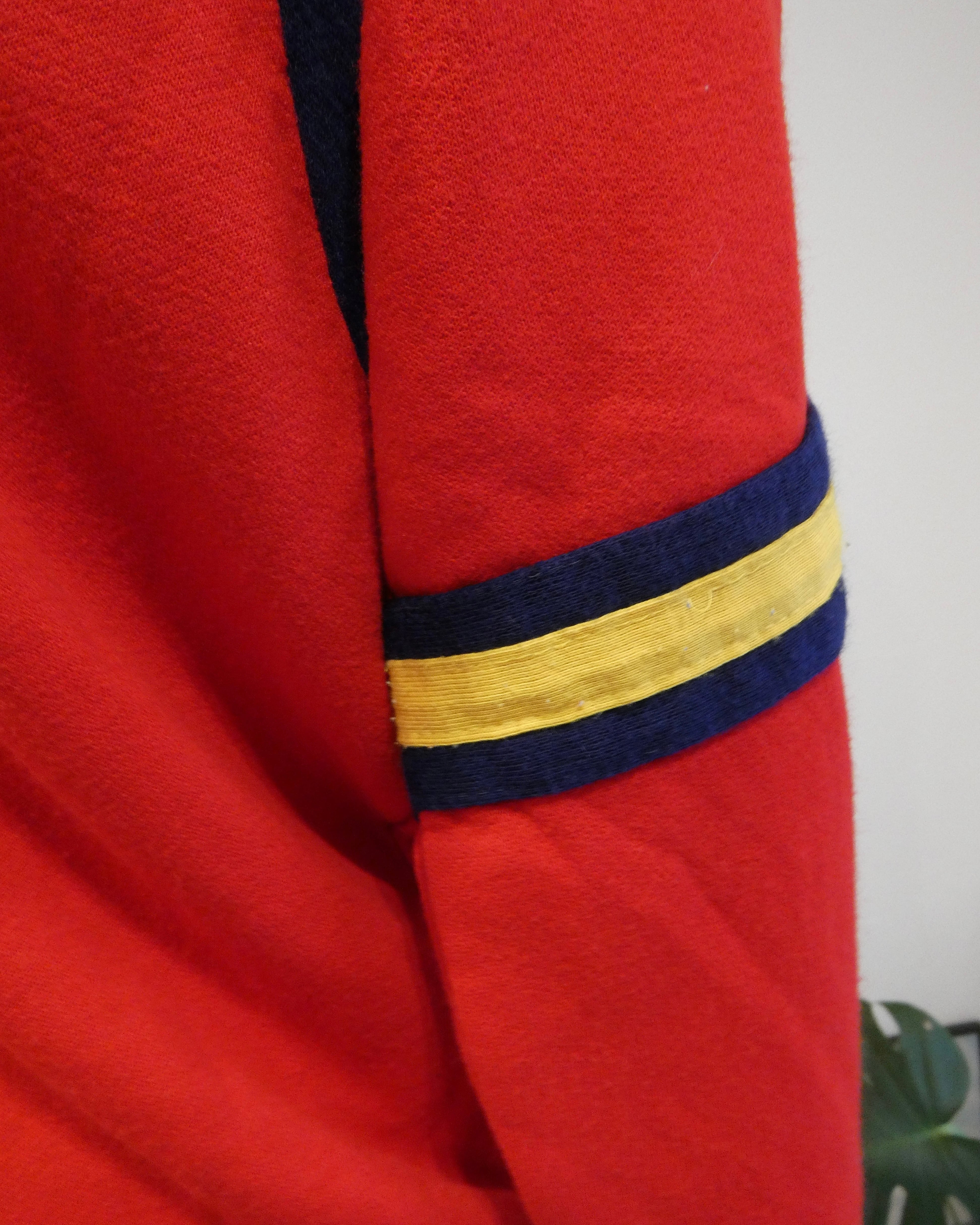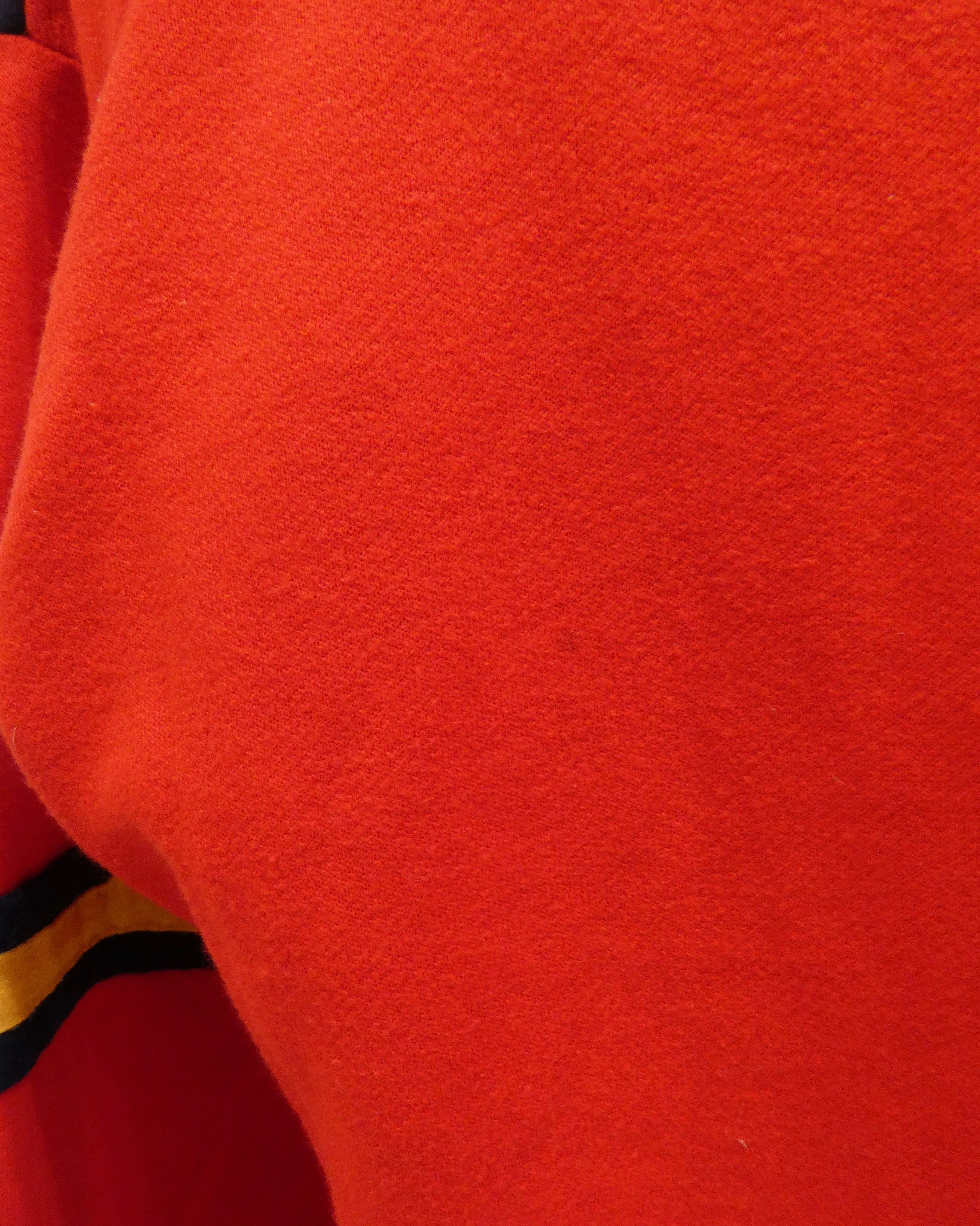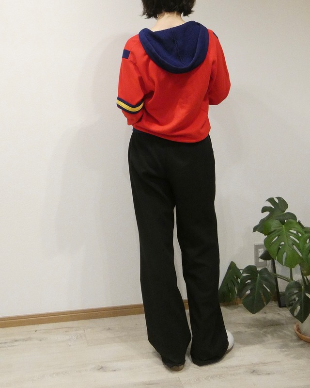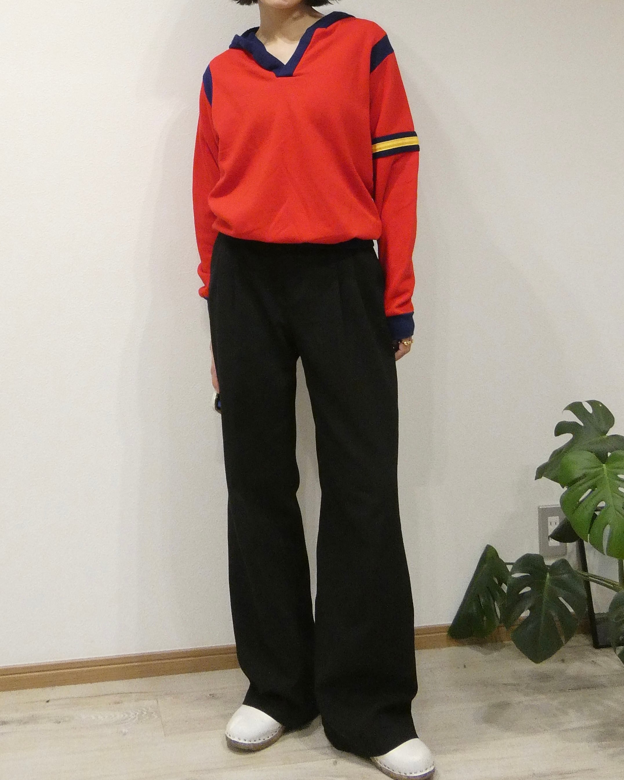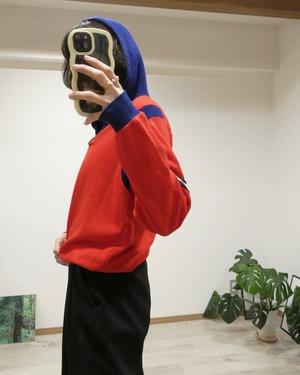鮮やかなレッドのボディにネイビーのフードと袖のイエローのラインがアクセントになっています。