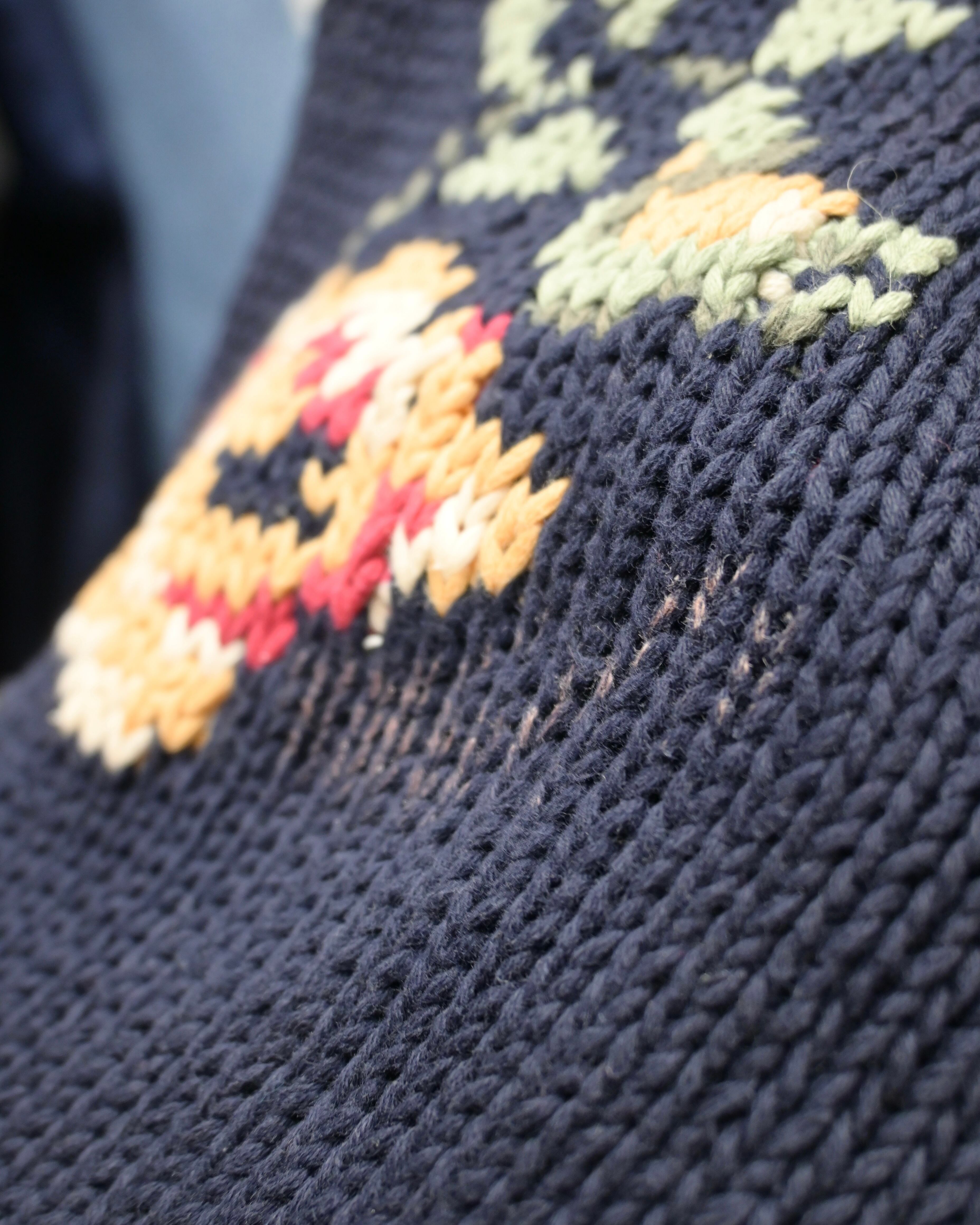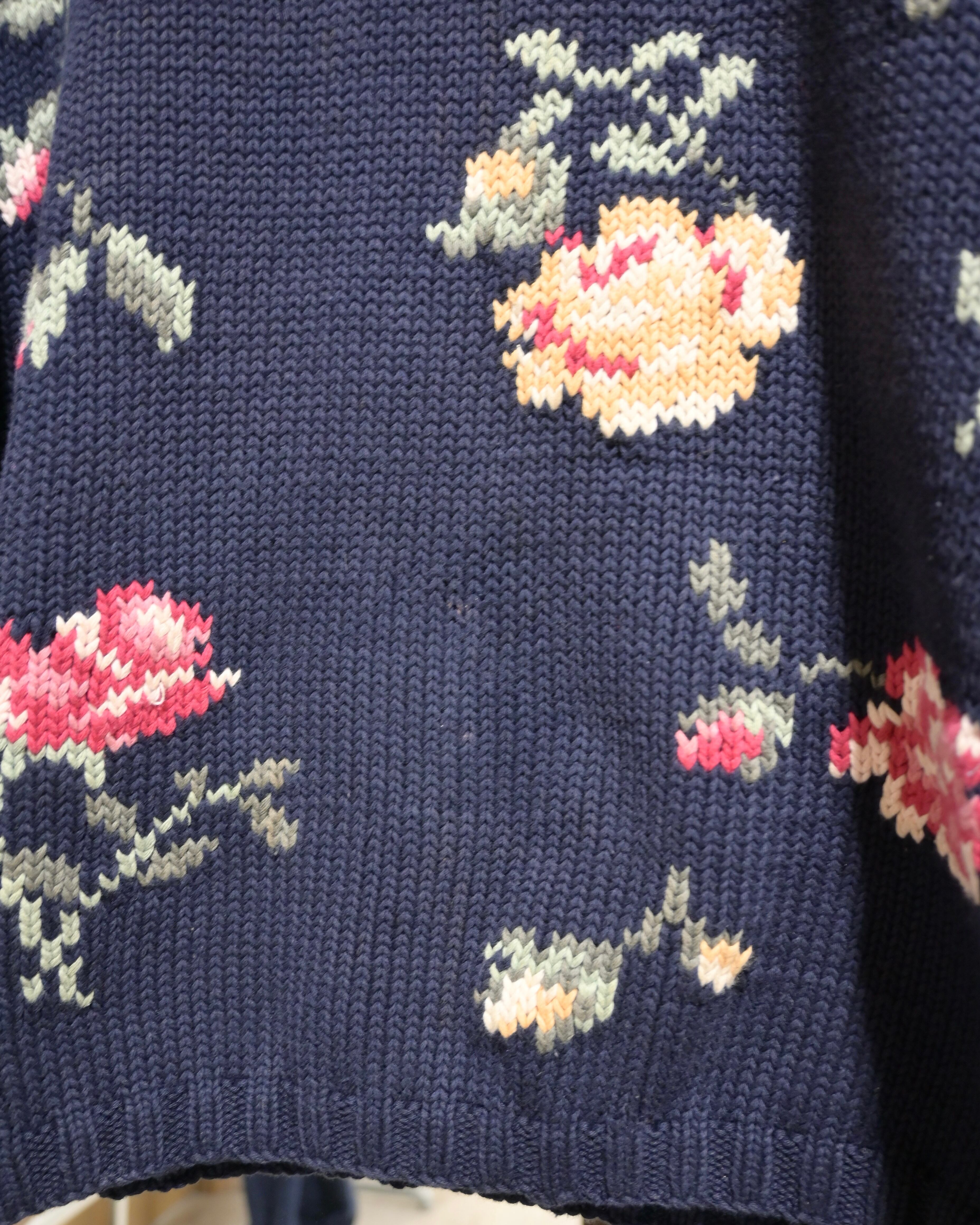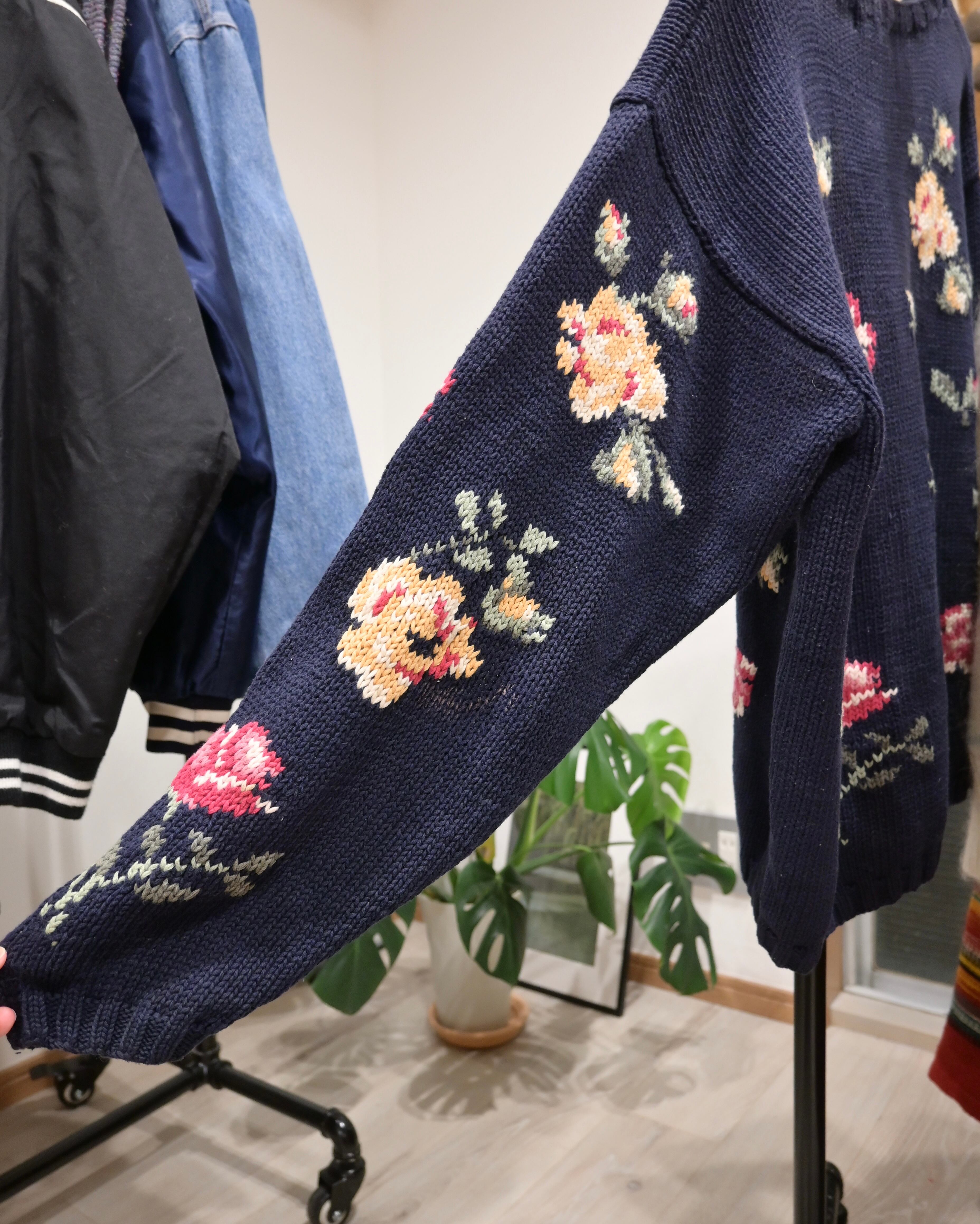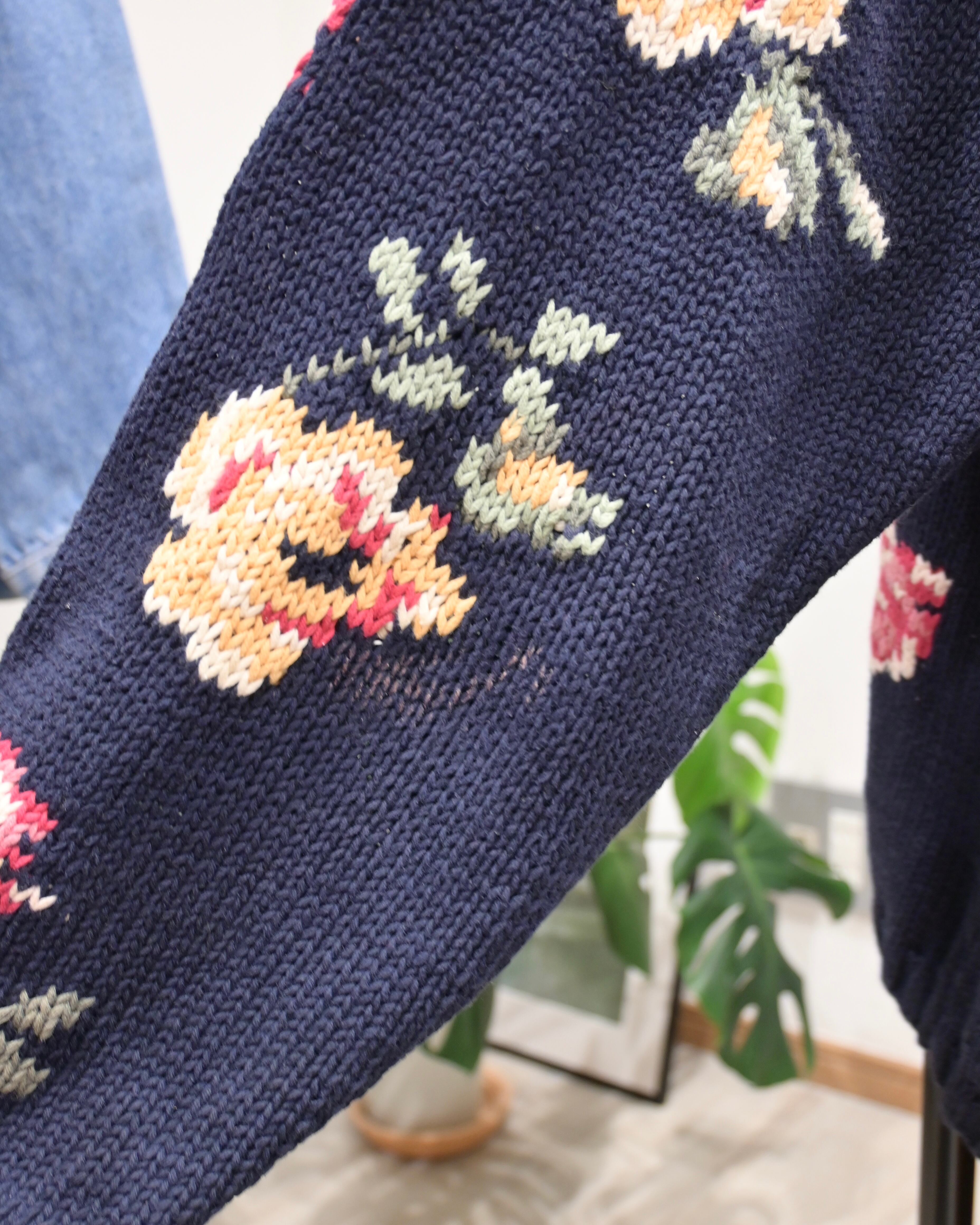深みのあるネイビーをベースに大ぶりのバラが編み込まれたデザインは温かみとカントリー調のクラシックな雰囲気がう一枚です。