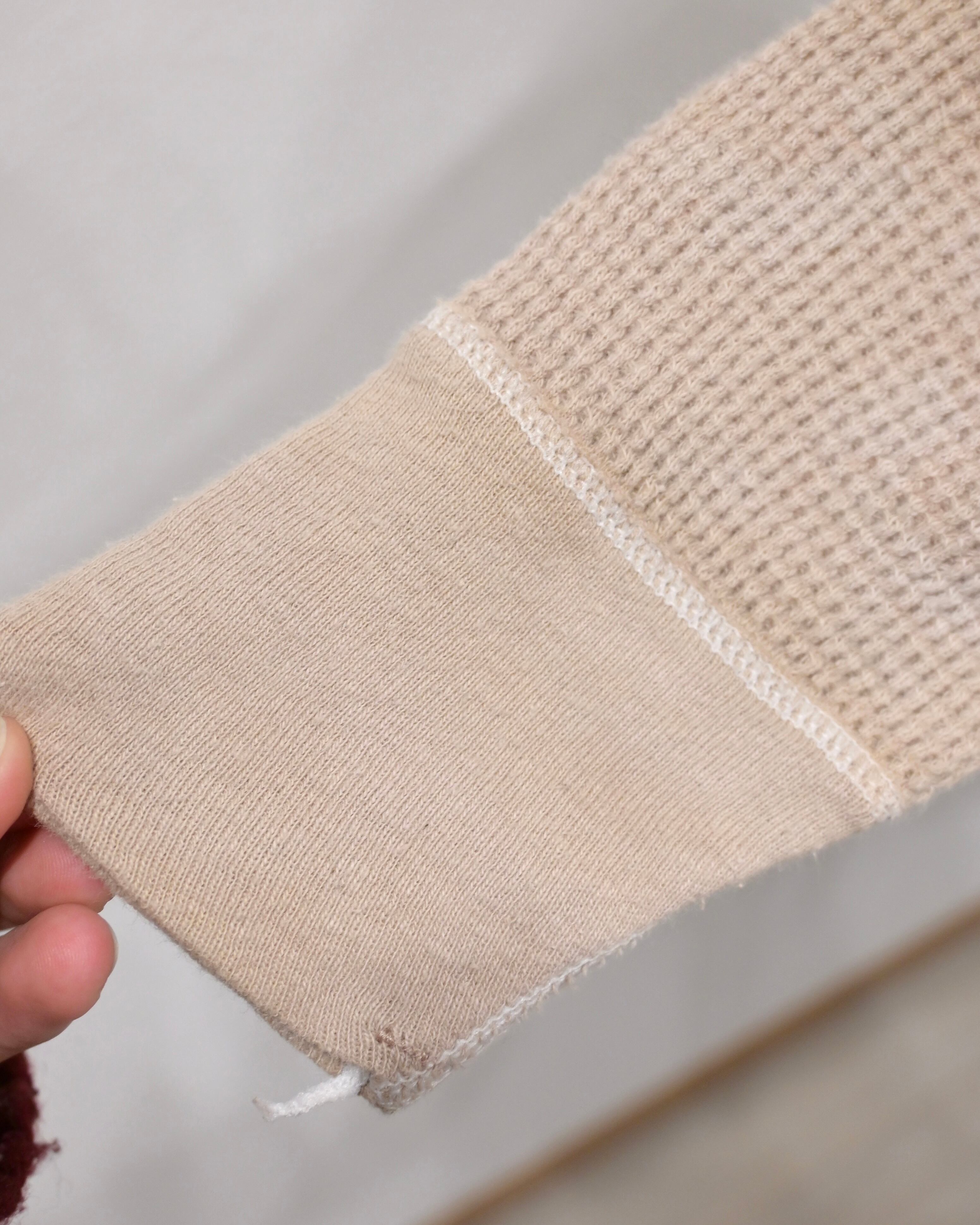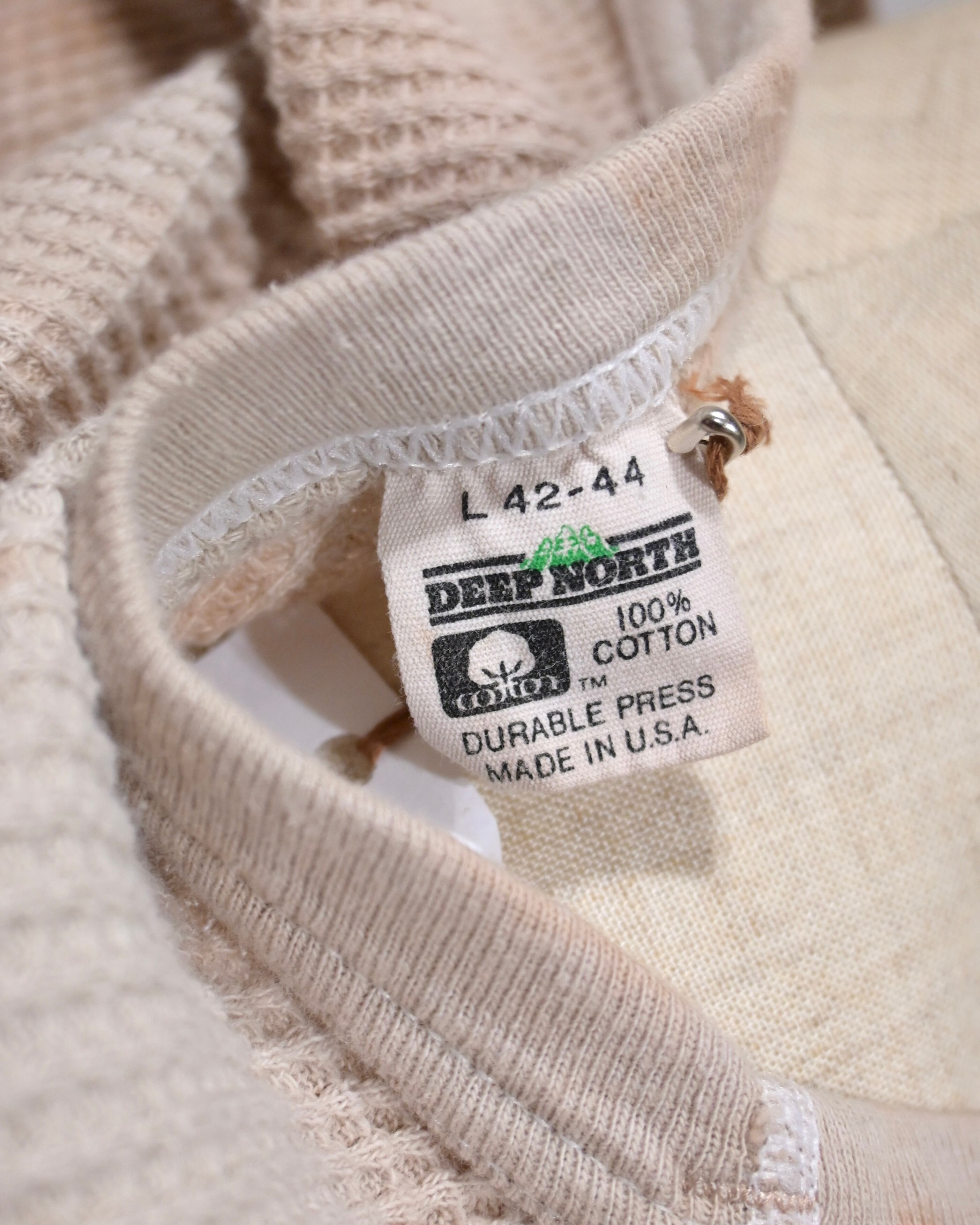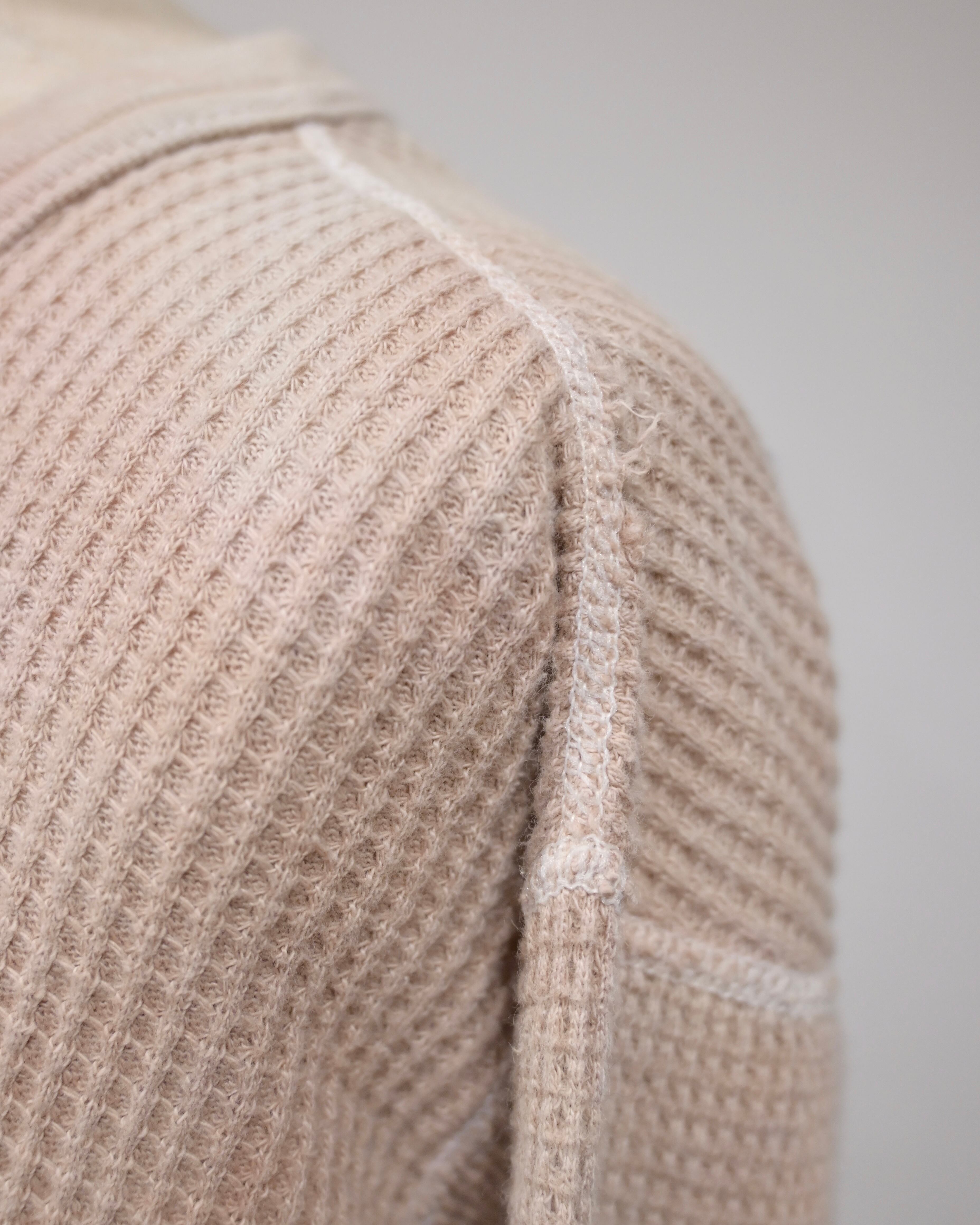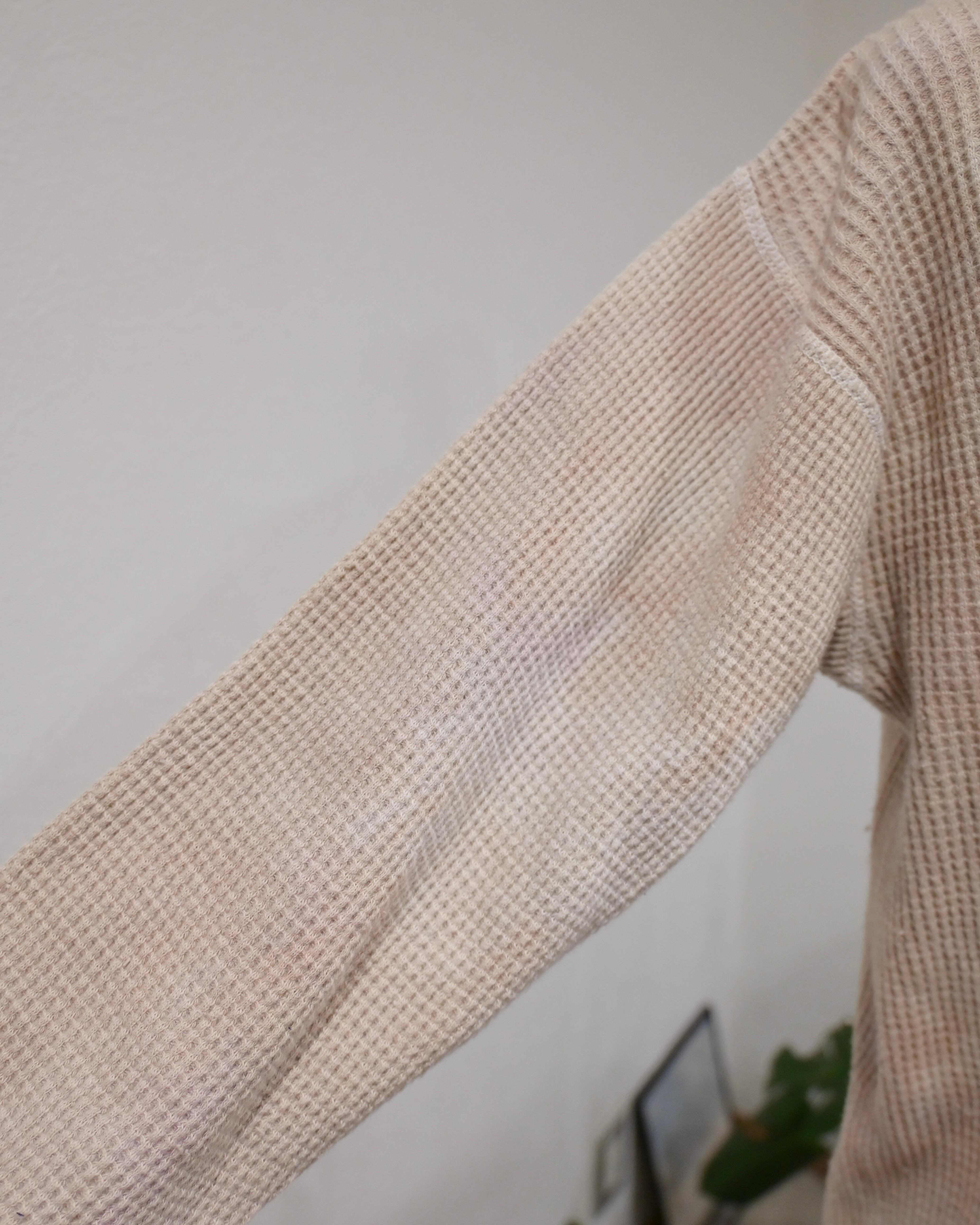 素材はコットンとポリエステルの混紡(50/50)で、ヴィンテージのサーマルらしいワッフル状の凹凸感が特徴です。