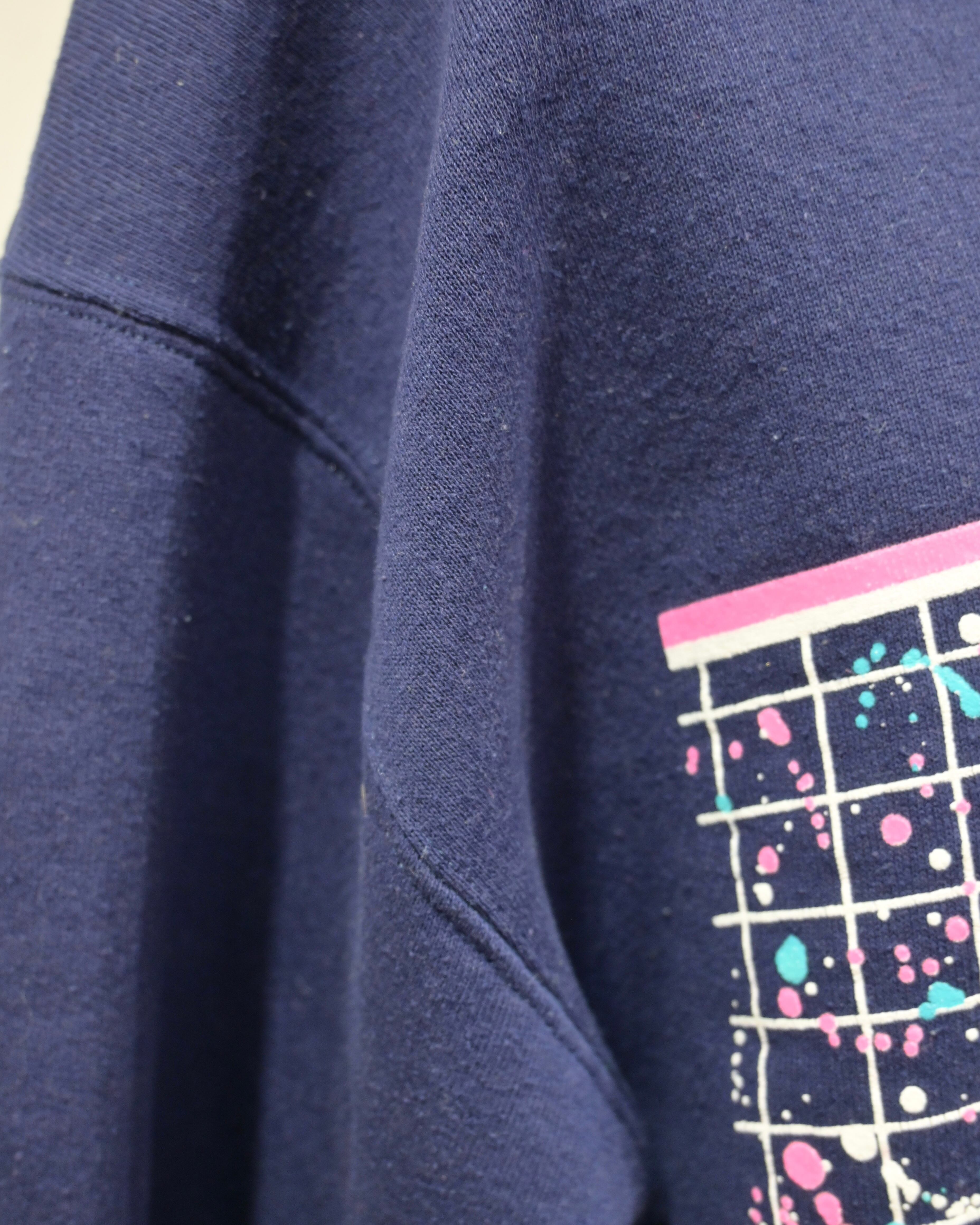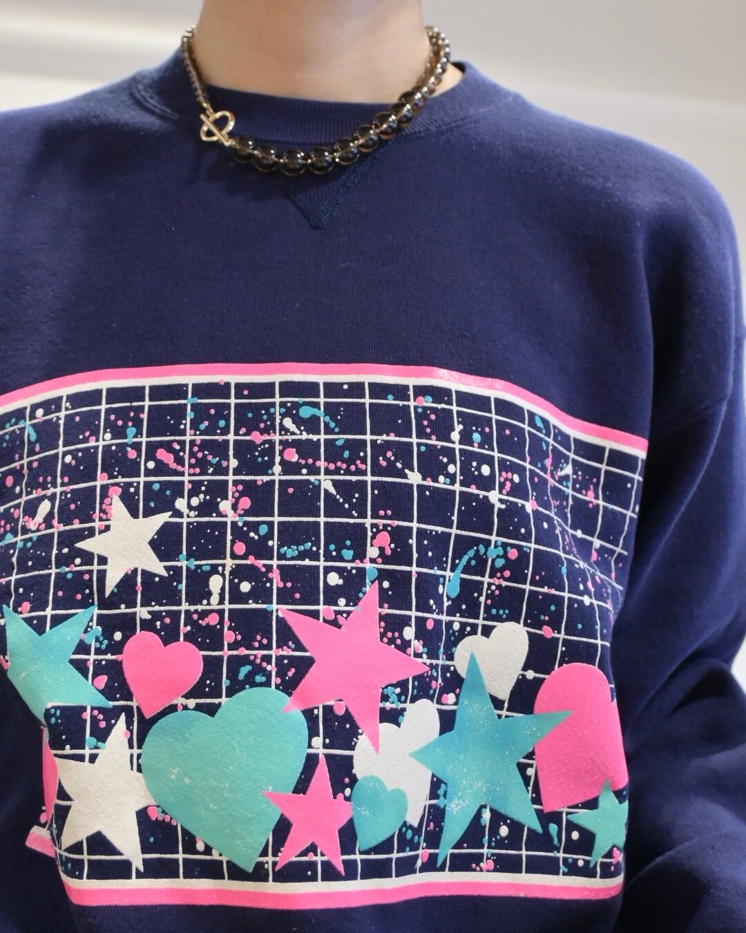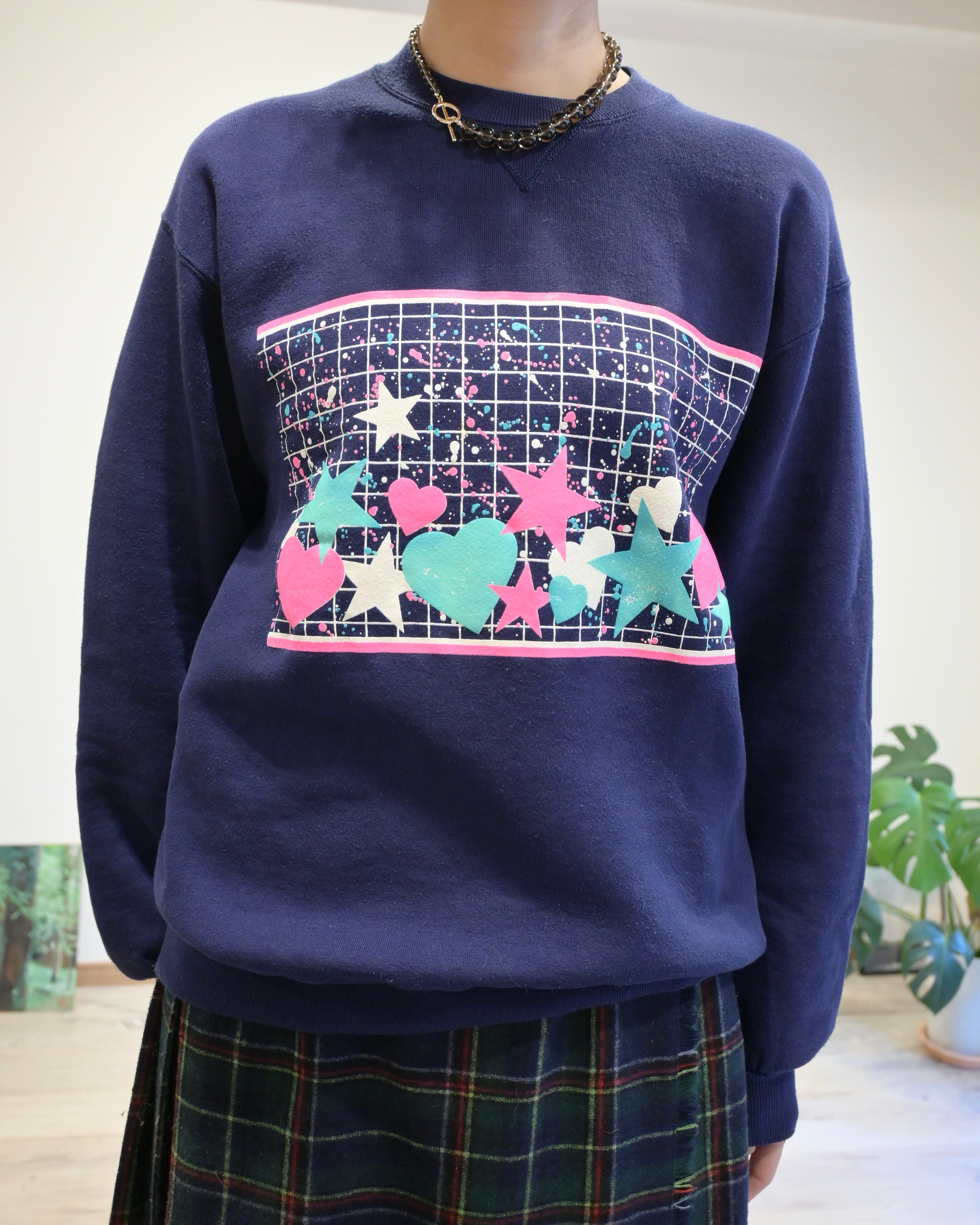 フロントにはブルー、ホワイト、ピンクのグリッドの中に星やハート、ペンキを飛ばしたようなグラフィック