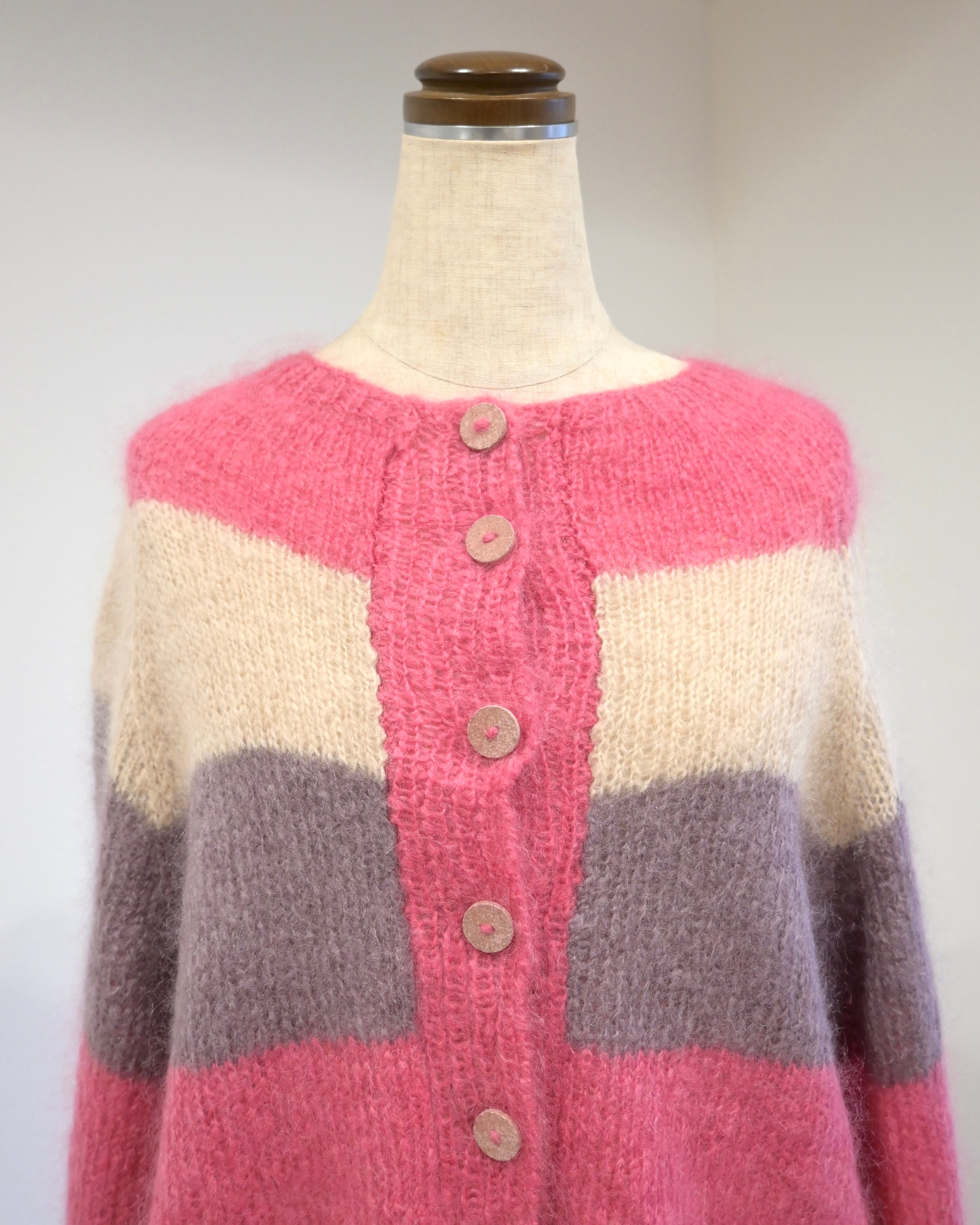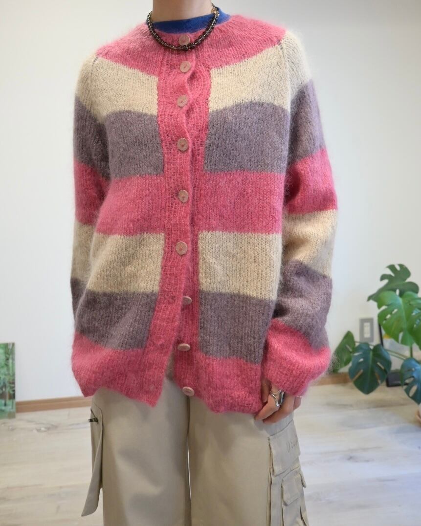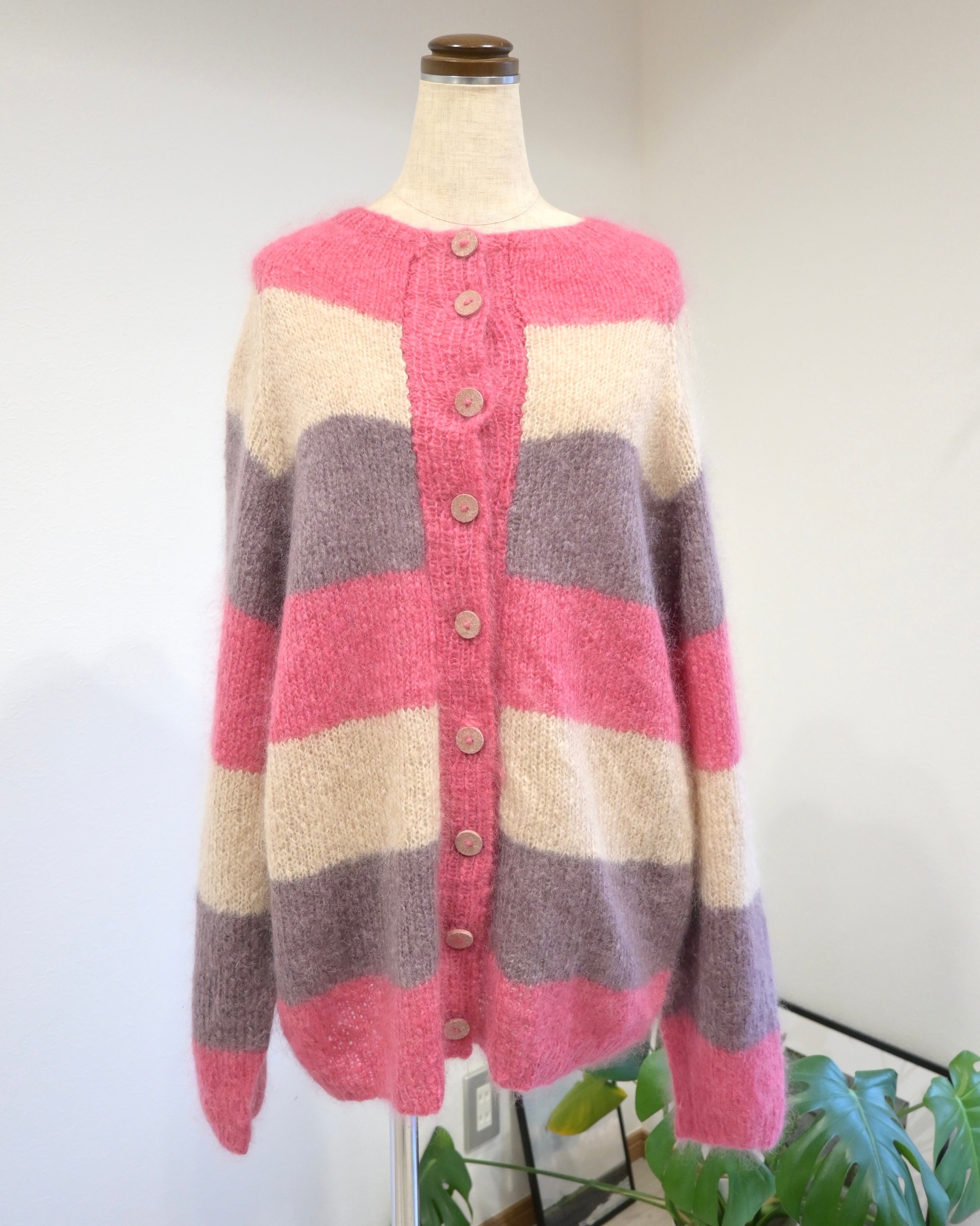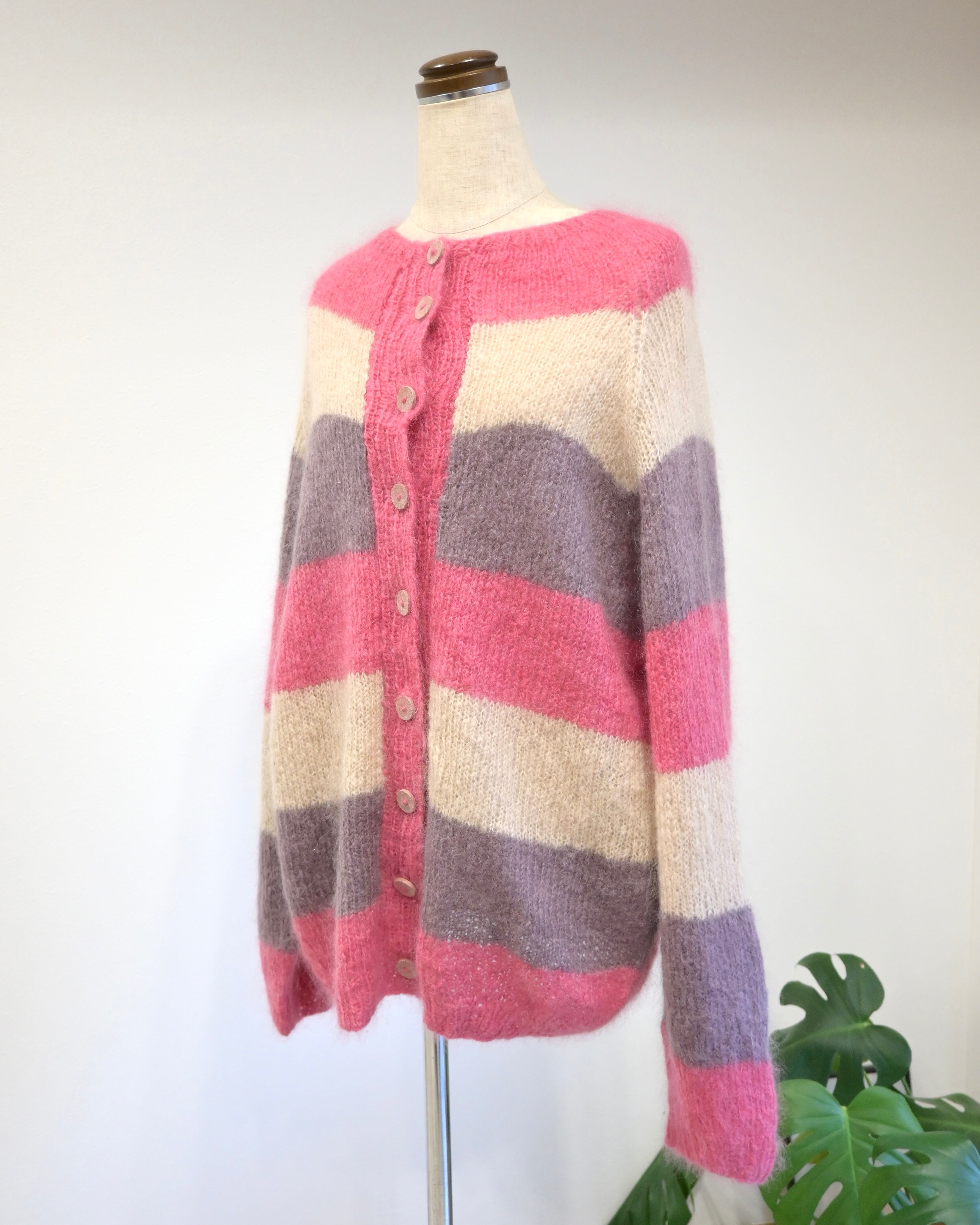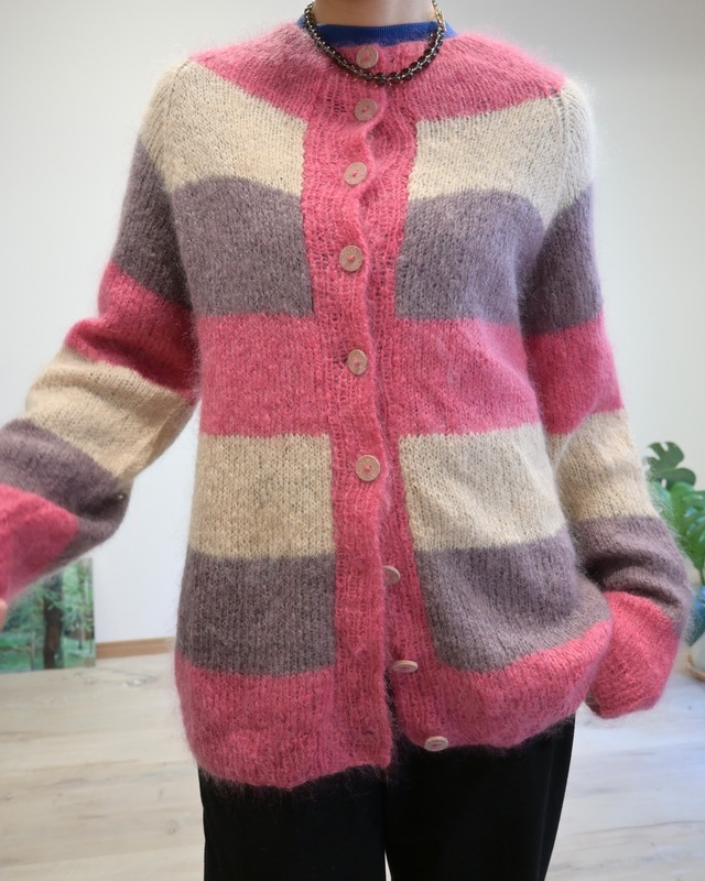 ピンク、ベージュ、パープルのボーダーカーディガン。