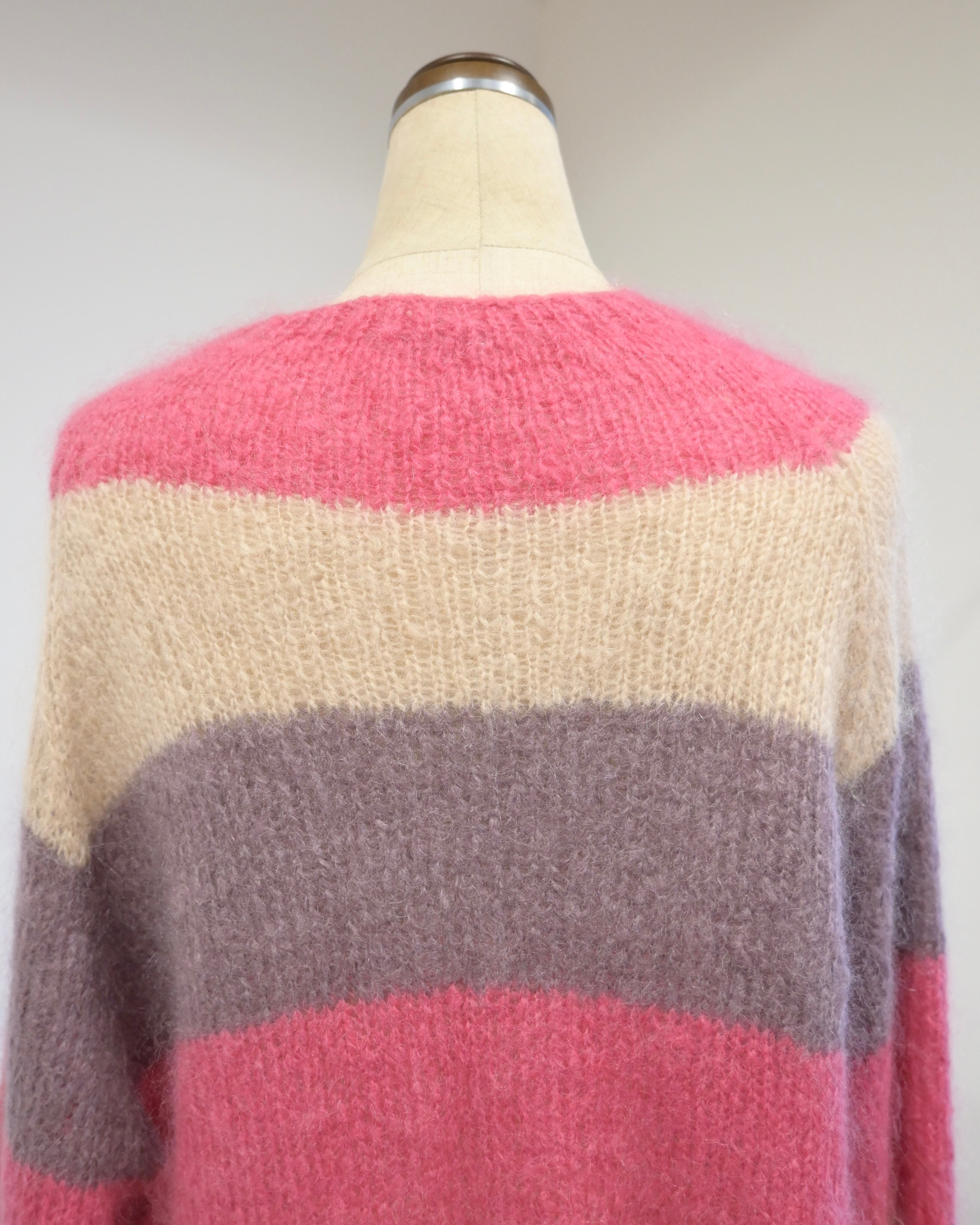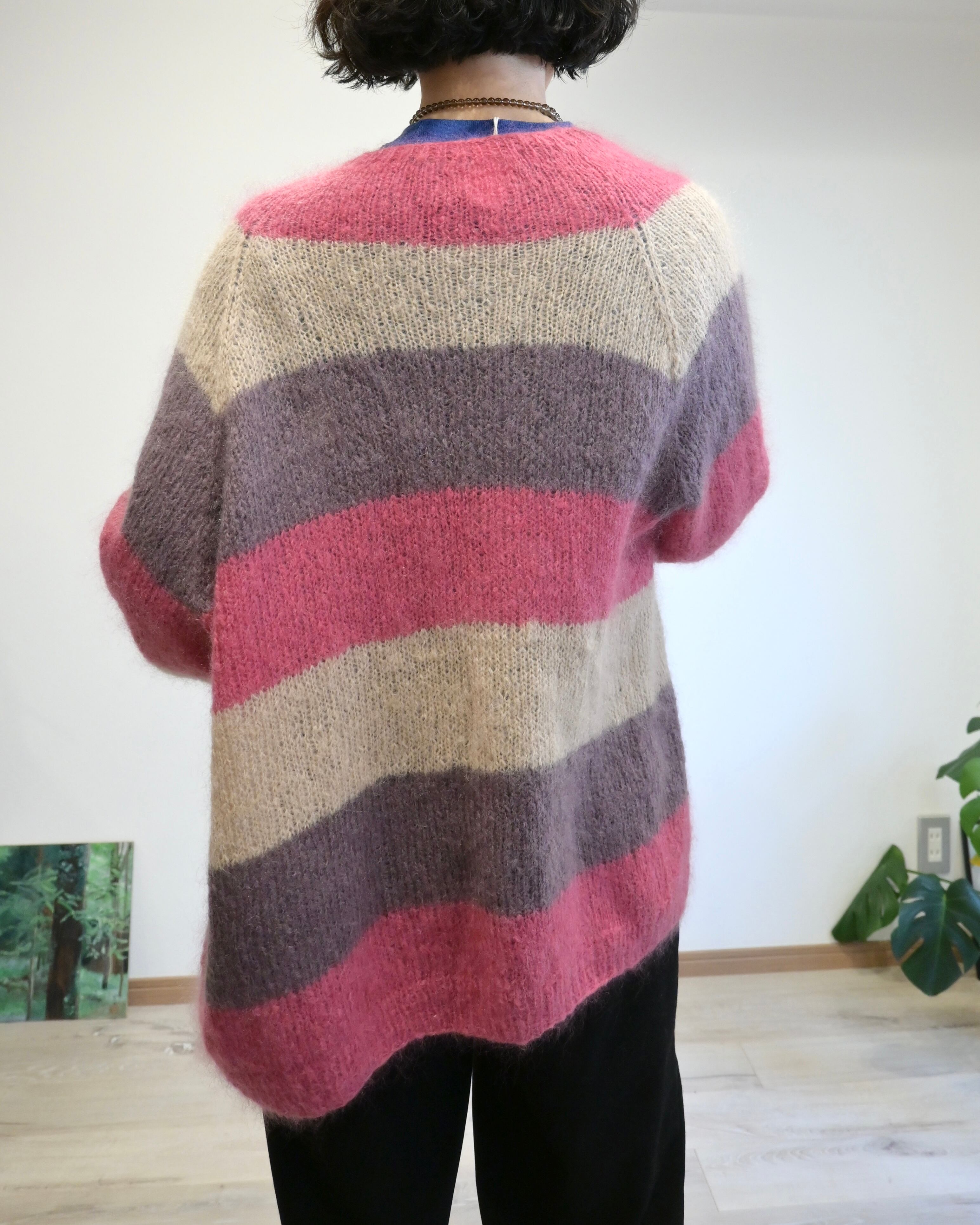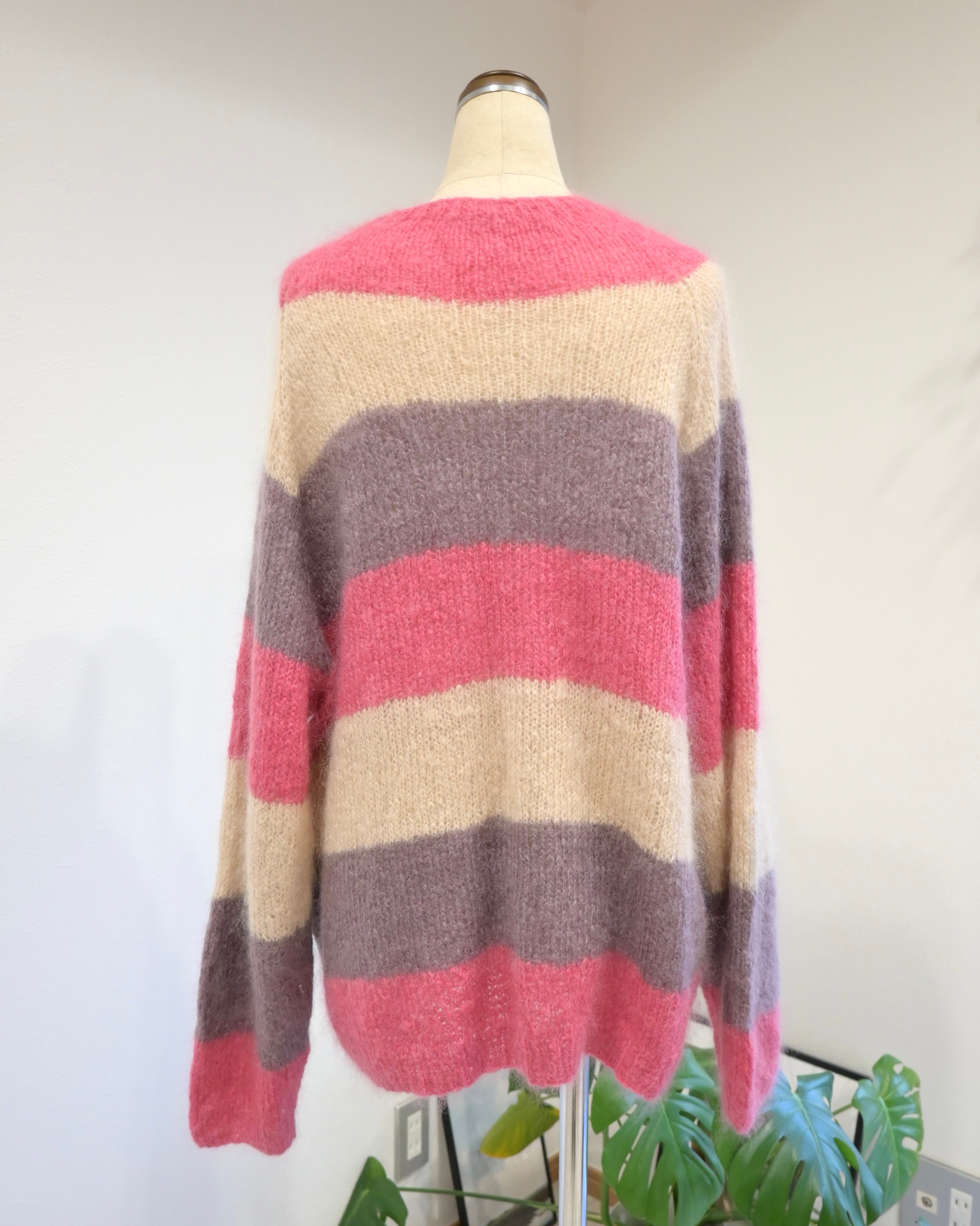 ピンク、ベージュ、パープルのボーダーカーディガン。