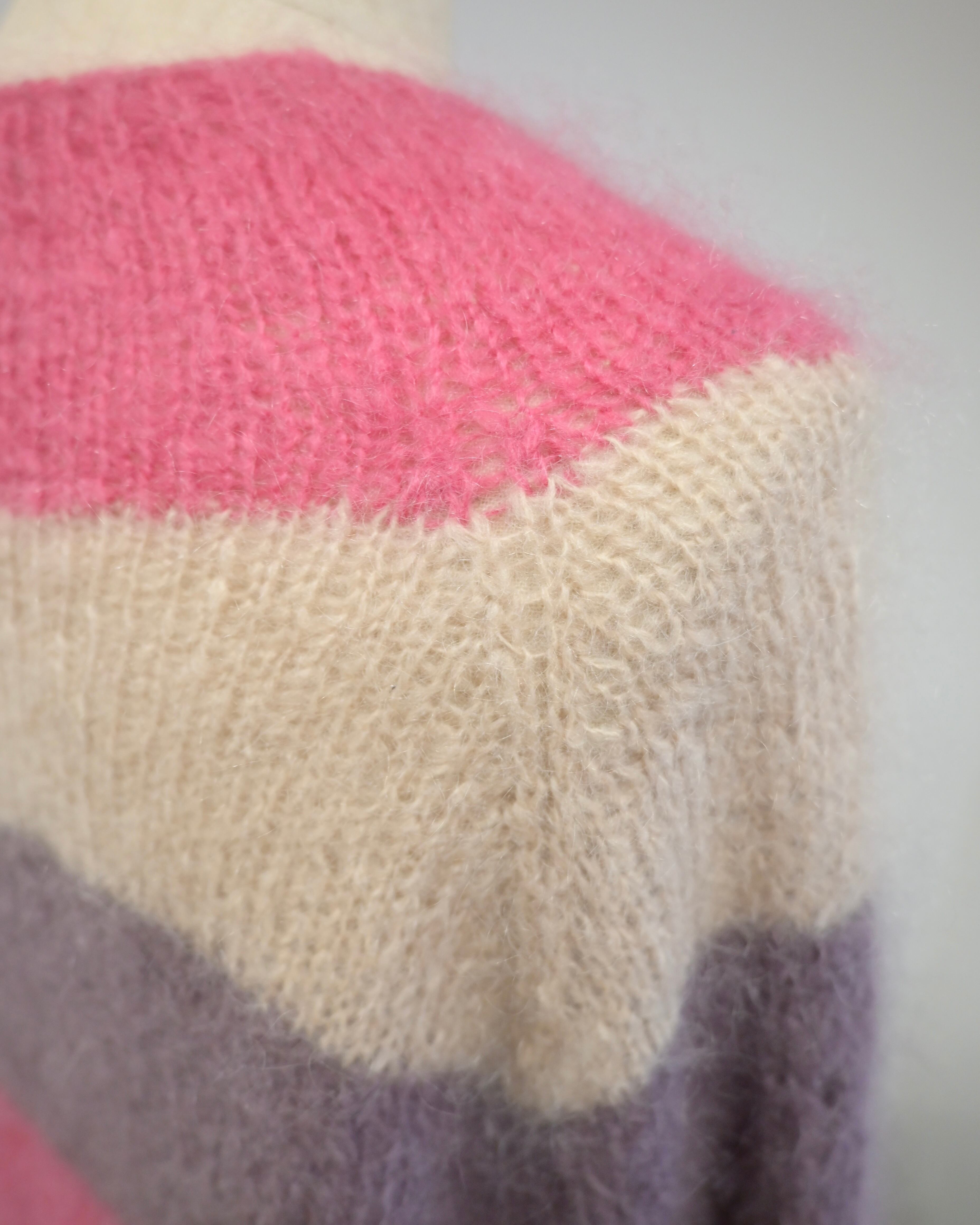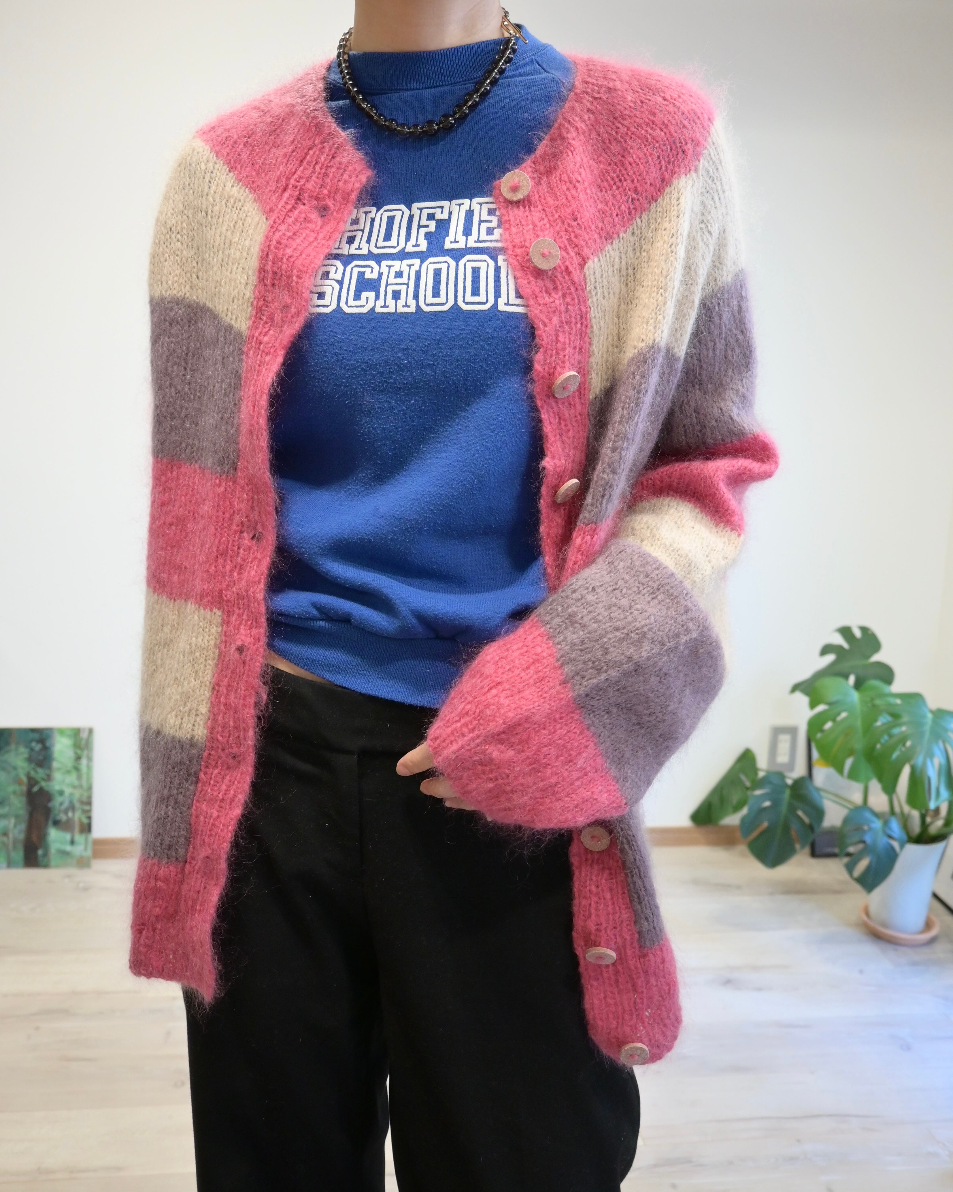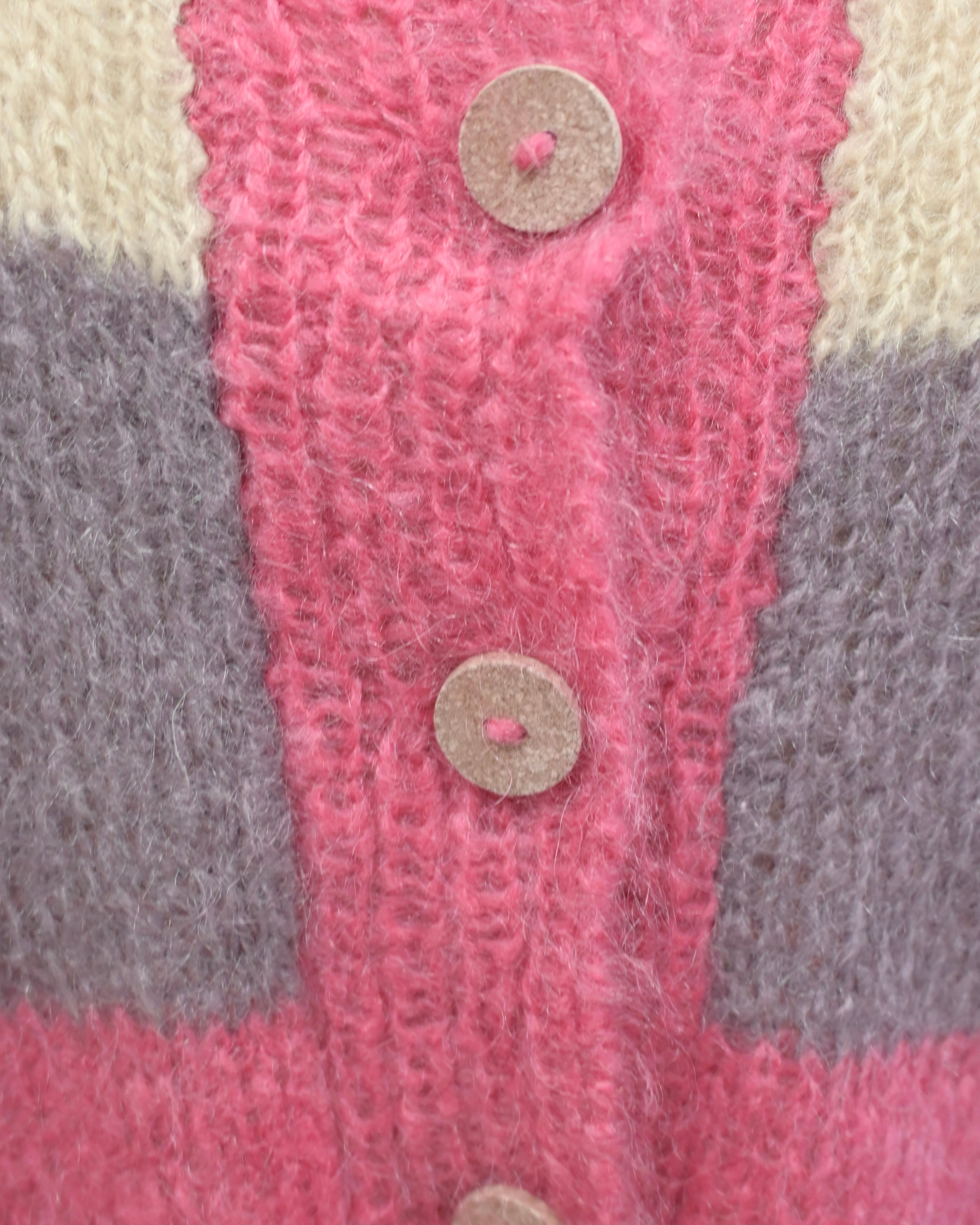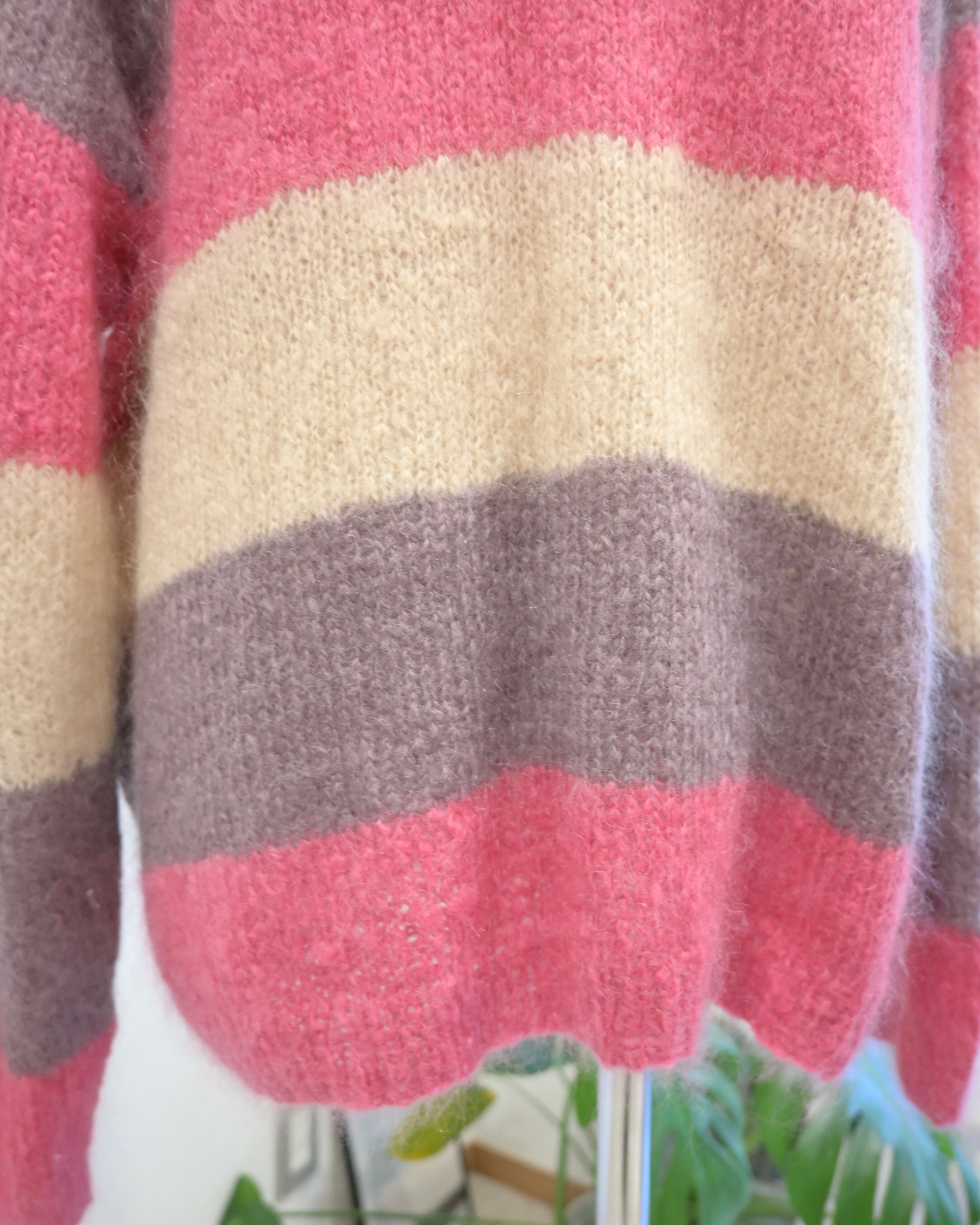 ピンク、ベージュ、パープルのボーダーカーディガン。