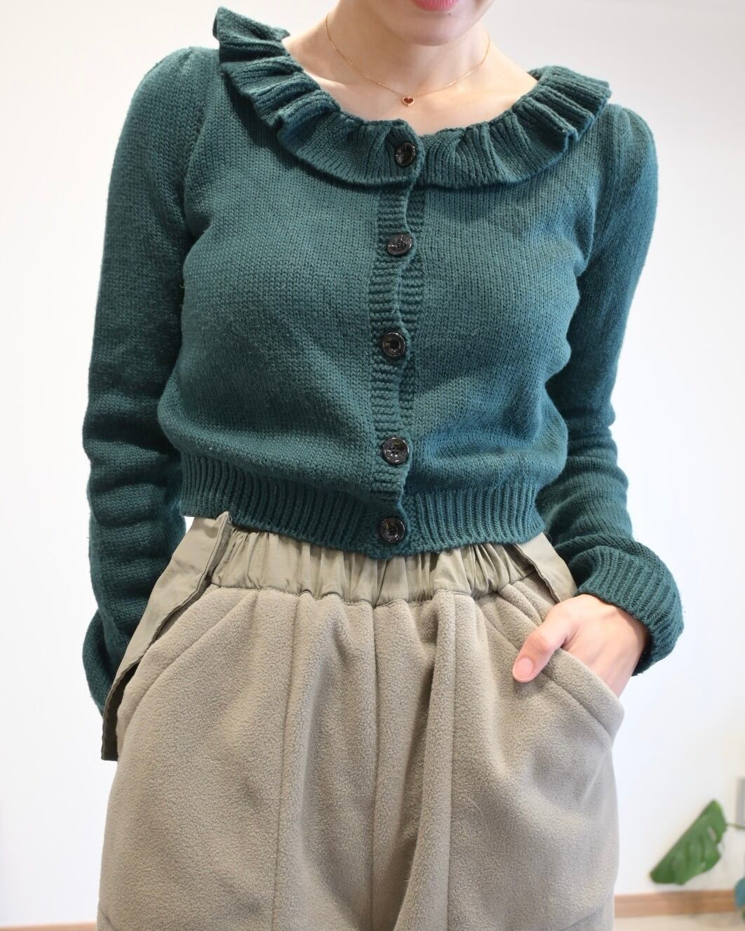 コンパクトなショート丈でハイウエストのボトムやワンピースとの相性も良いです。