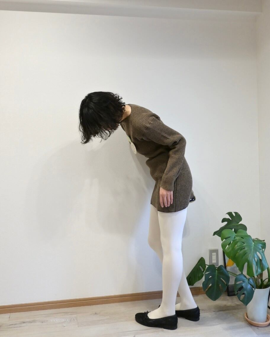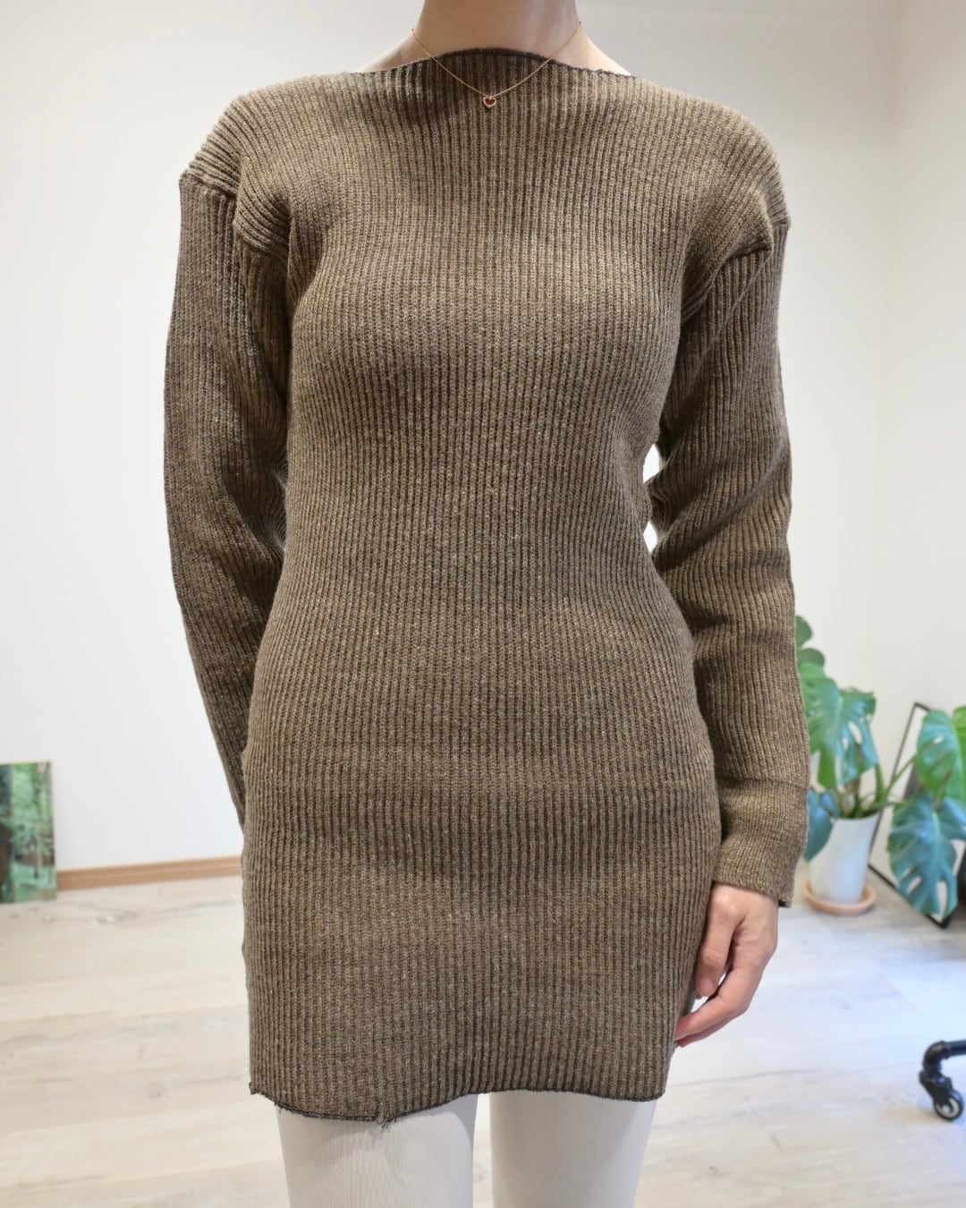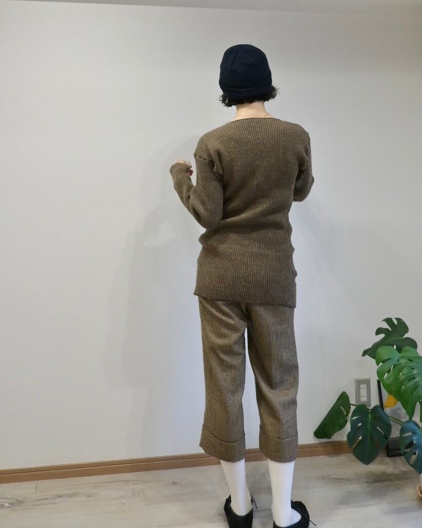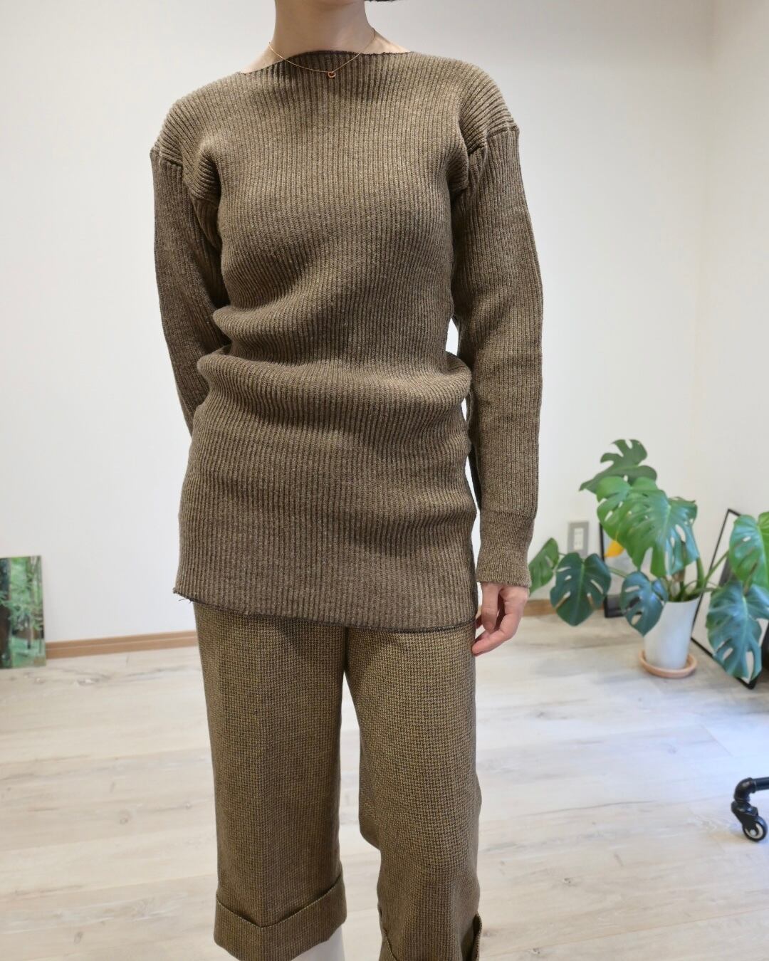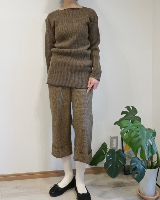 ブラウンのリブはからだにフィットするタイトながら、伸縮性もあるのでストレスのない着心地です。