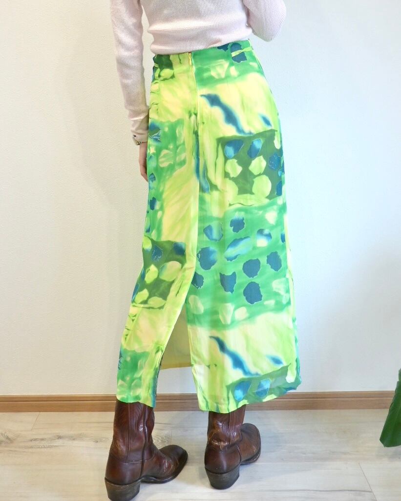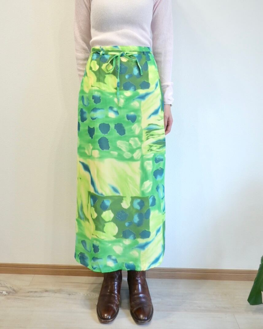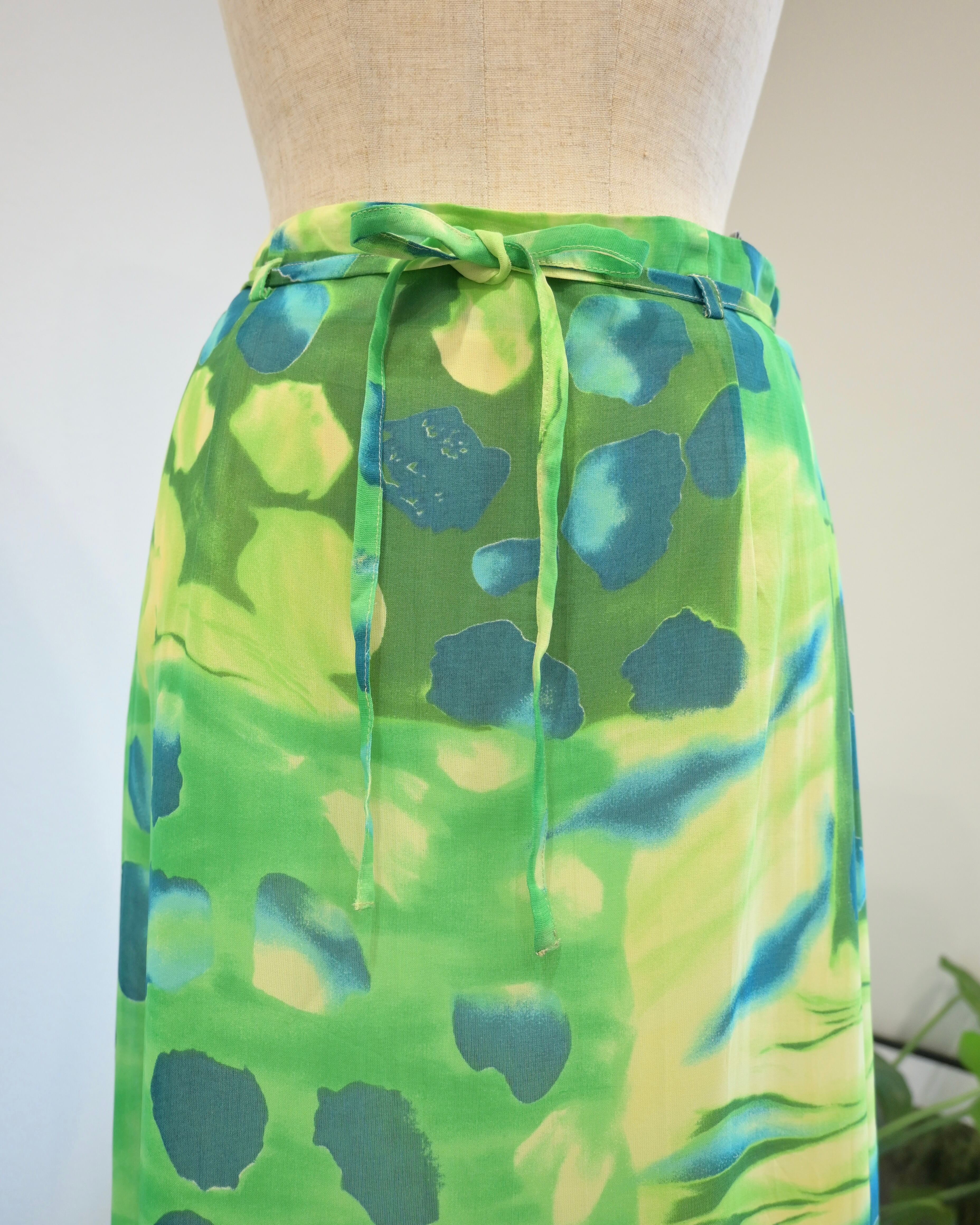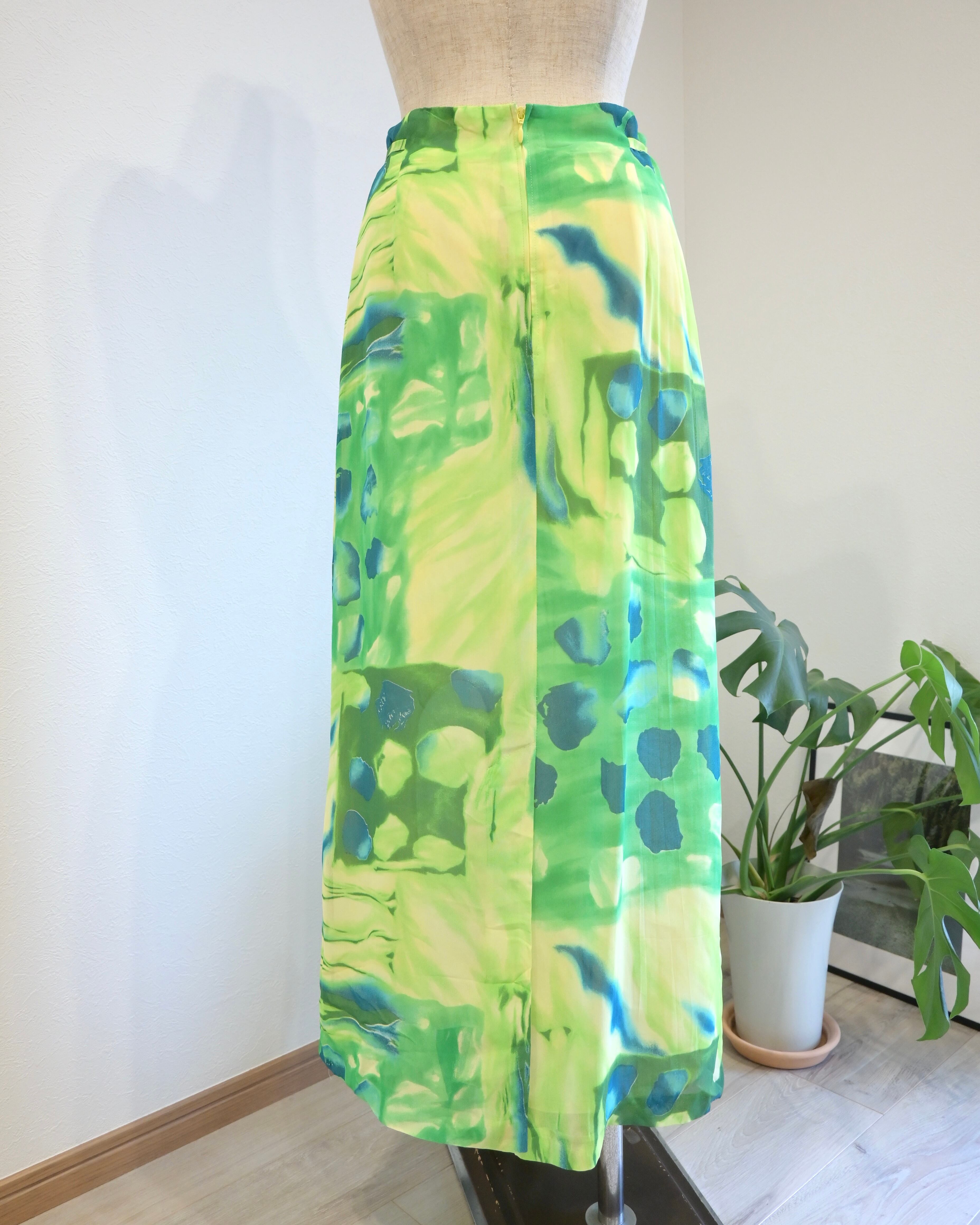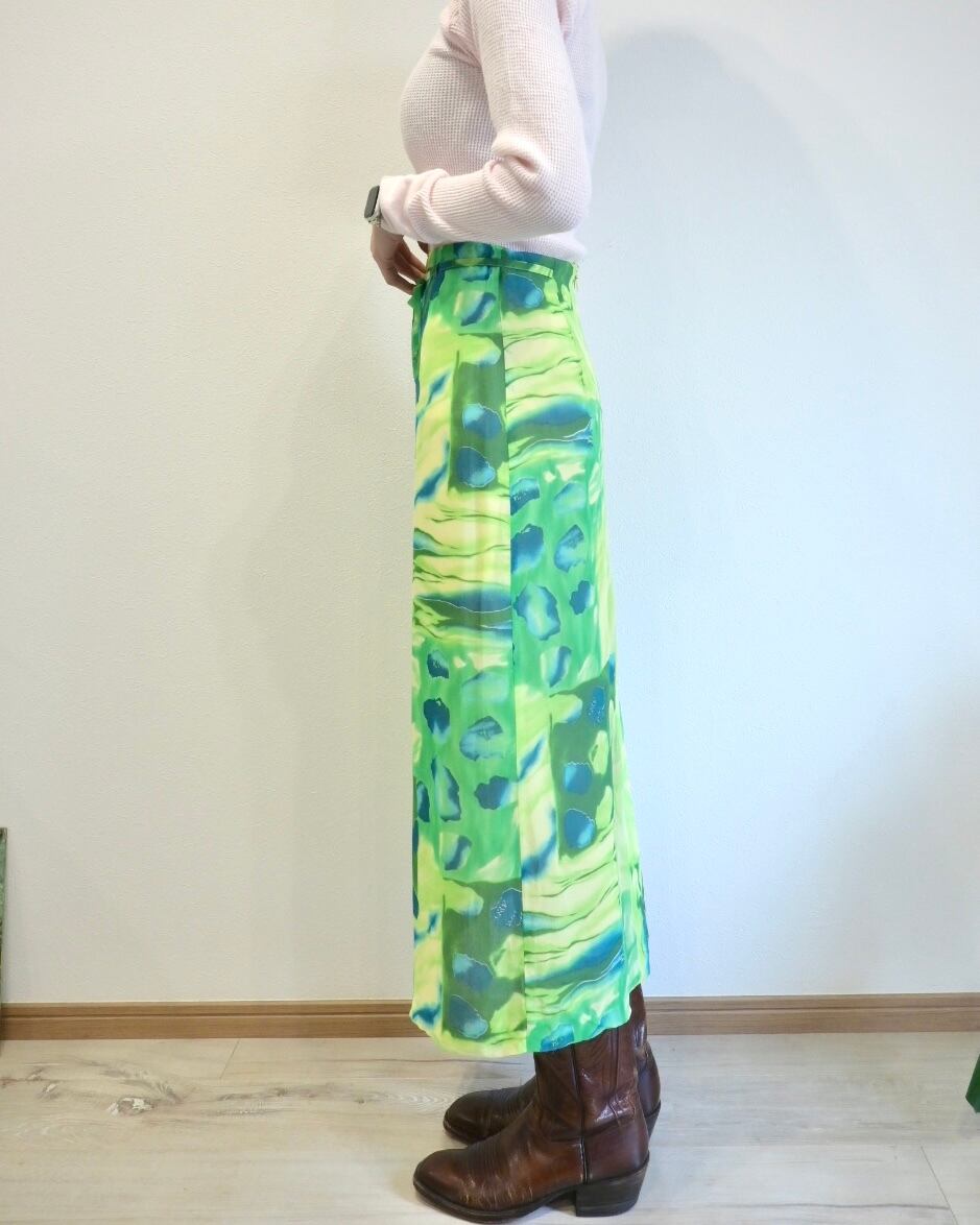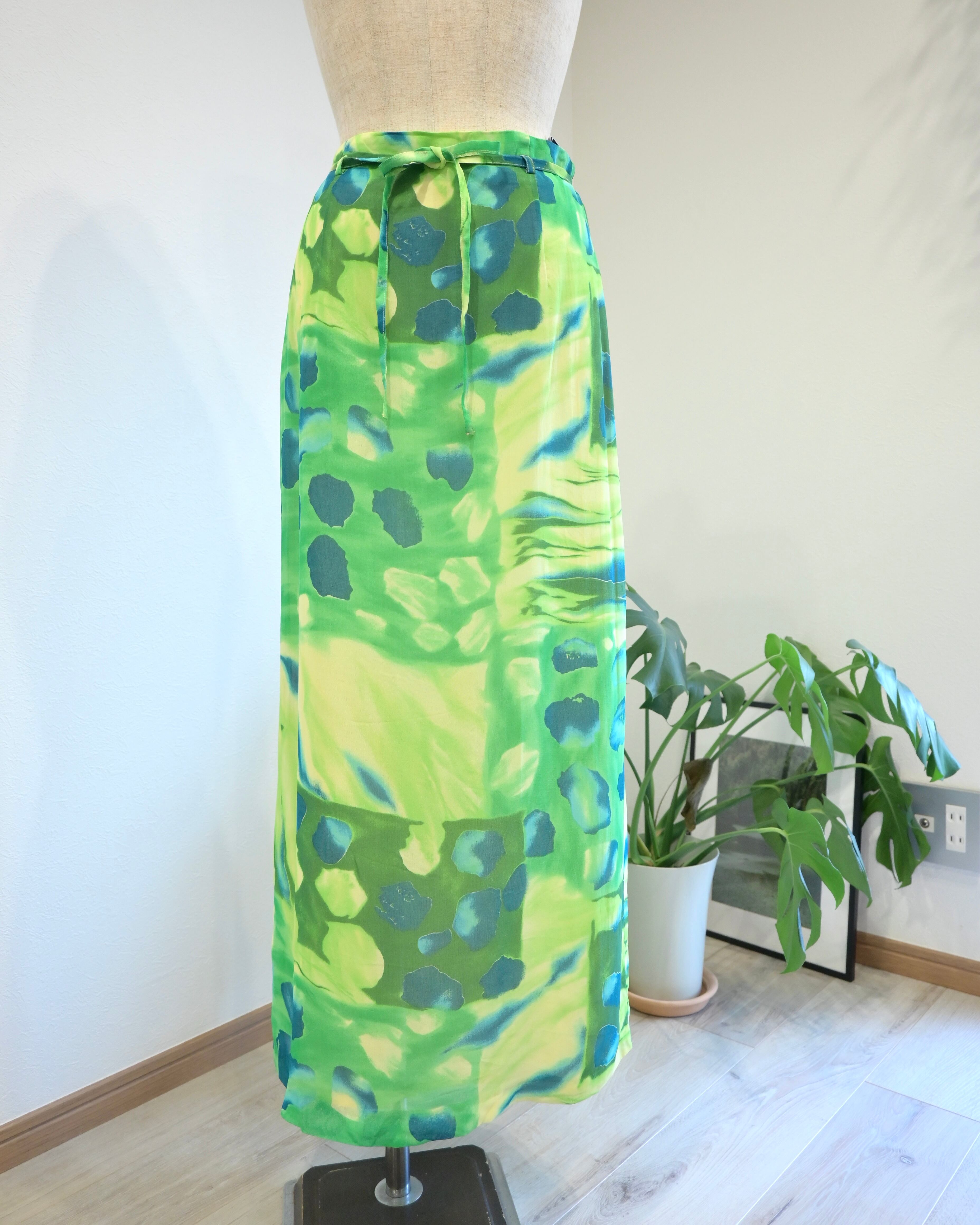 シアー感のあるグリーン、ブルー、イエローのさわやかなカラーのスカート。