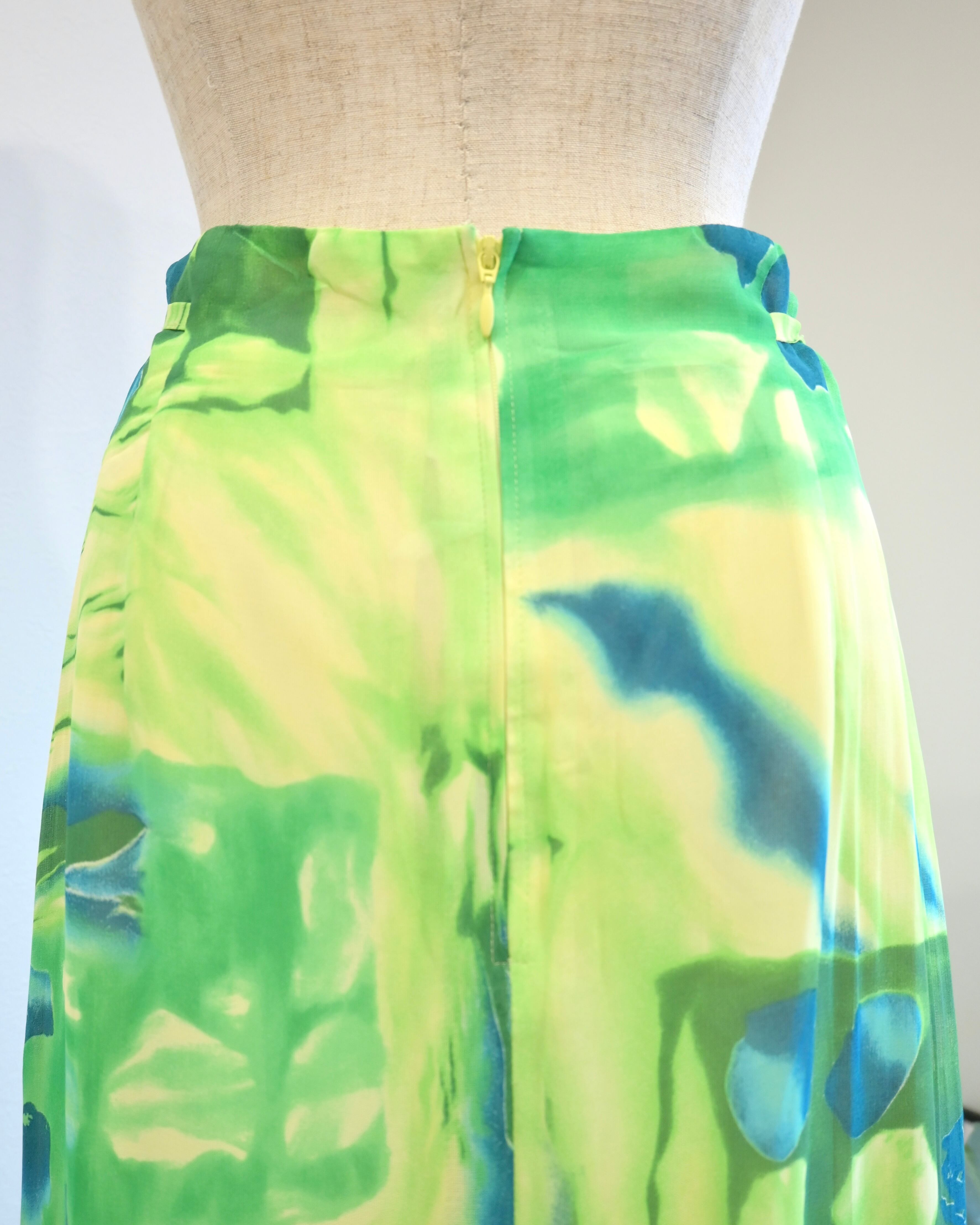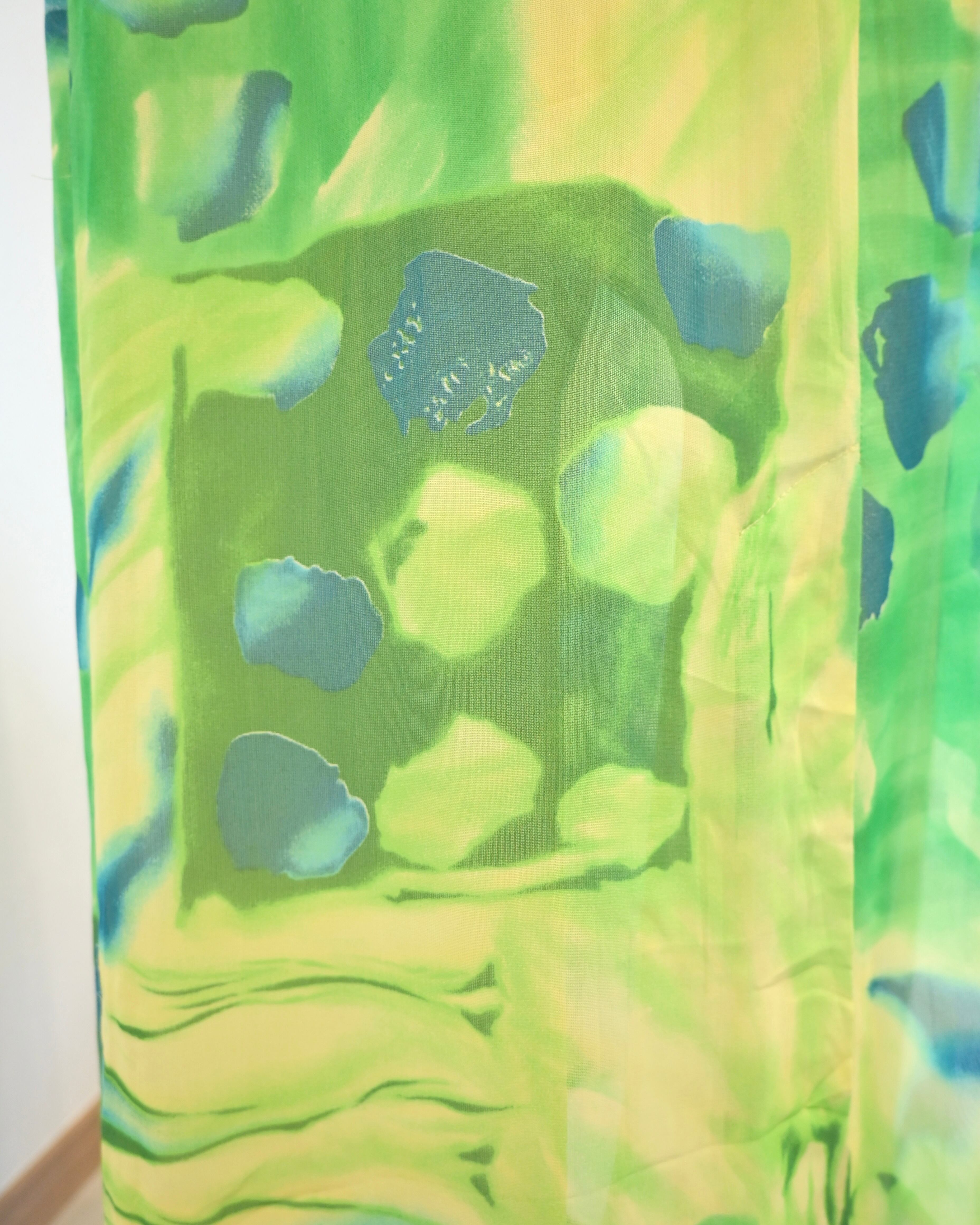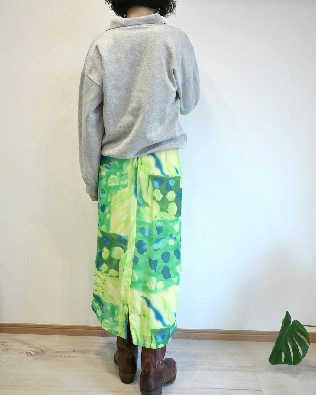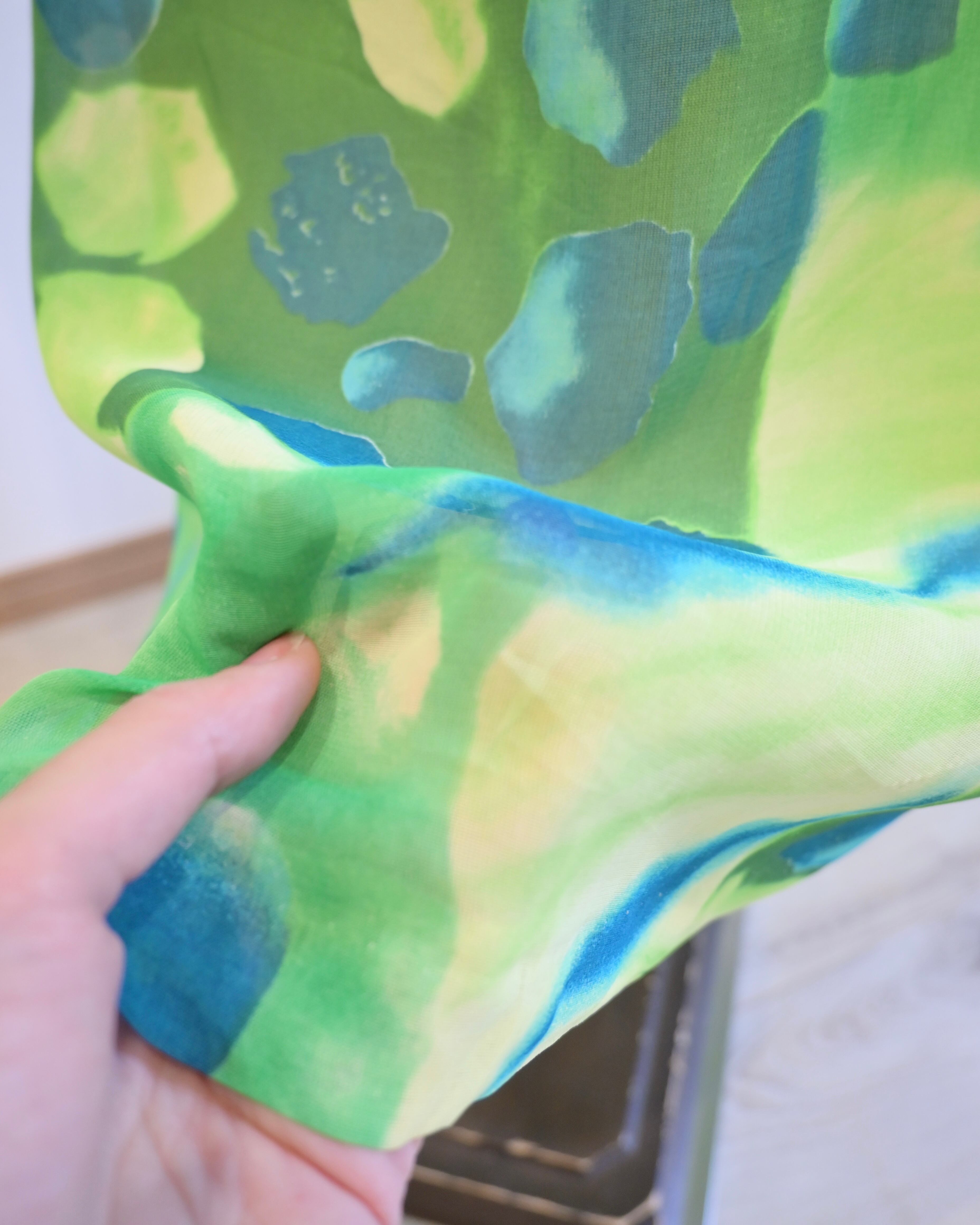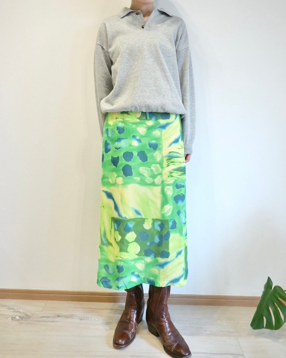 シアー感のあるグリーン、ブルー、イエローのさわやかなカラーのスカート。