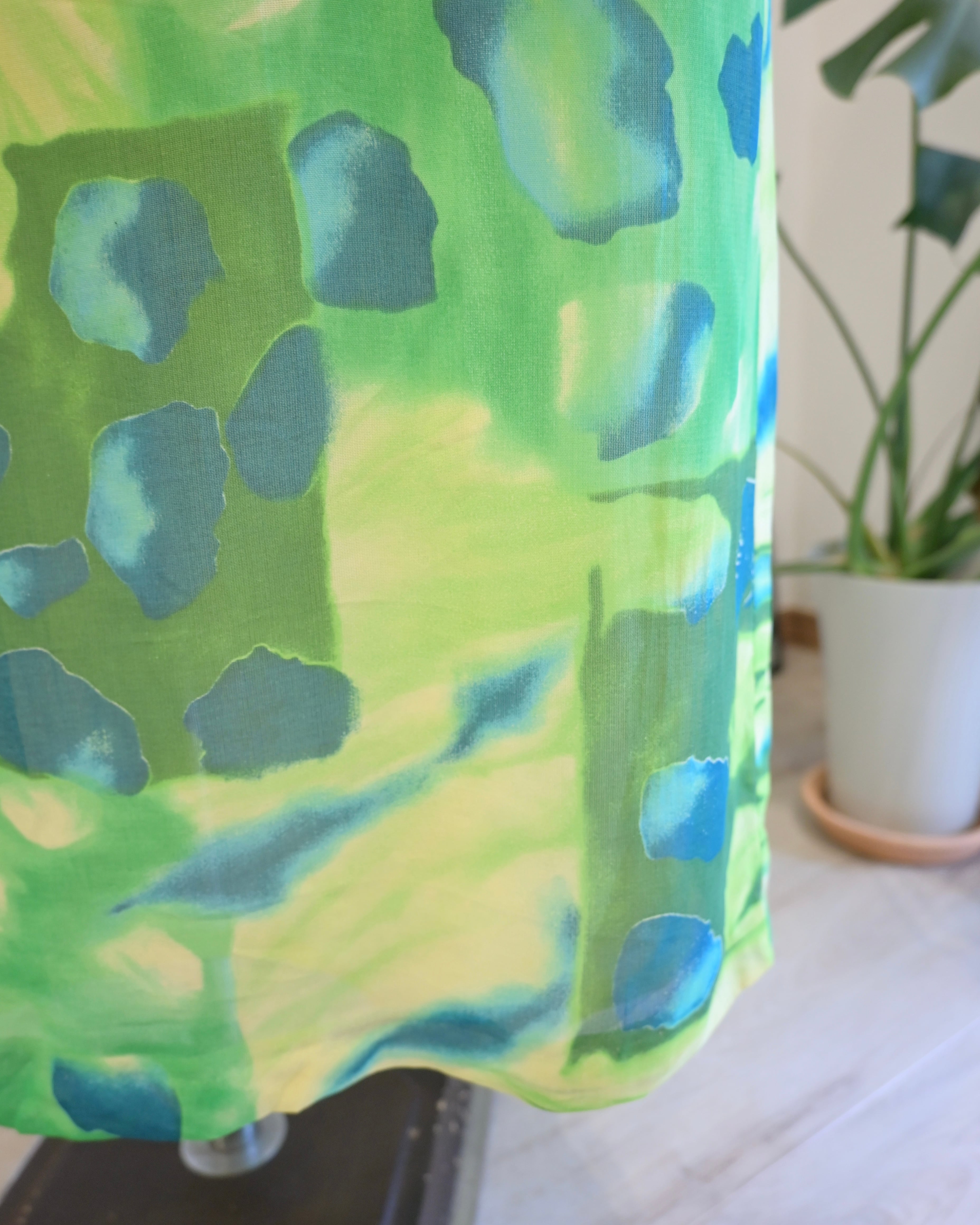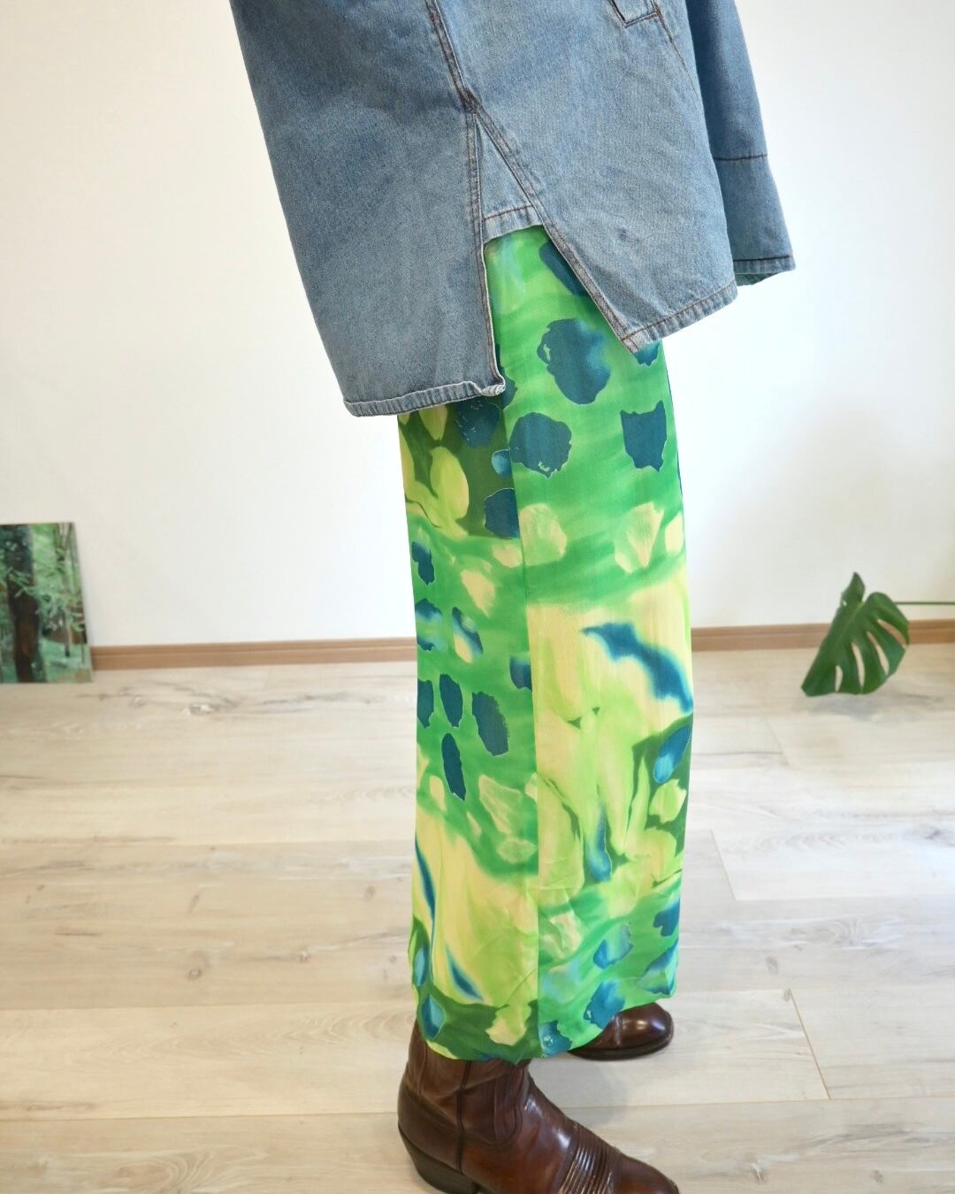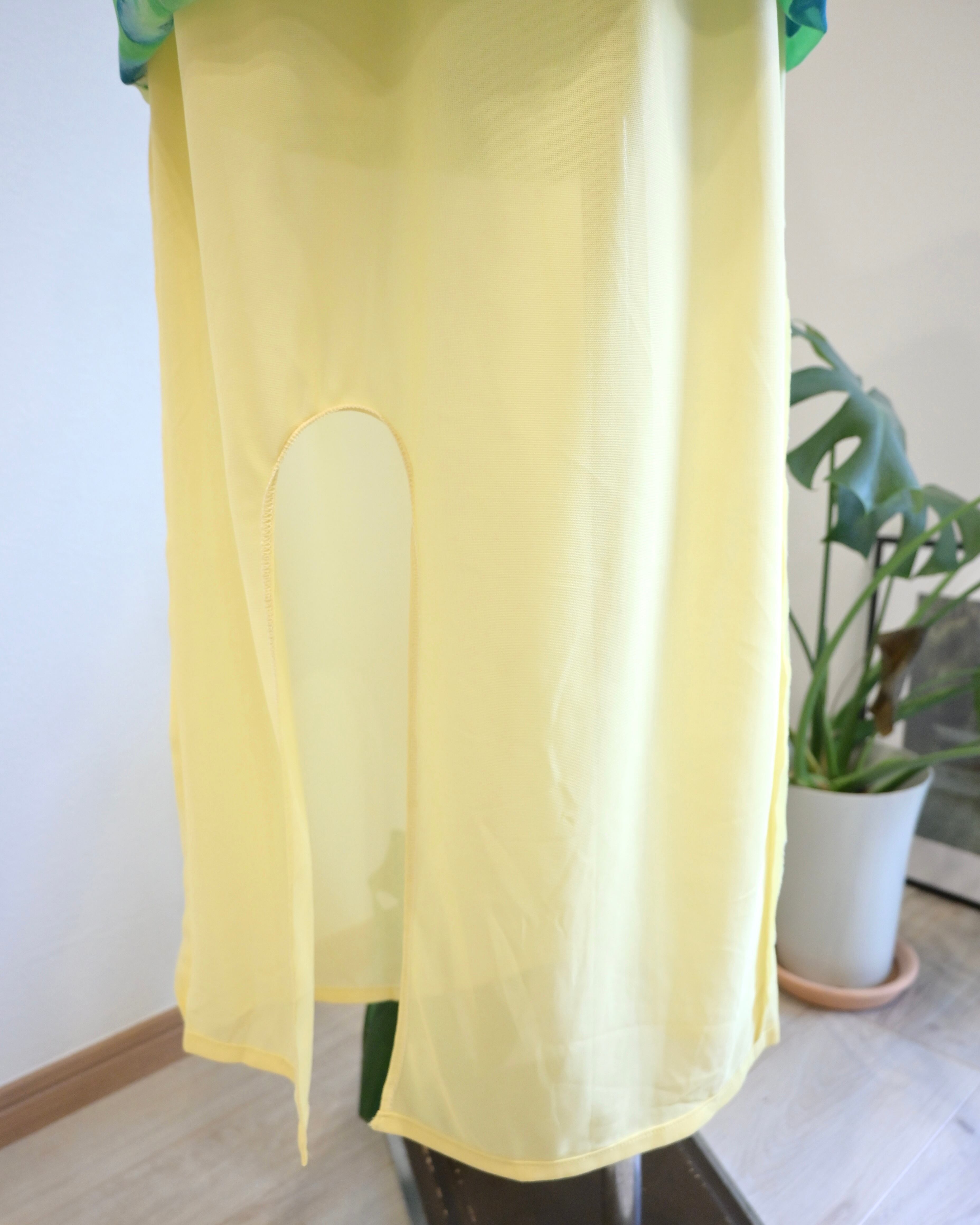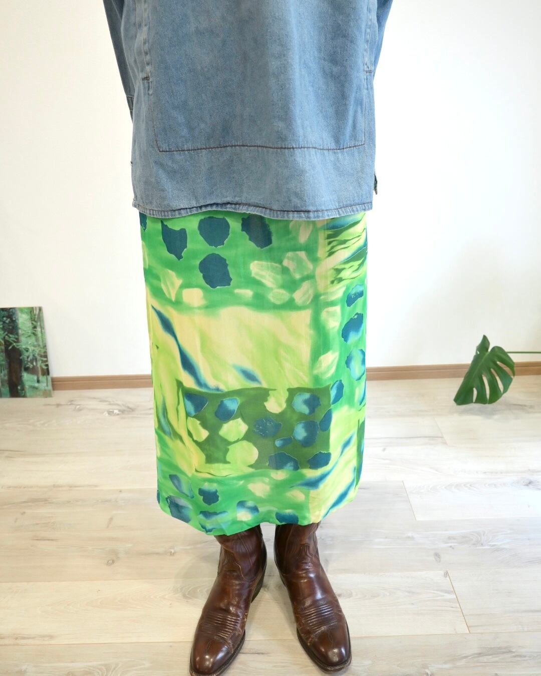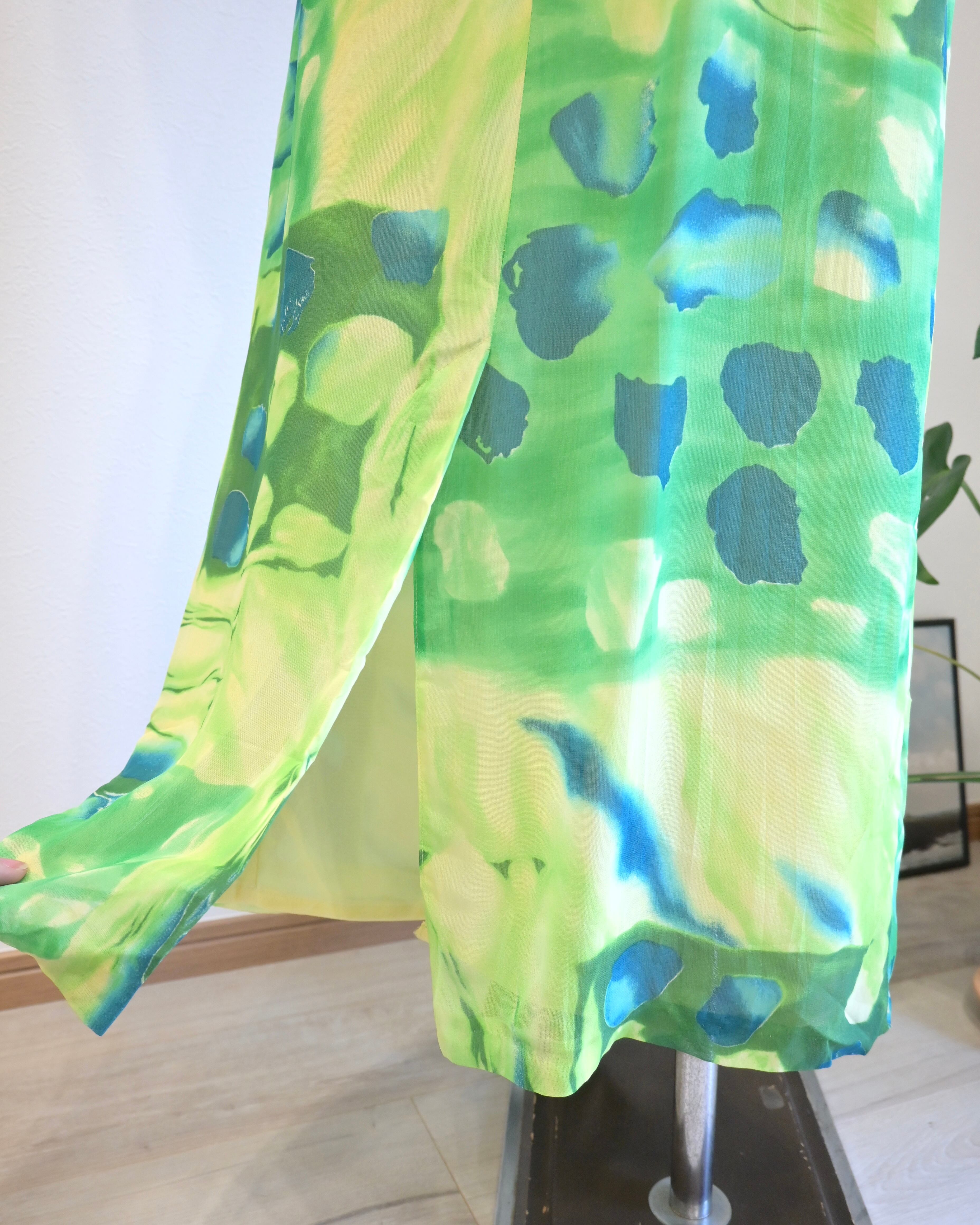 シアー感のあるグリーン、ブルー、イエローのさわやかなカラーのスカート。
