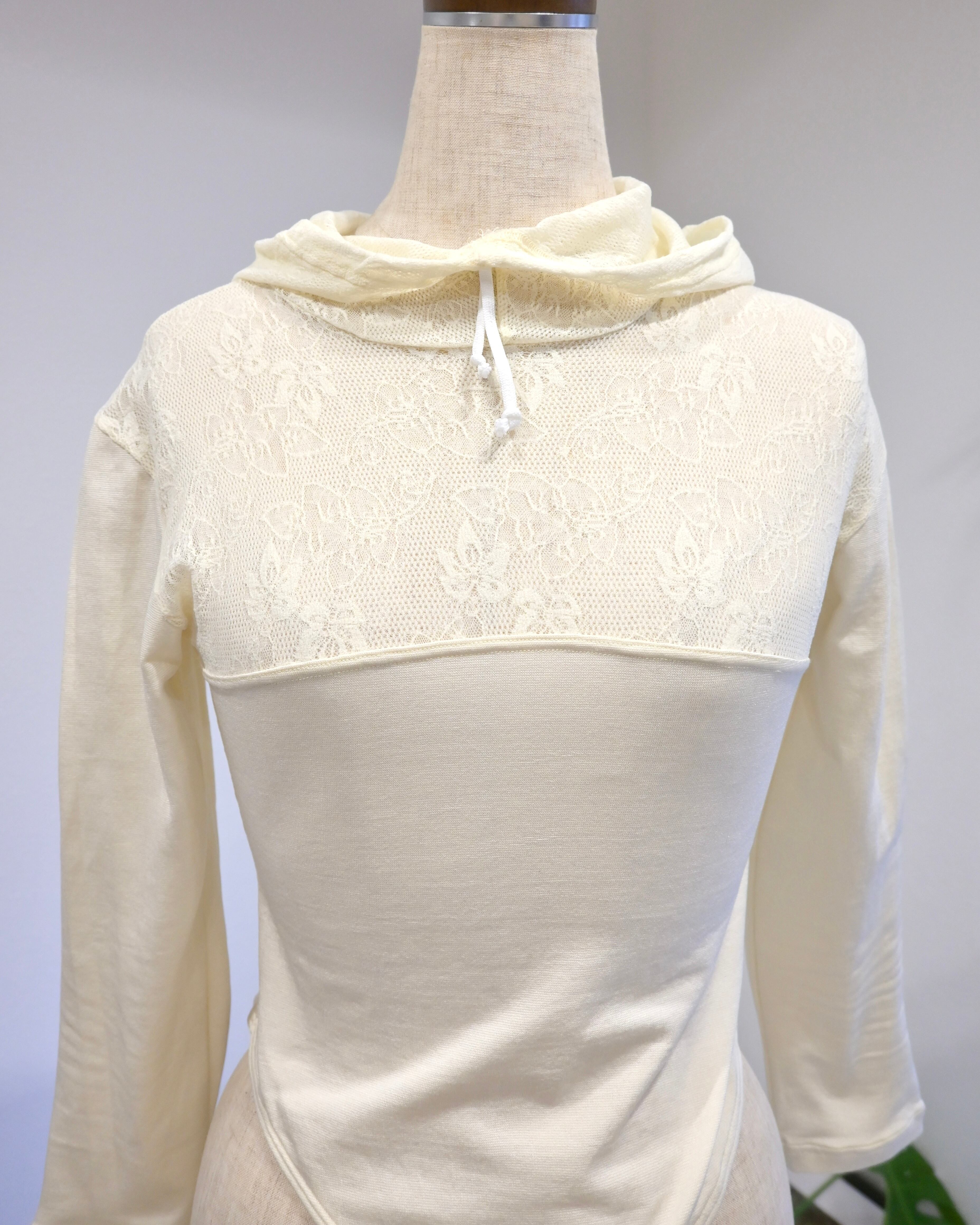 一枚で着ていただくのはもちろん、薄手なのでスウェットやニット等とレイヤードしてフードだけ出すのも可愛いです。