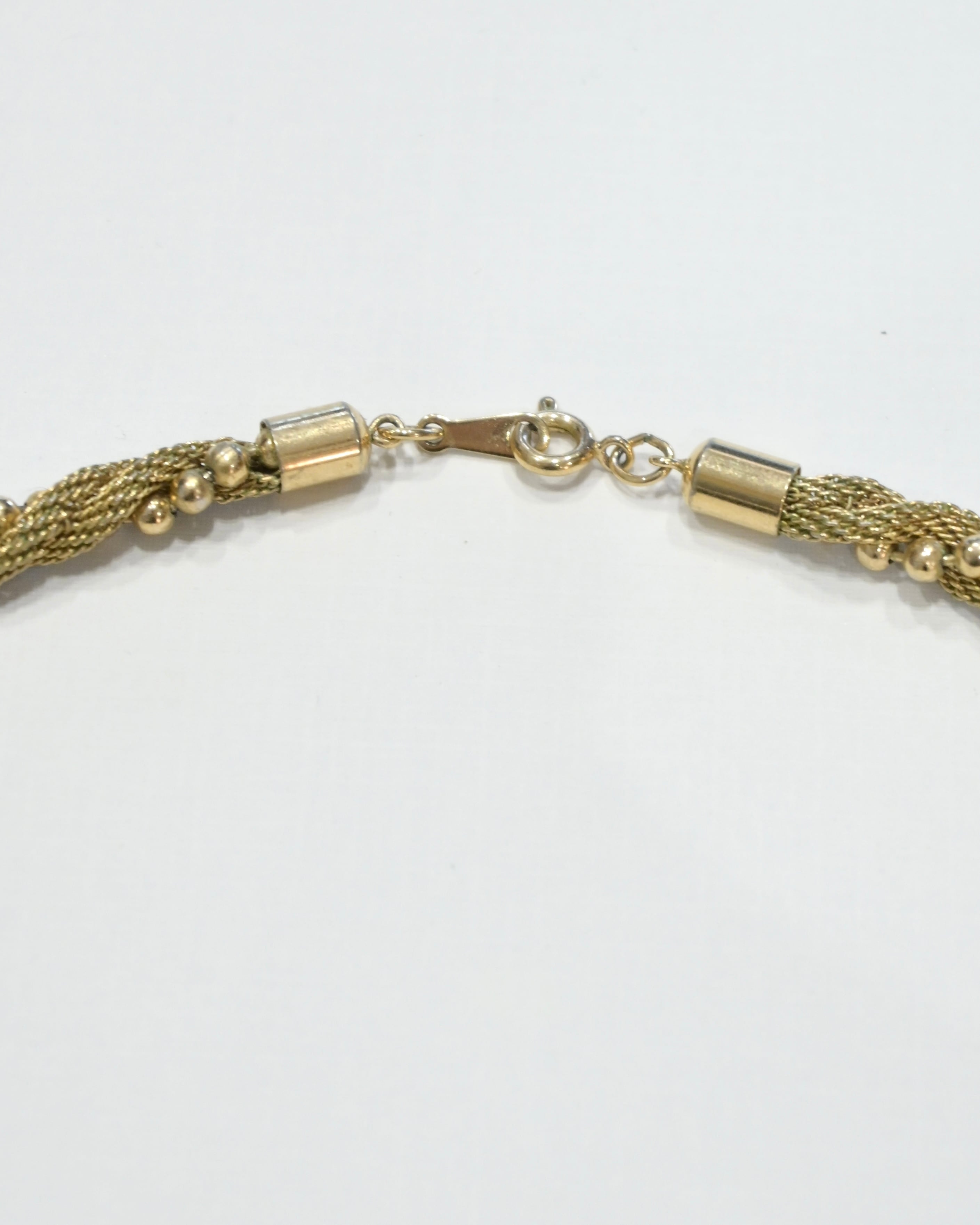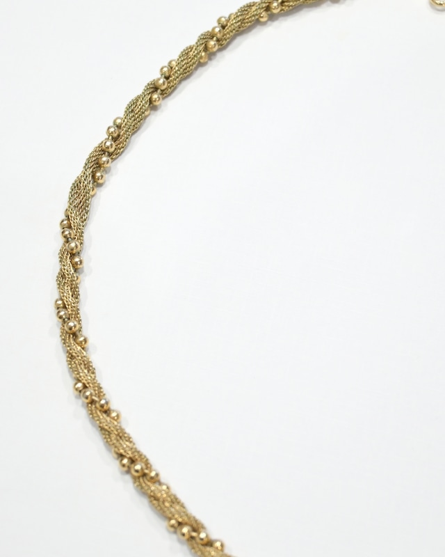 細かないメッシュチェーンをツイスト城に編み込み、縁にボールパーツを施した繊細なデザイン。