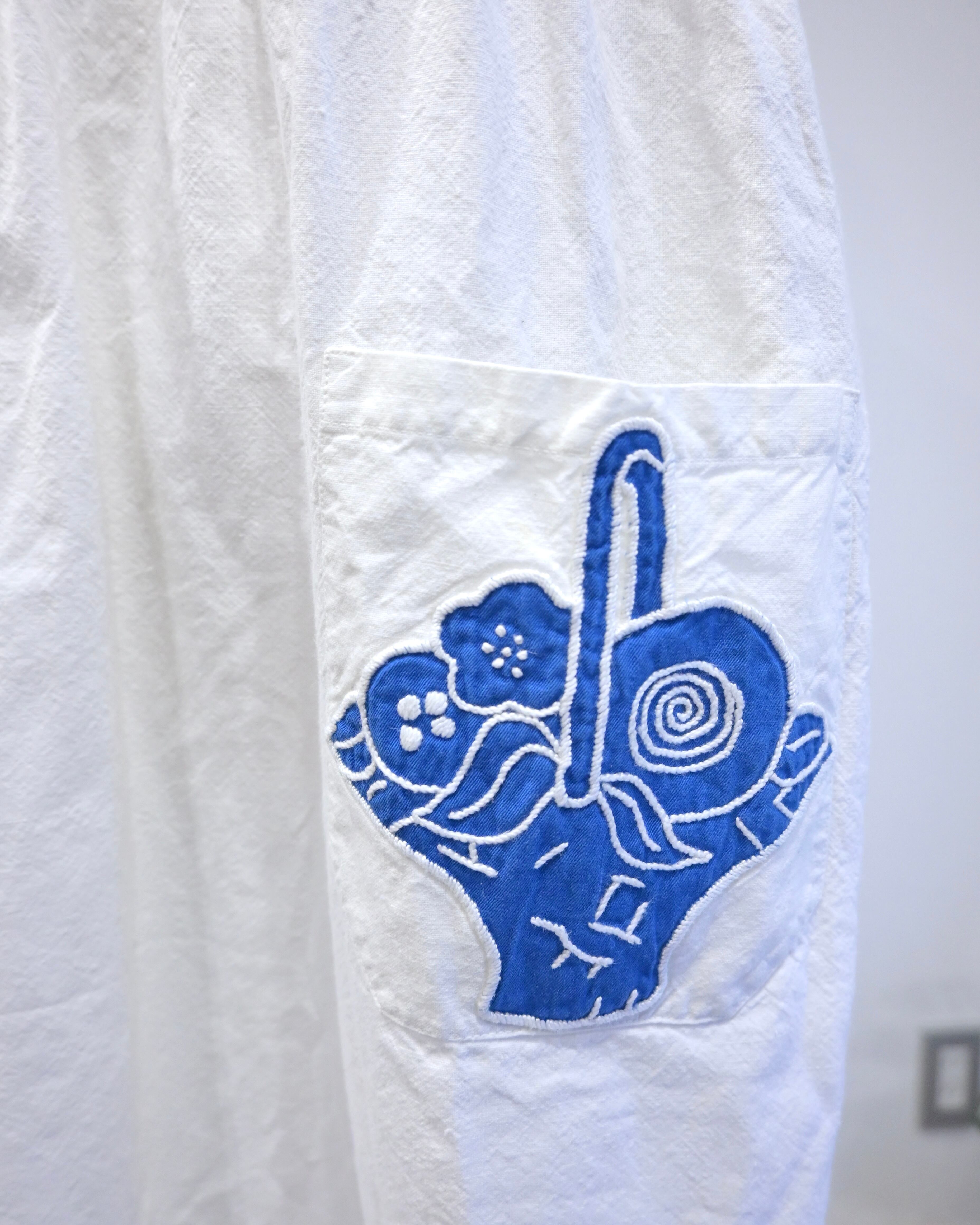 両サイドのポケットにはお花の入ったカゴのモチーフがあしらわれています。