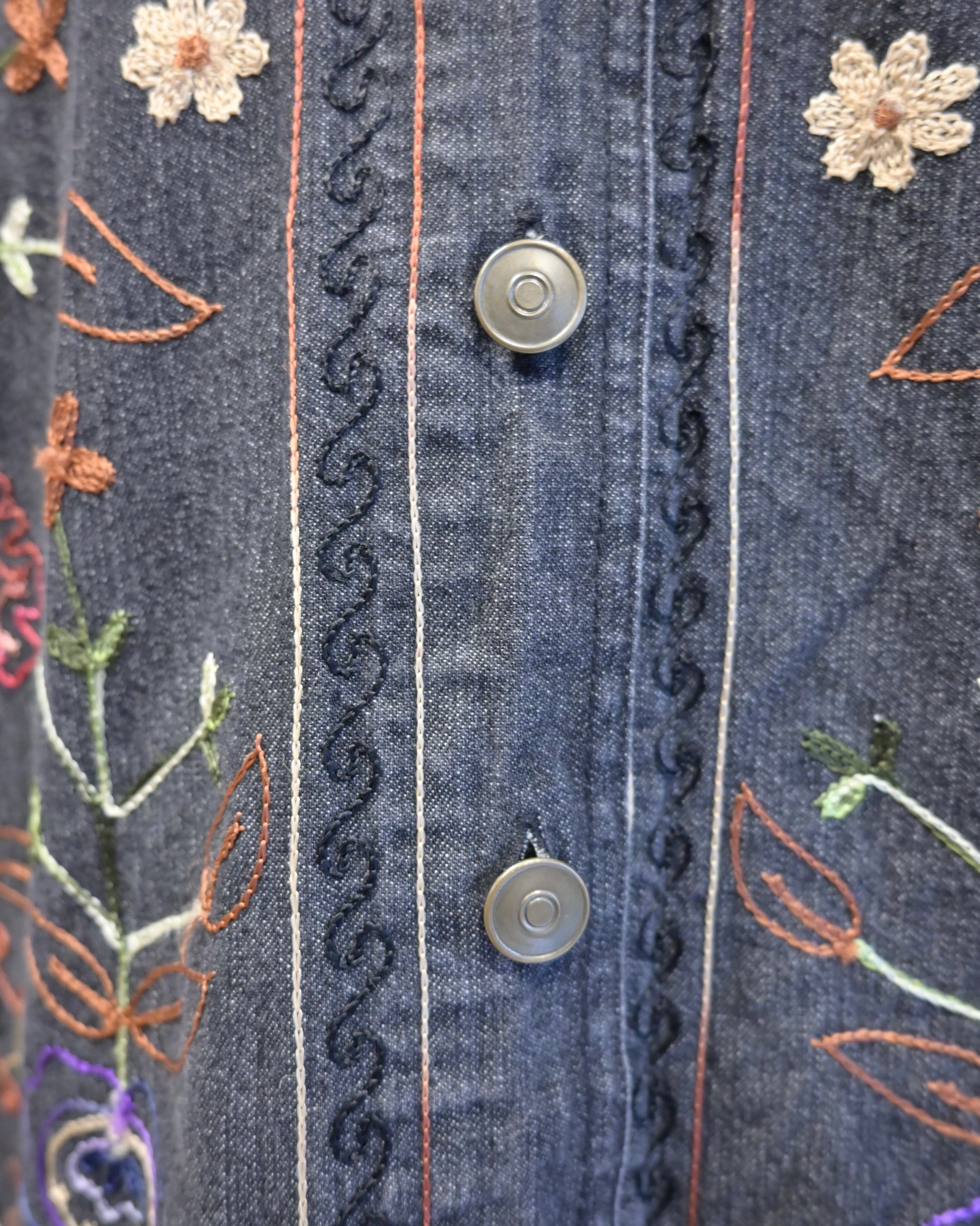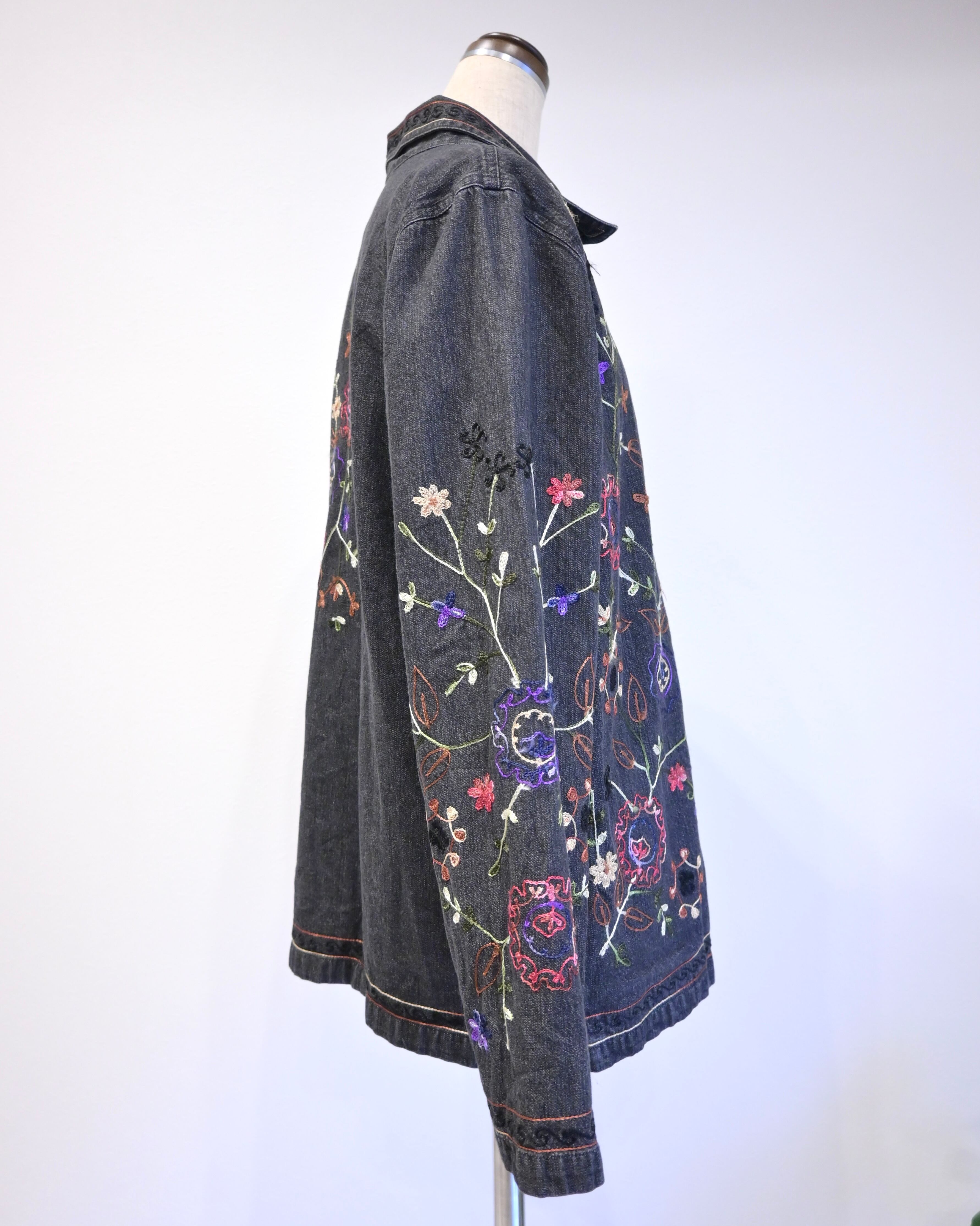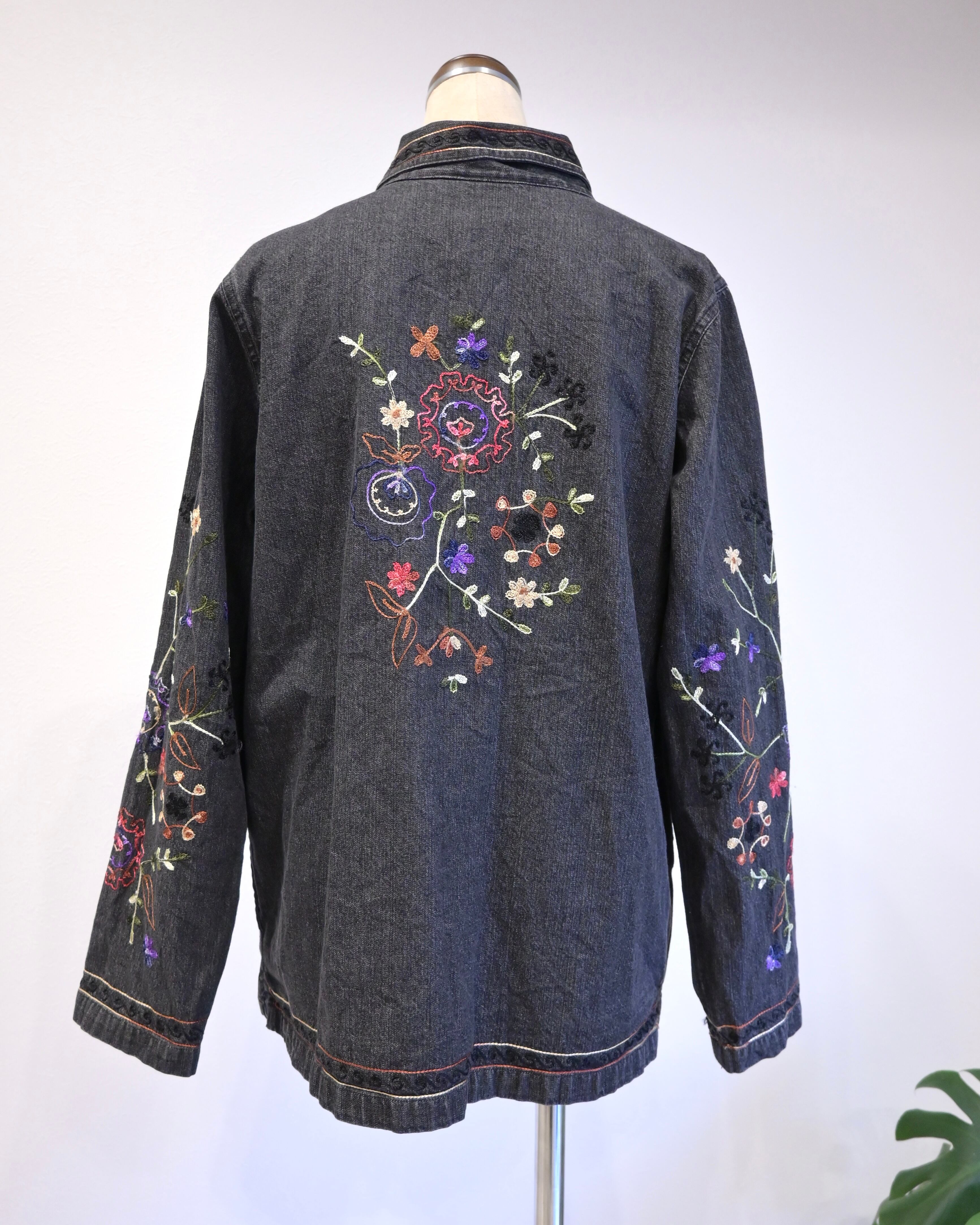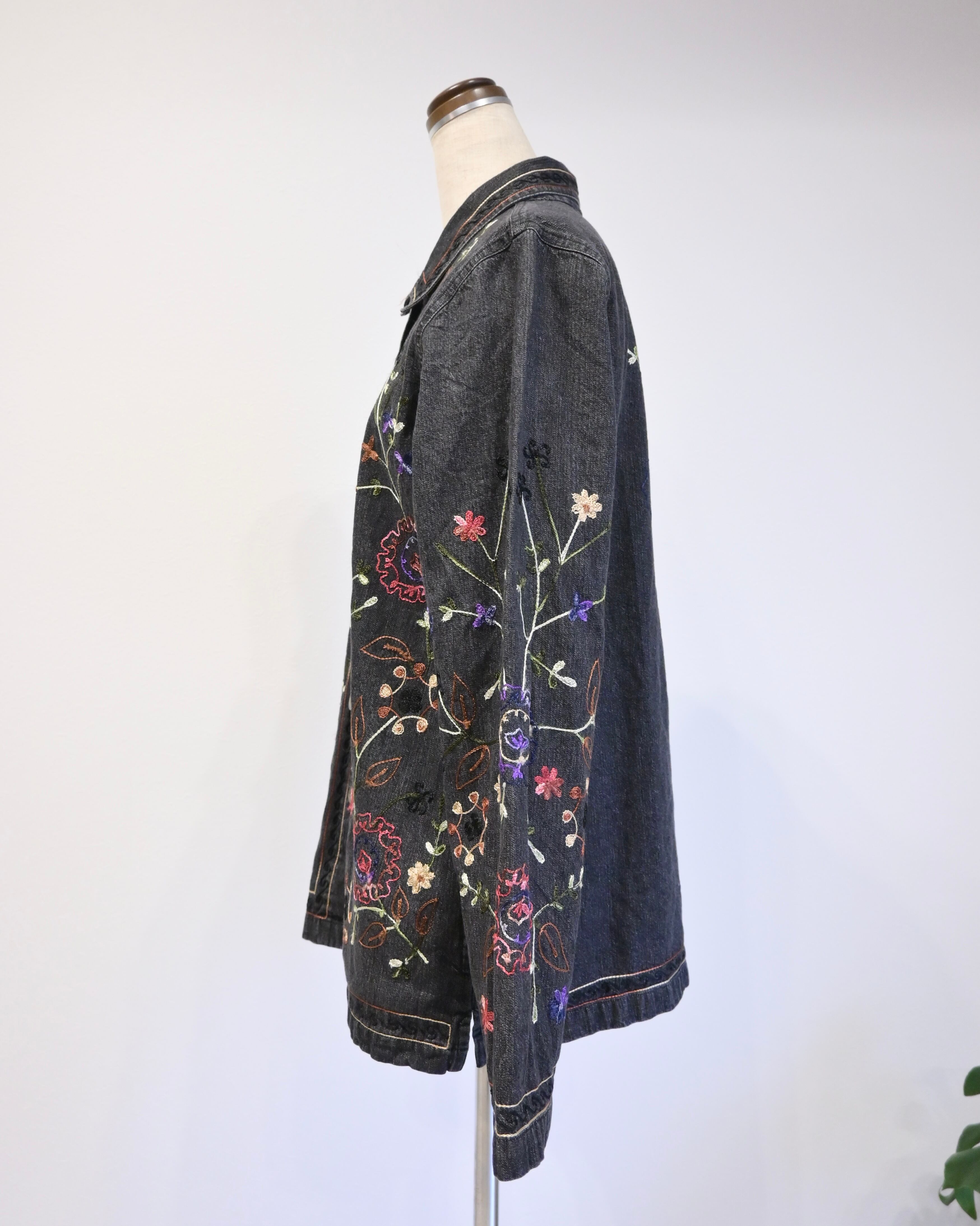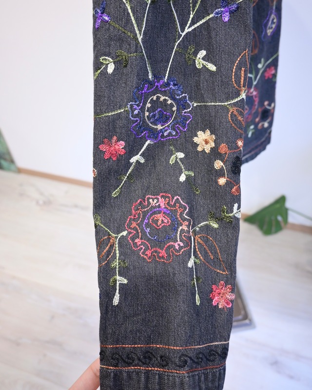 ブラックのデニムに刺繍がほどこされたジャケット。