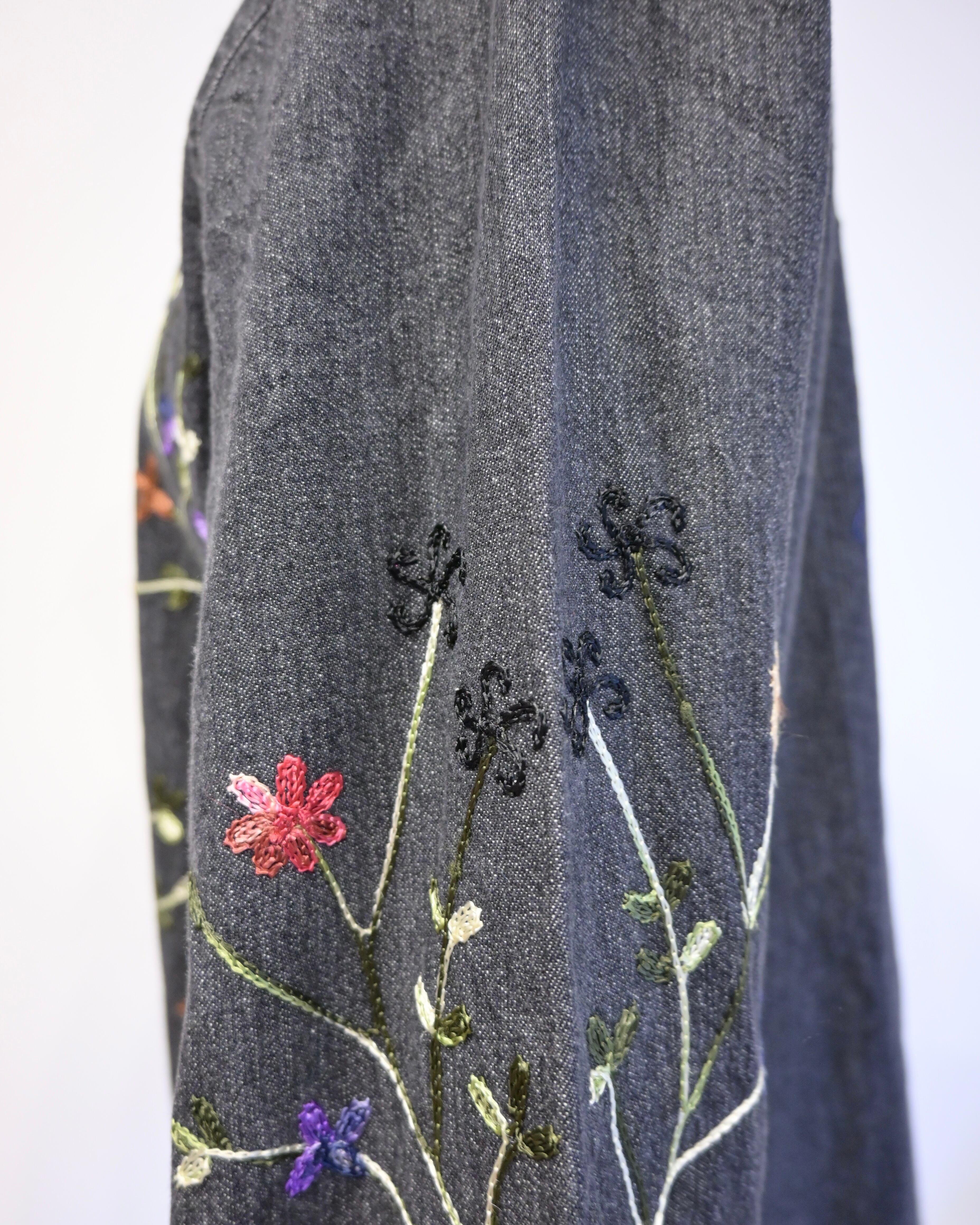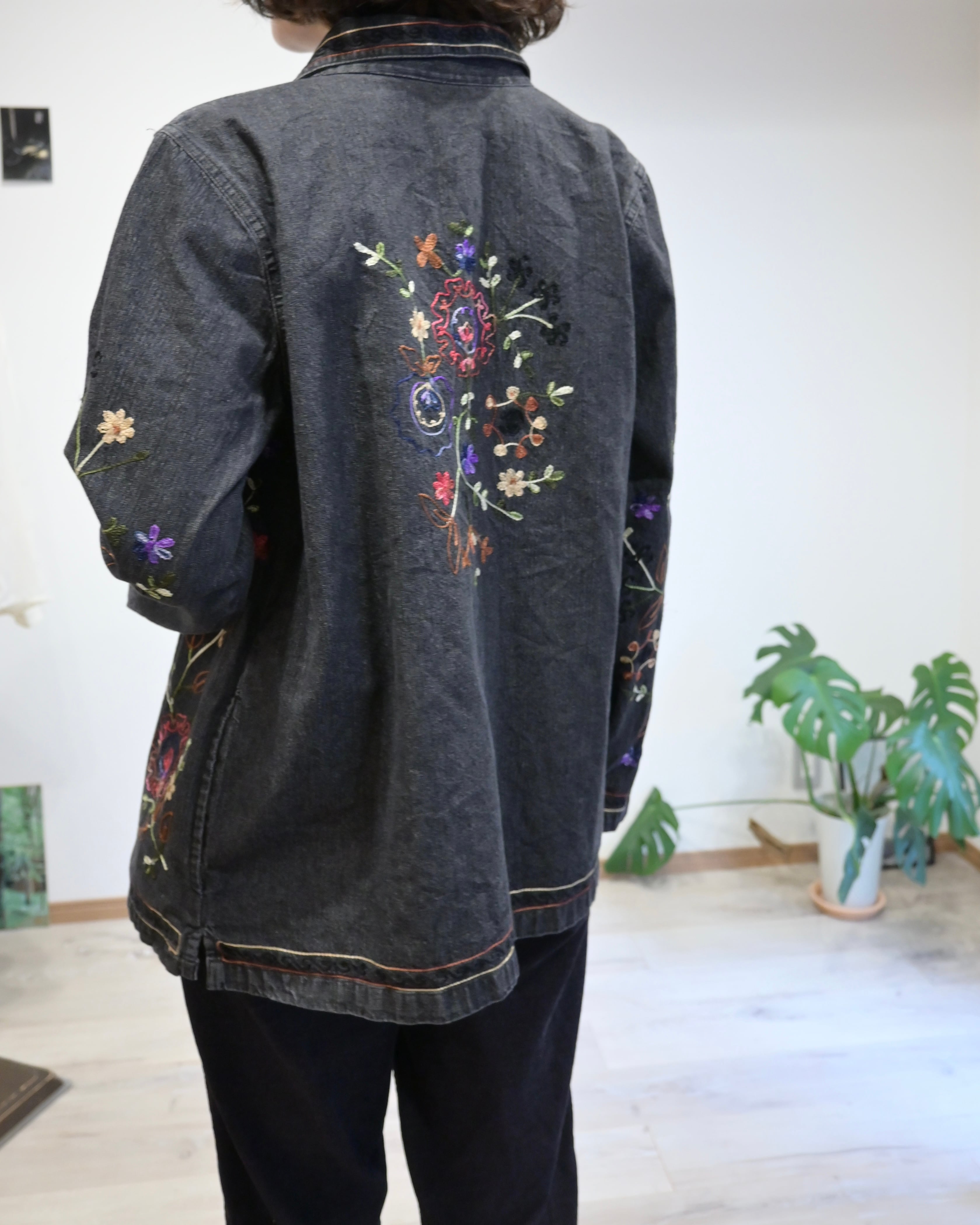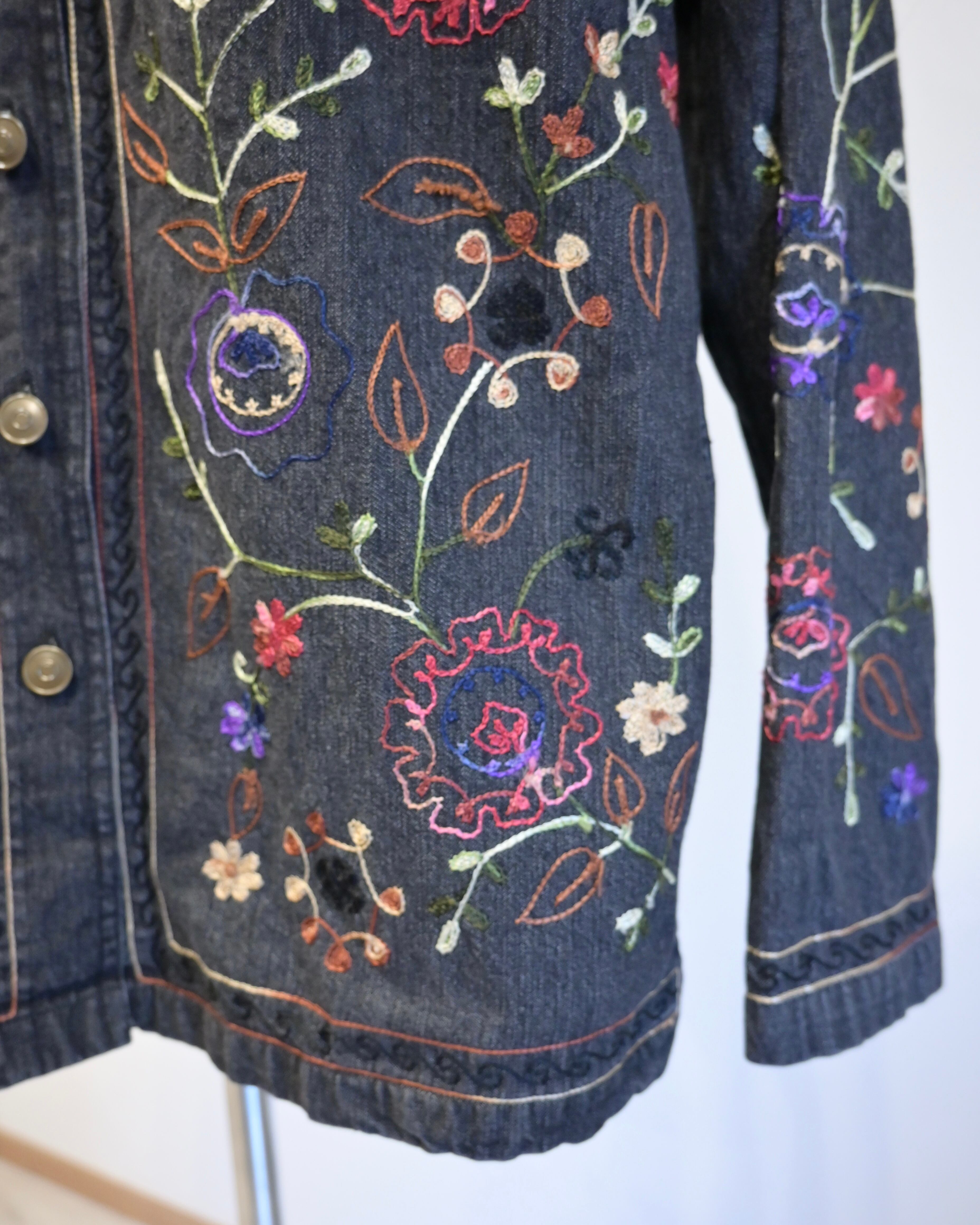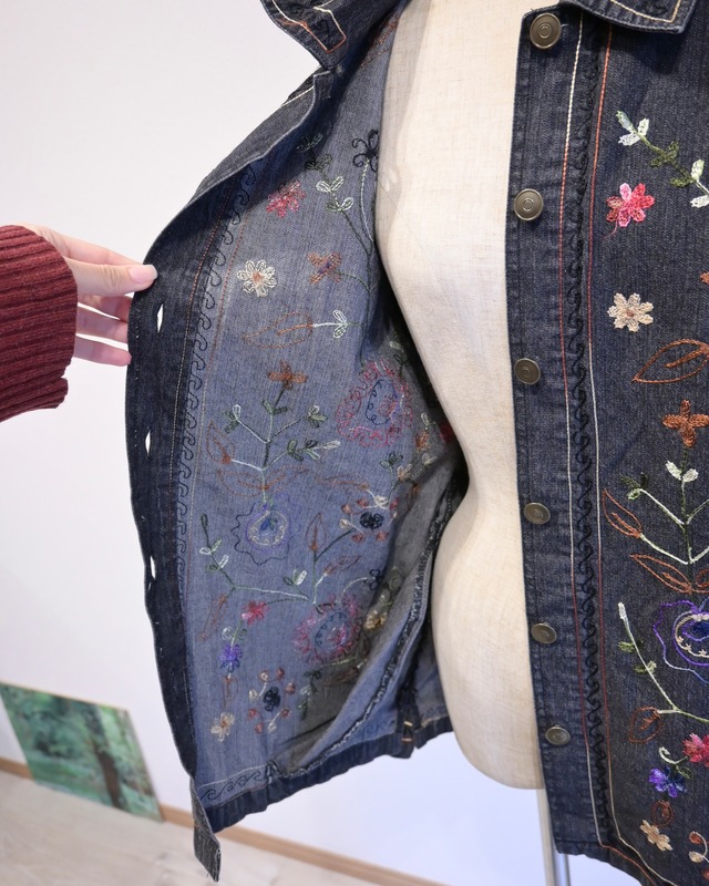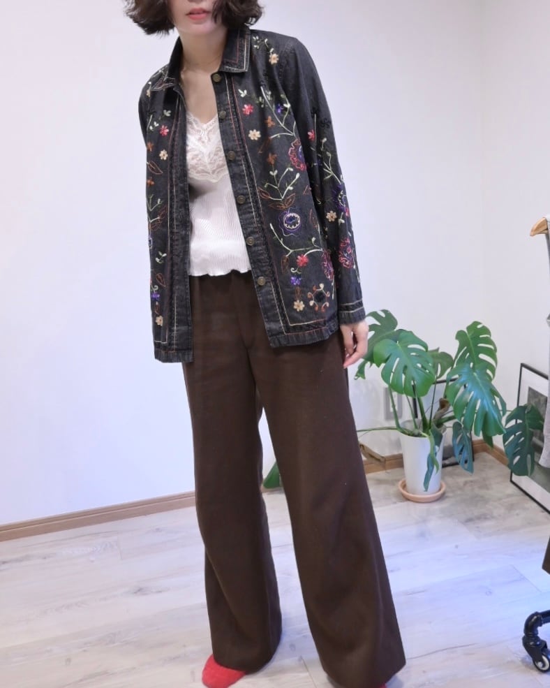 ブラックのデニムに刺繍がほどこされたジャケット。