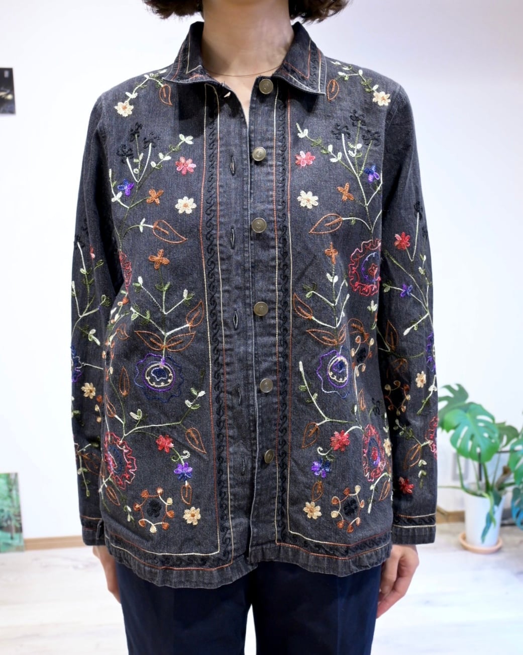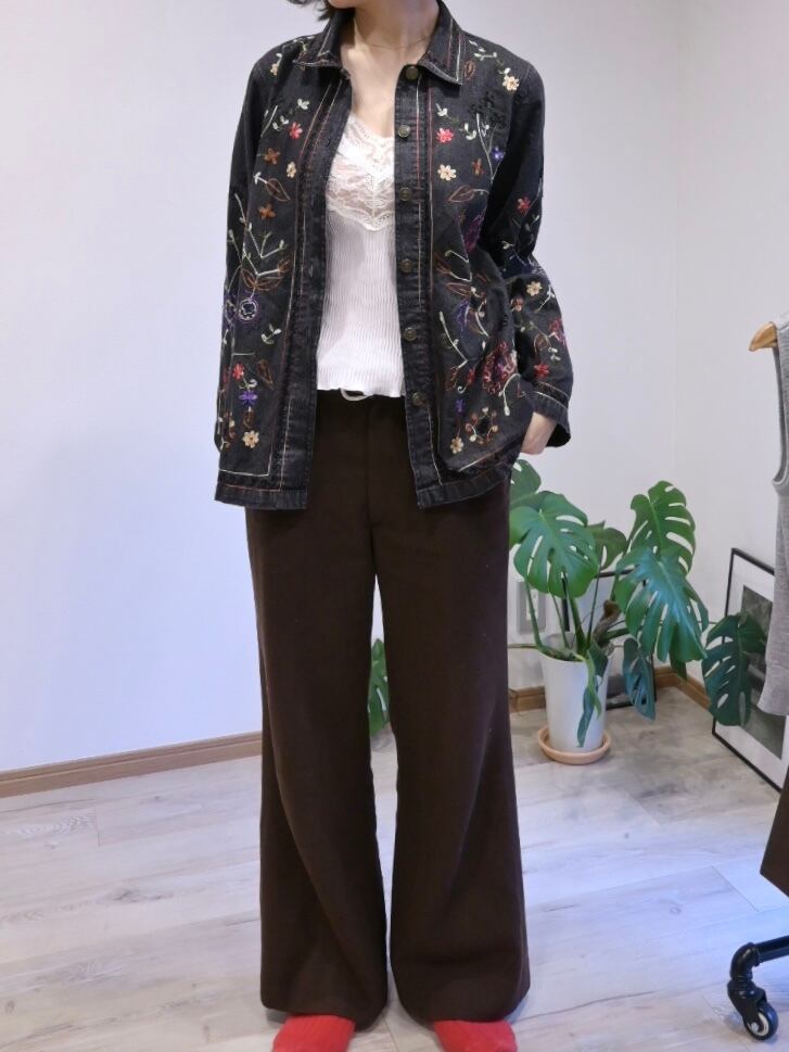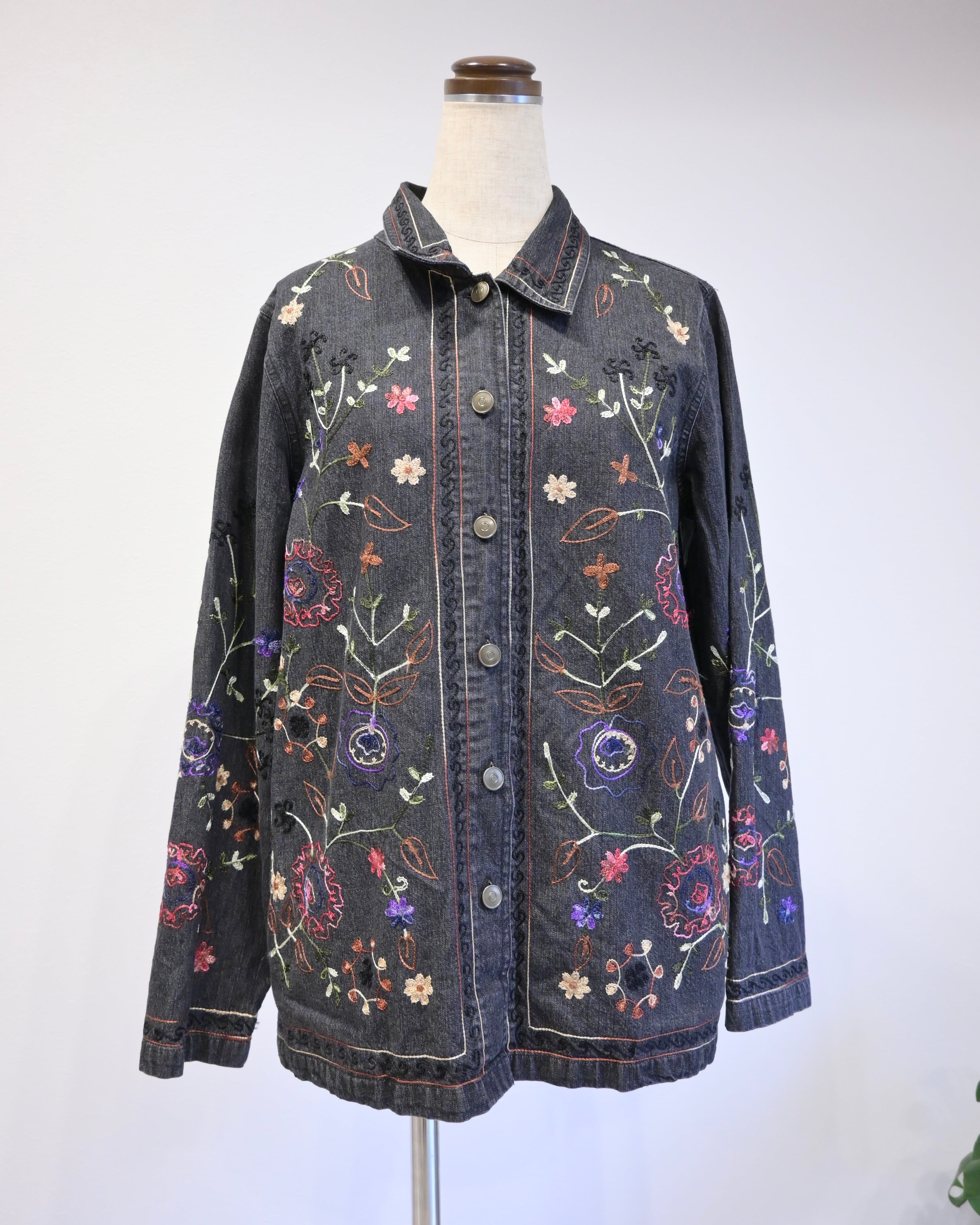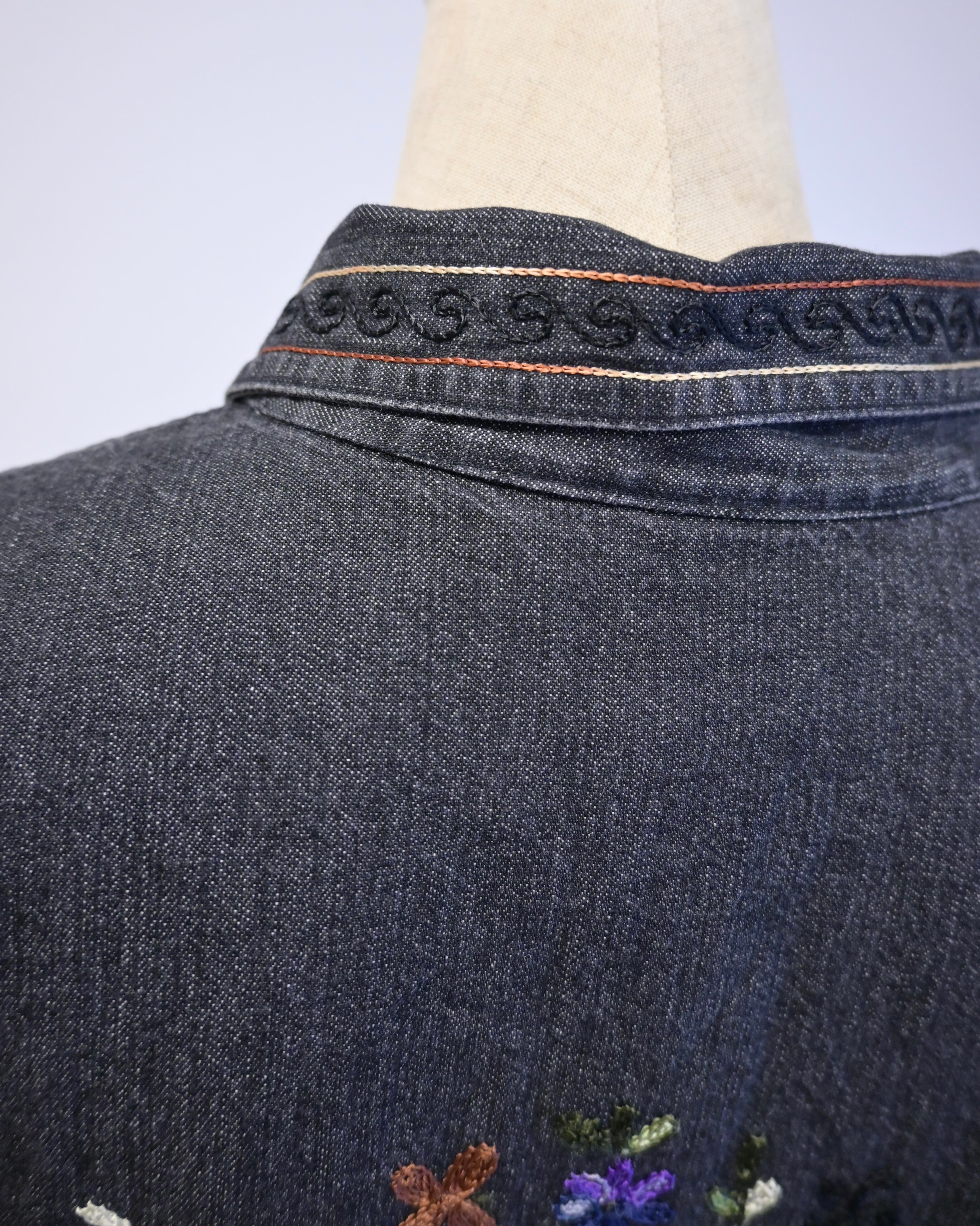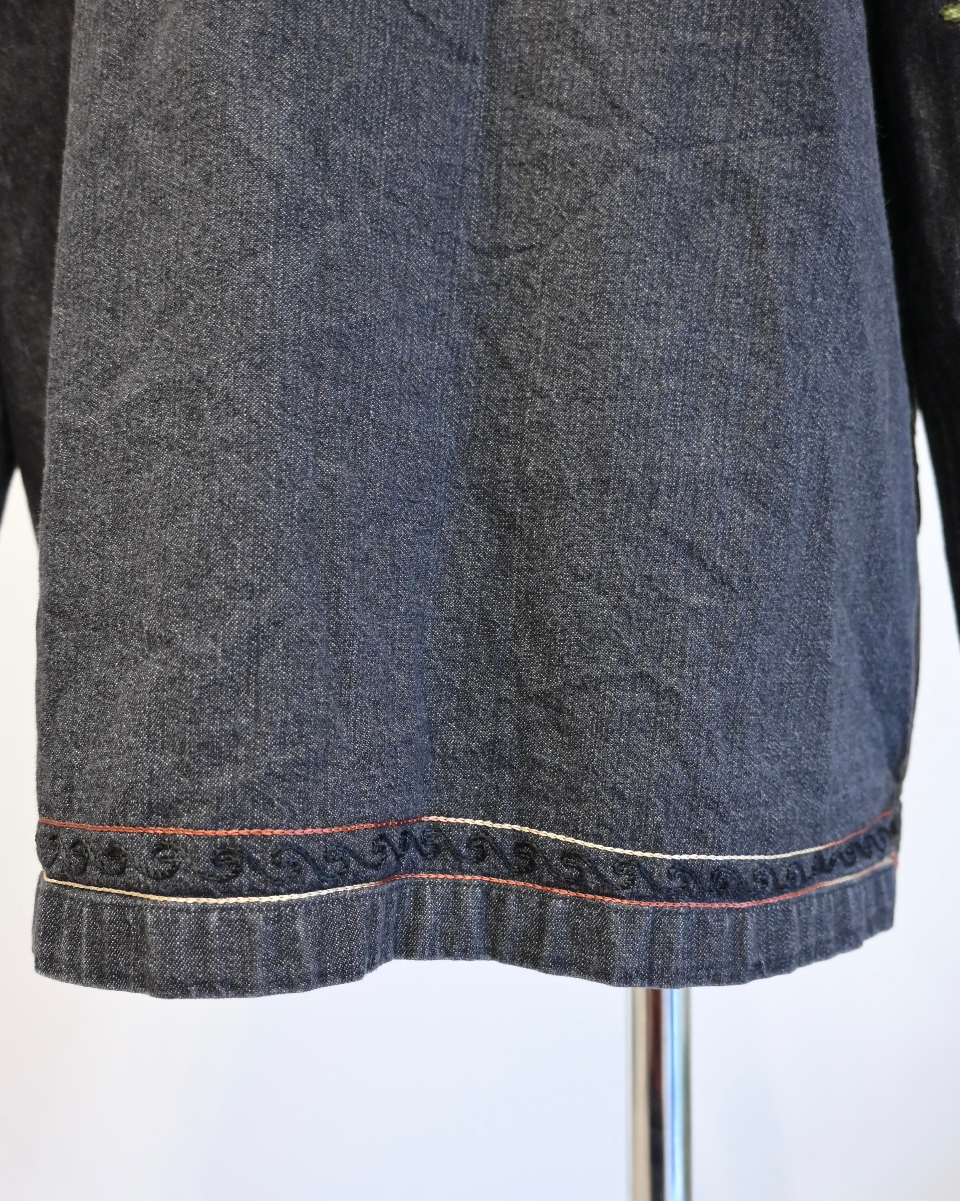 ブラックのデニムに刺繍がほどこされたジャケット。