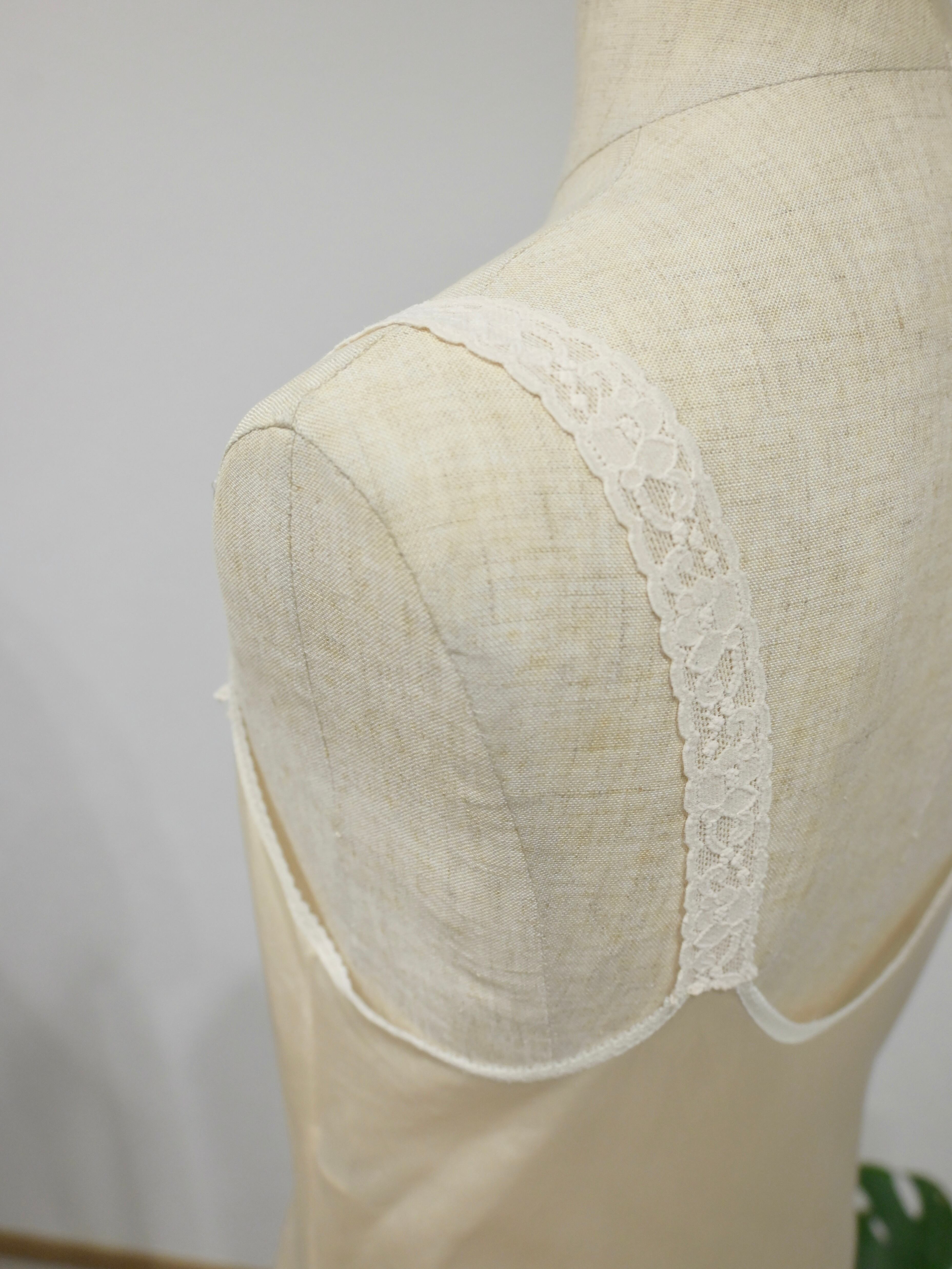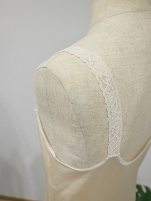 胸元と肩紐が繋がるレースは透け感があり、レイヤードをしても、素肌に着ても素敵
