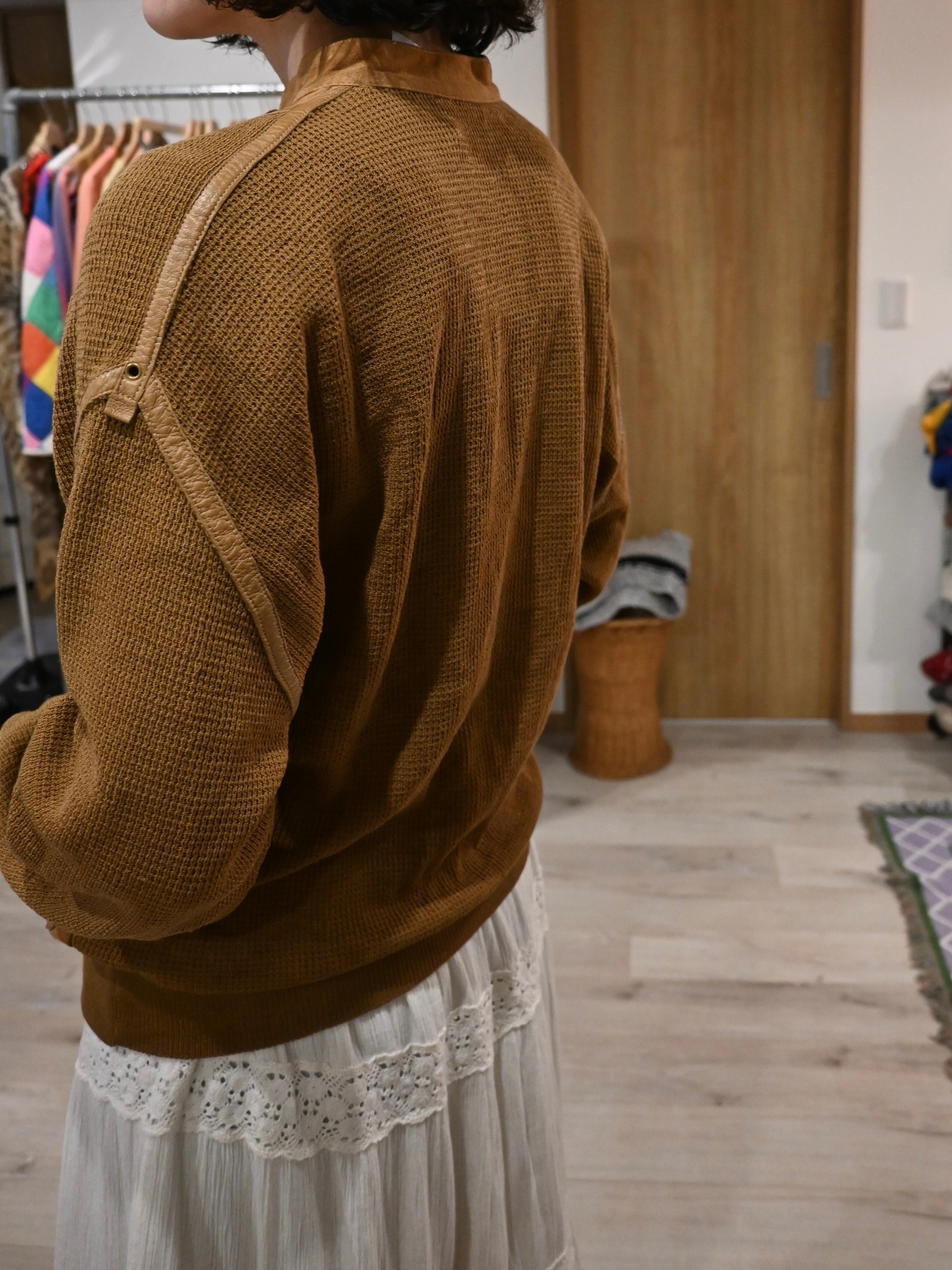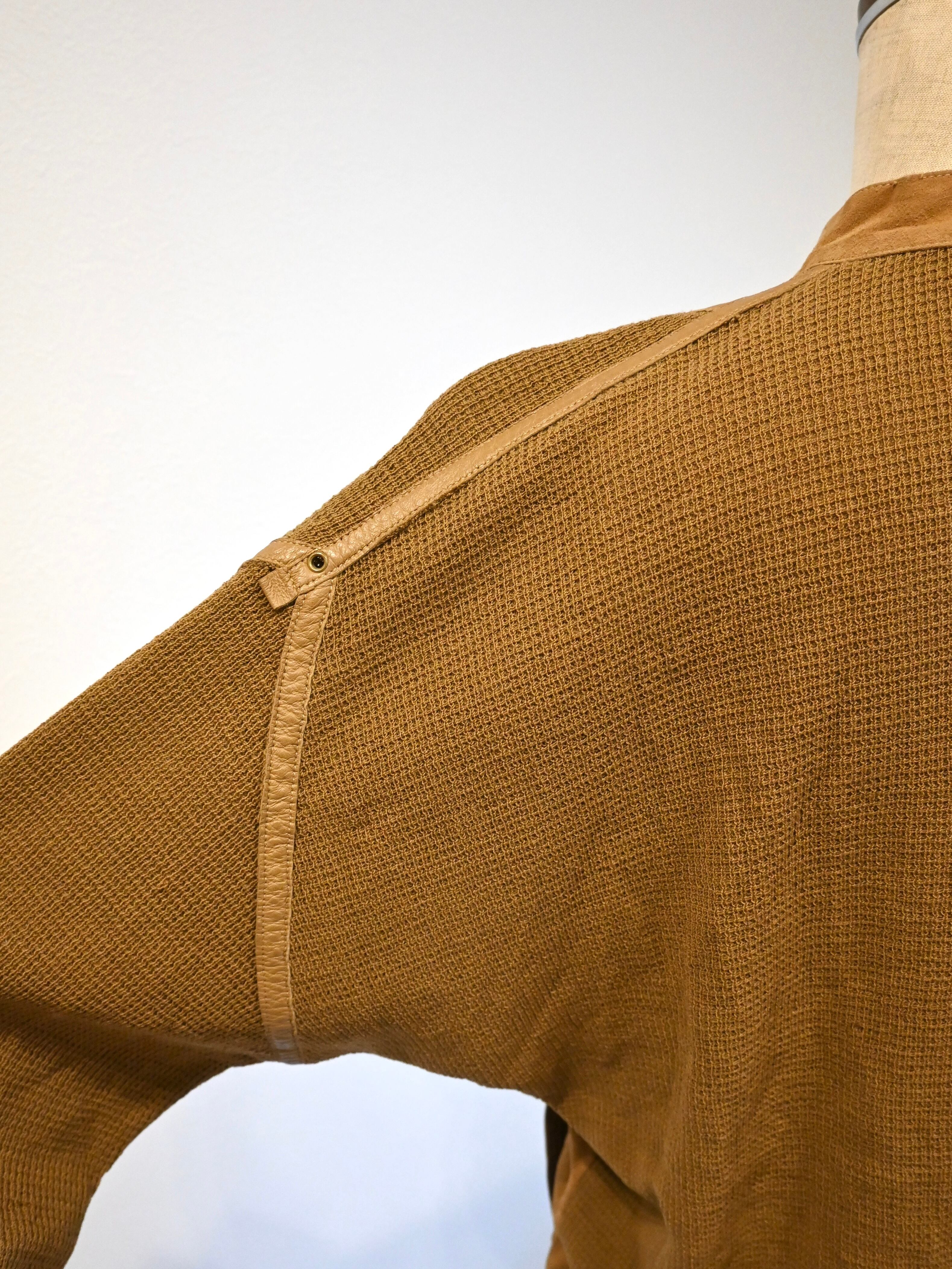 袖や肩にほどこされたパイピングがあることで、ニットとスエードのつなぎ目が引き締まります。