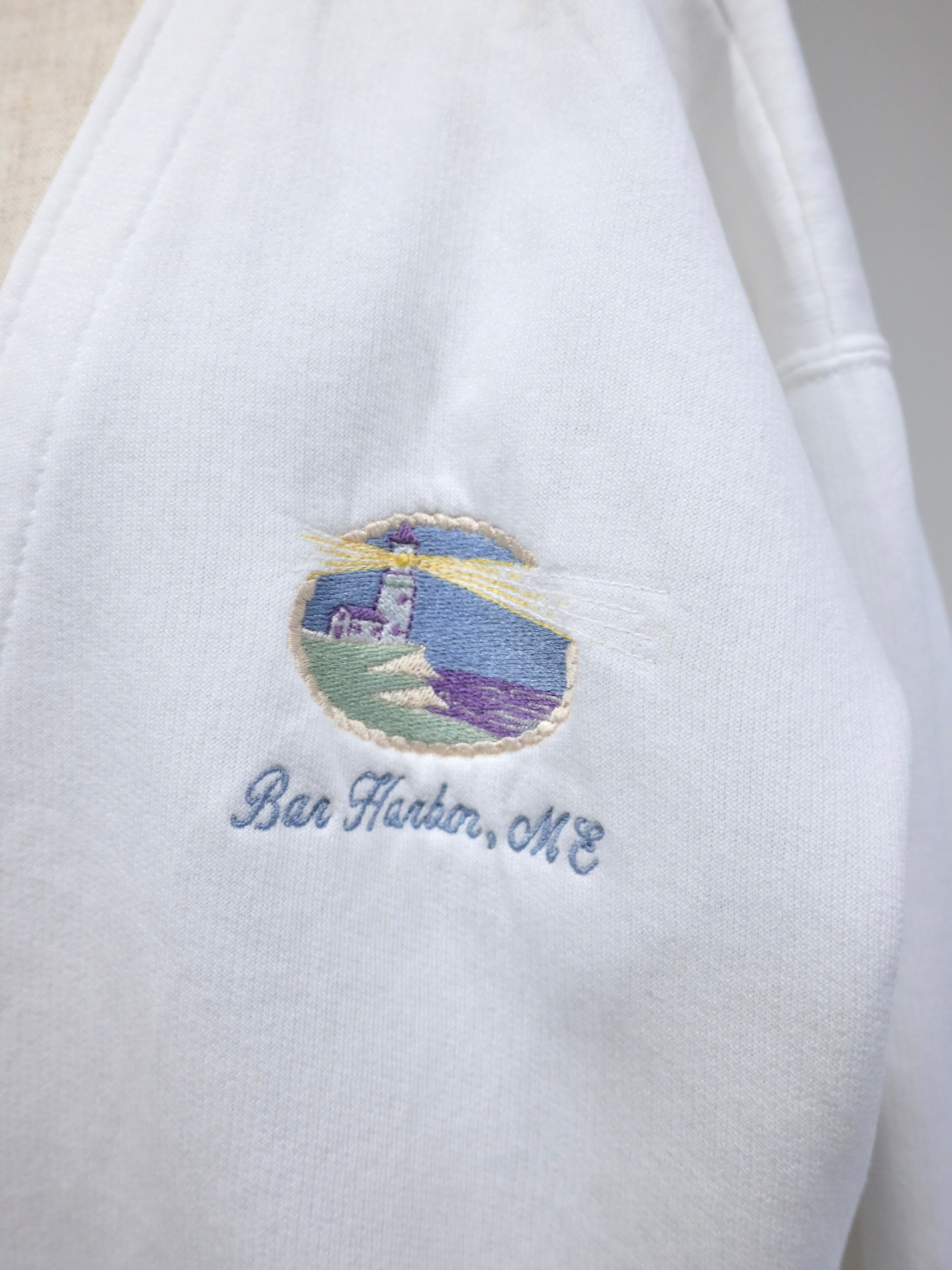 胸元に静かに添えられた灯台の刺繍はホワイトの生地にささやかな奥行きを与えています。