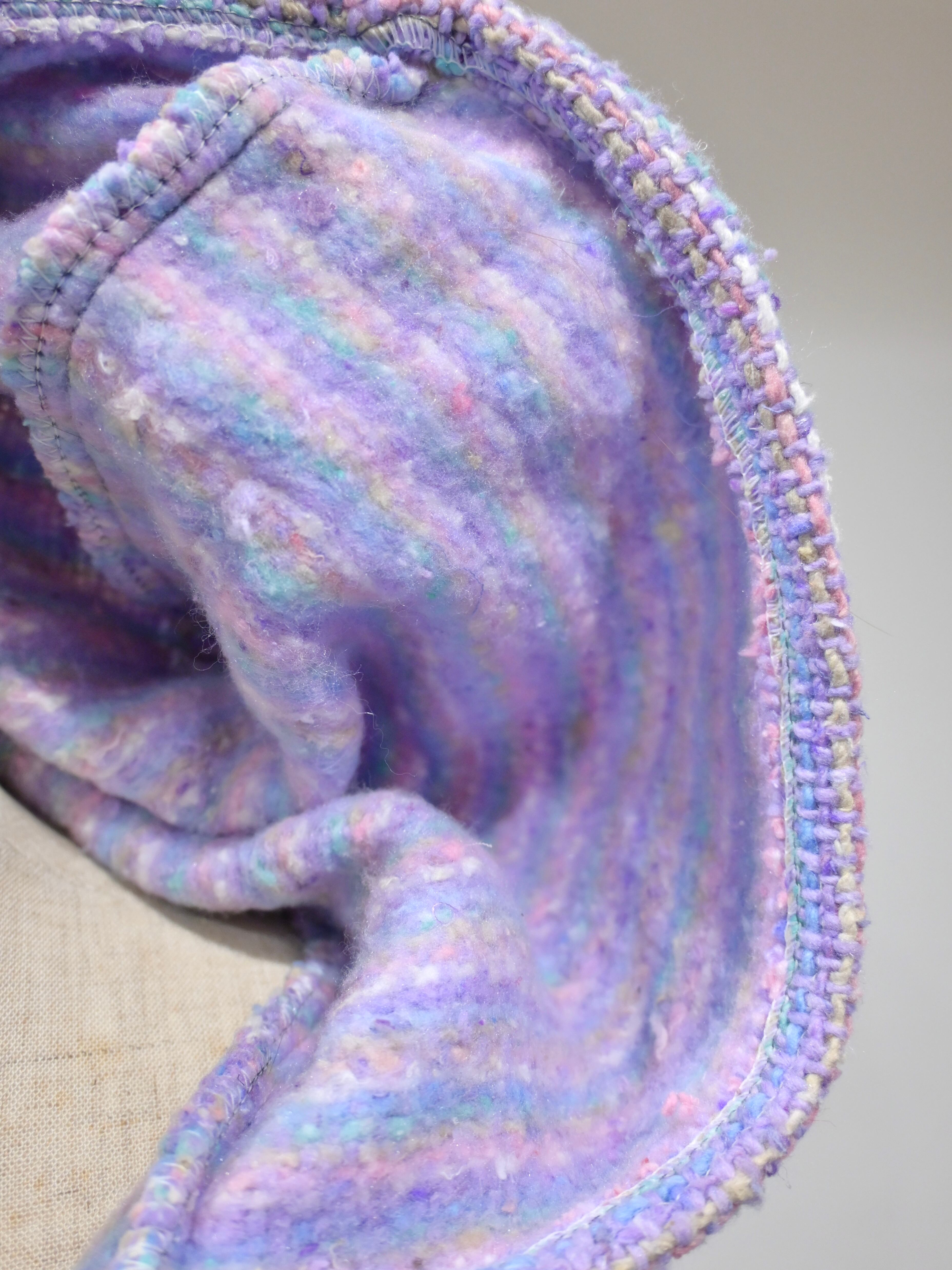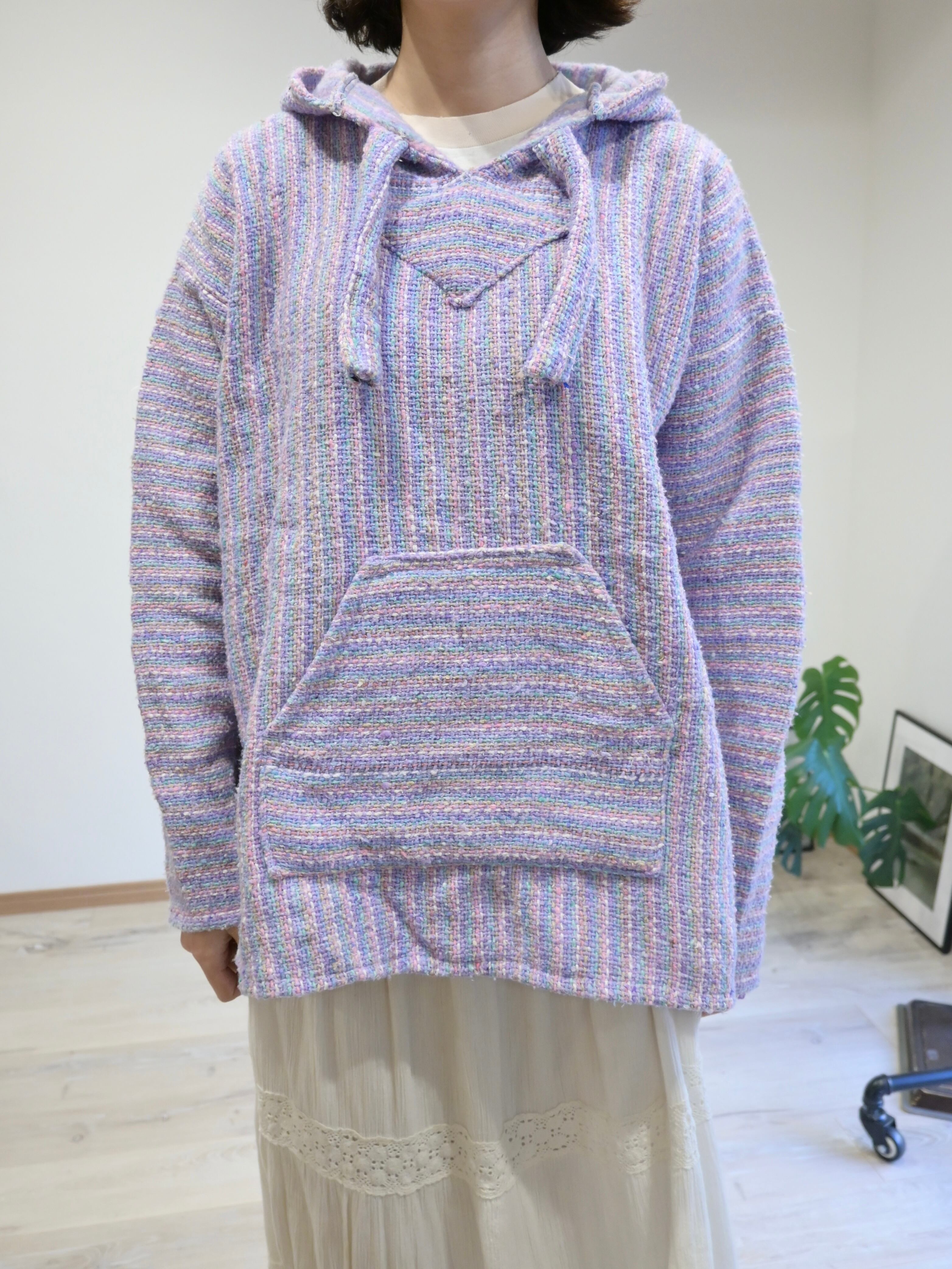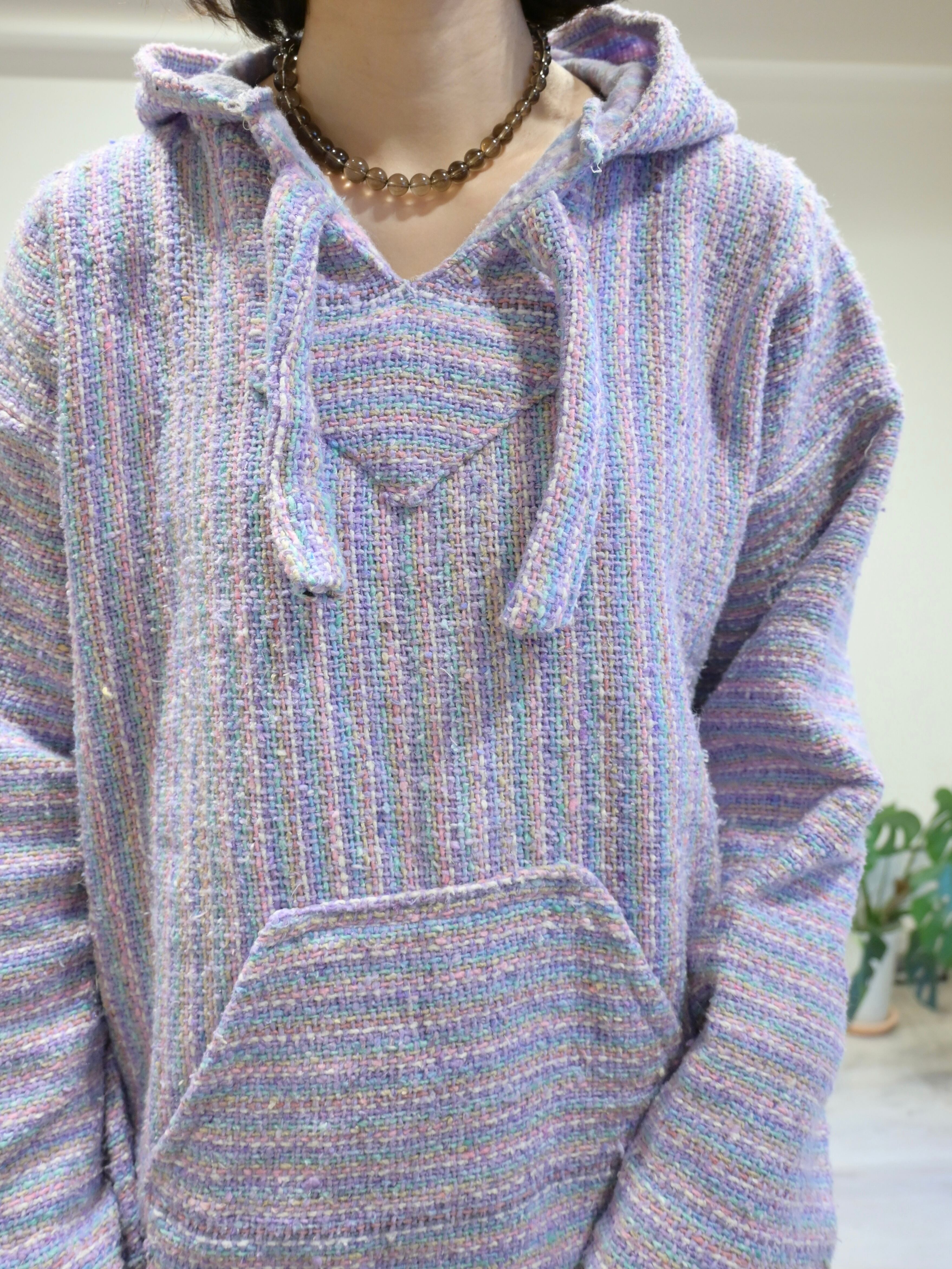 淡いパープルを基調に、サックスブルーやペールピンクの糸が不規則に混ざり合うメキシカンパーカーには珍しいカラーリング。