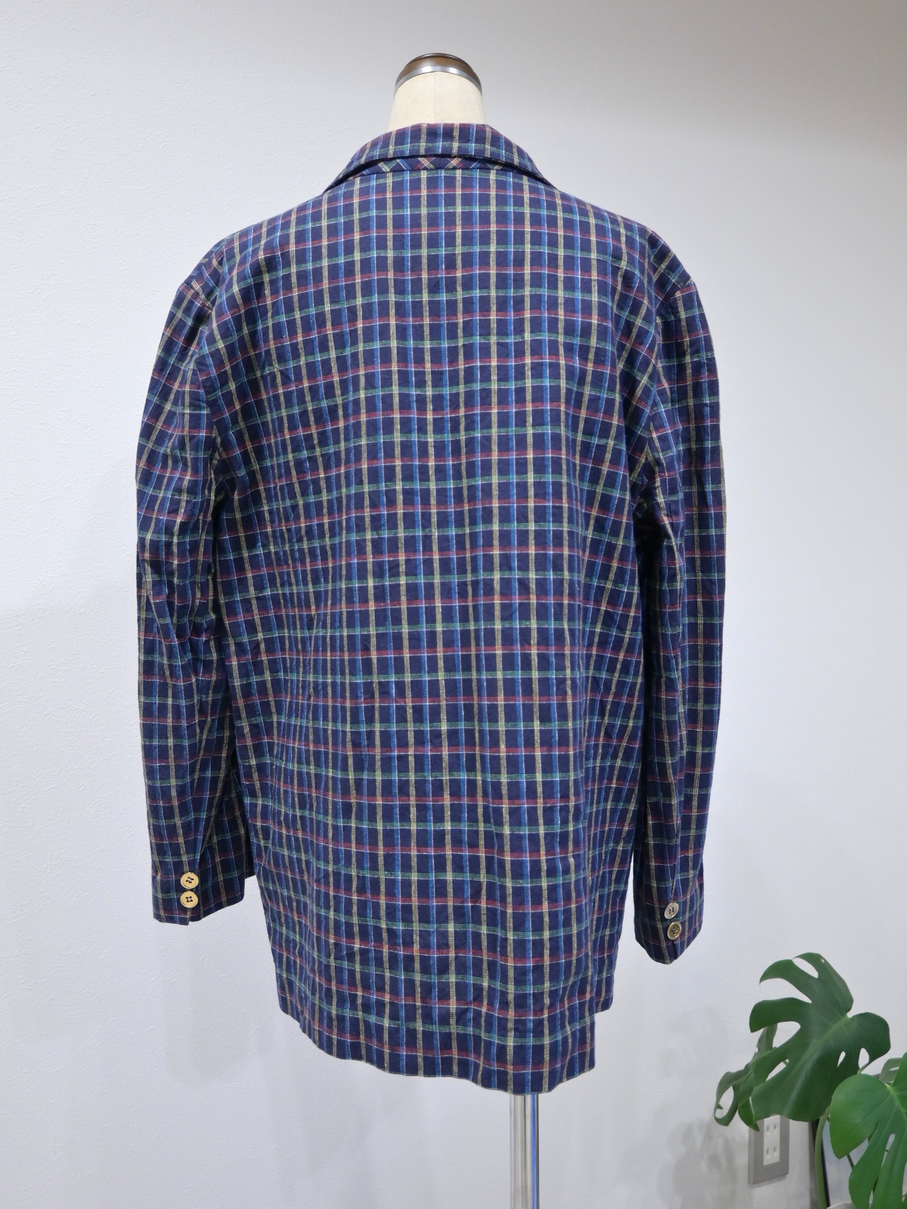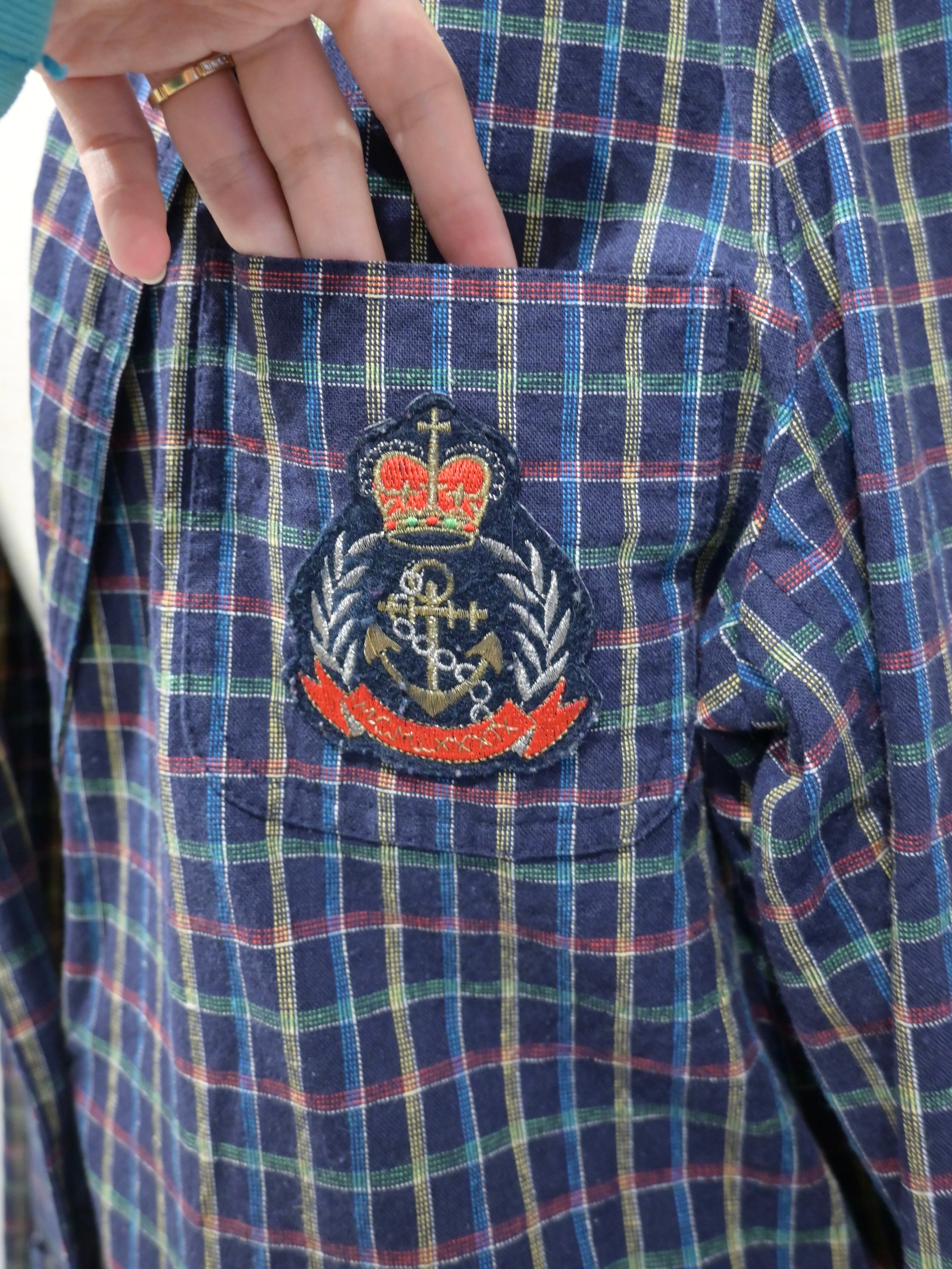 深みのあるネイビーを基調としたチェック柄に、胸元のエンブレム。