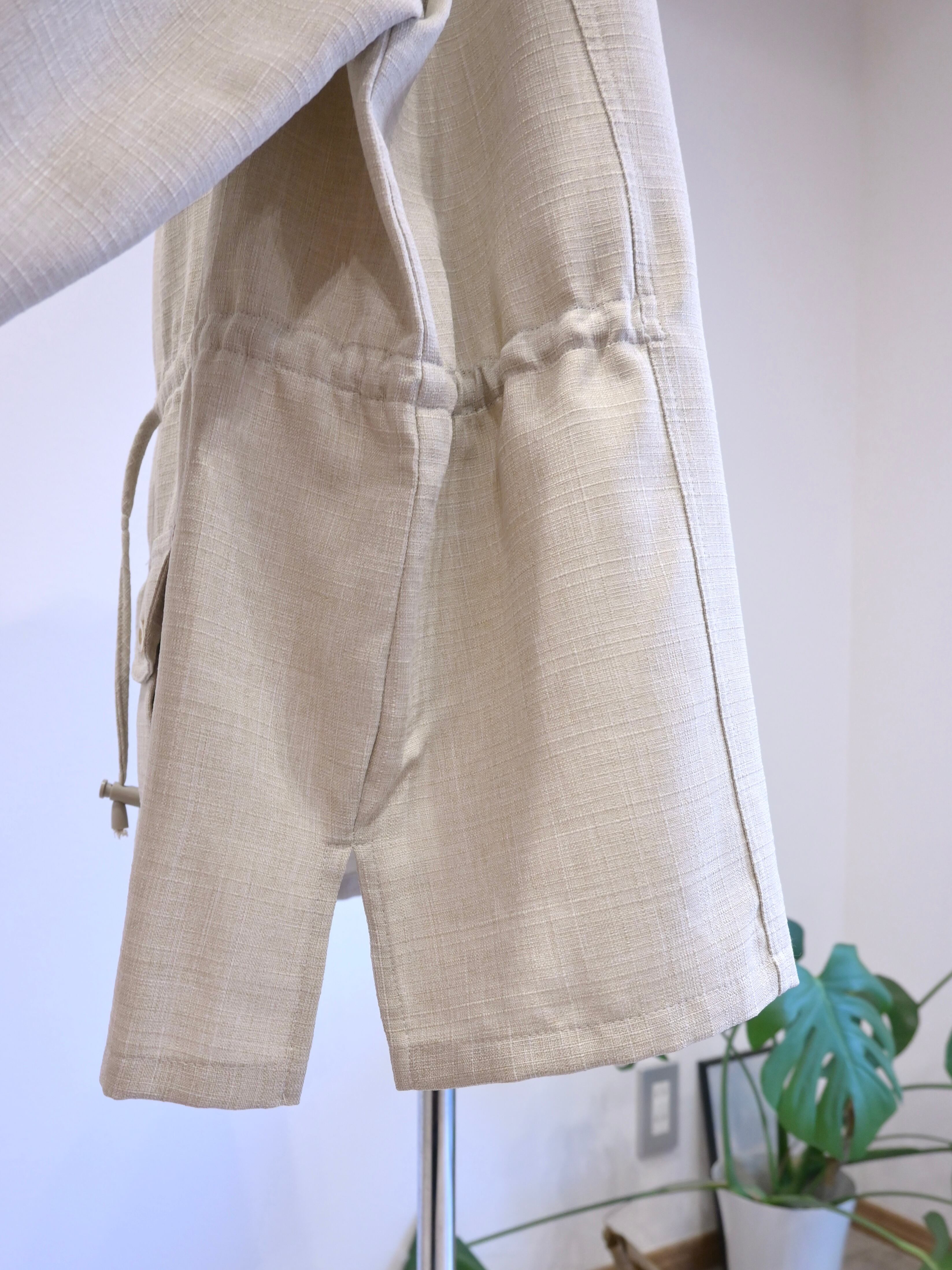 ウエスト部分にはドローコードが通っているため、絞ることでシルエットに変化をつけることができます。