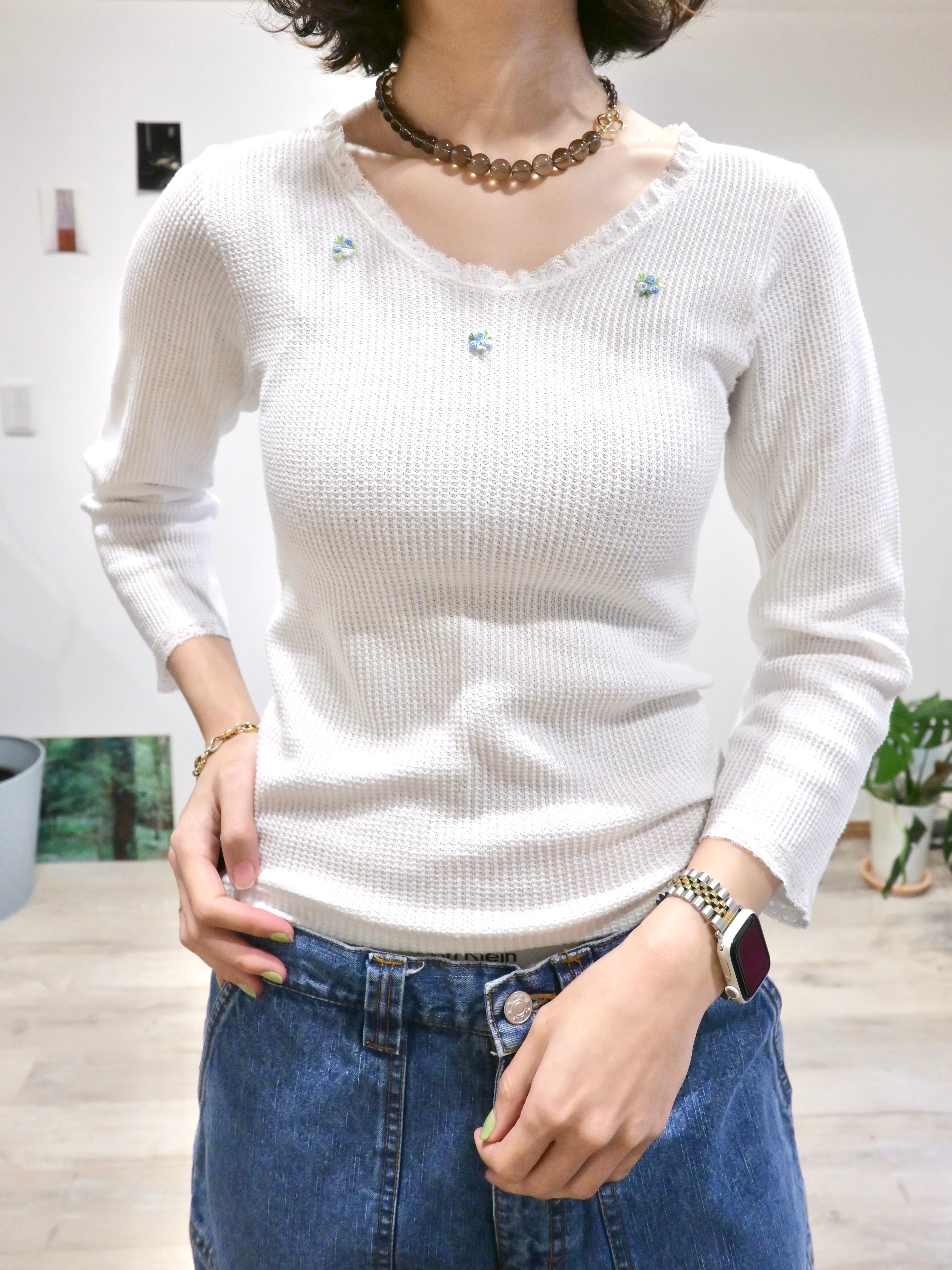 胸元にはサックスブルーを基調とした小さな花の刺繍があしらわれています。