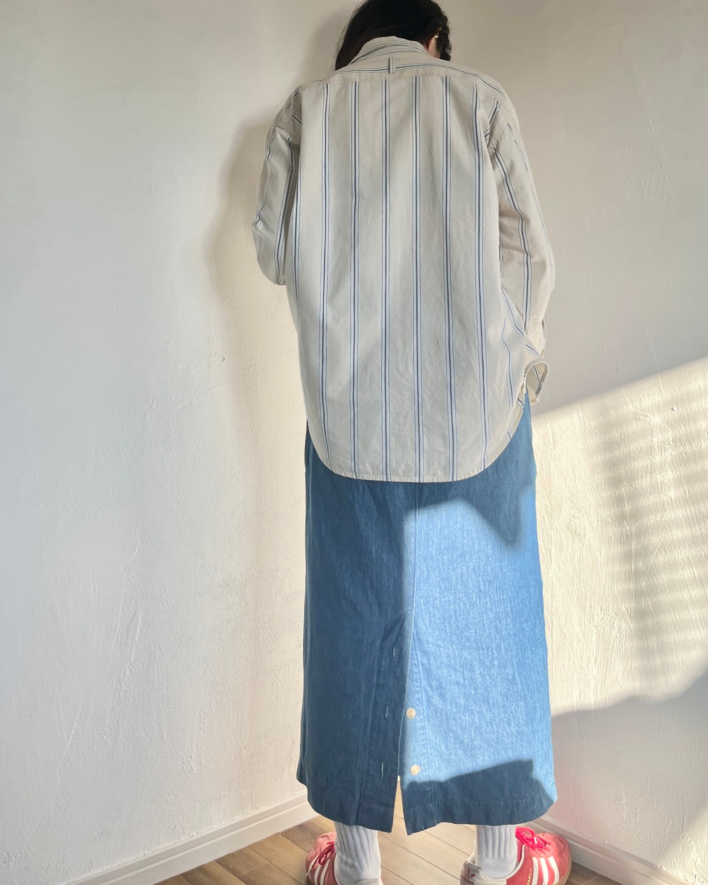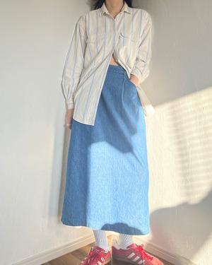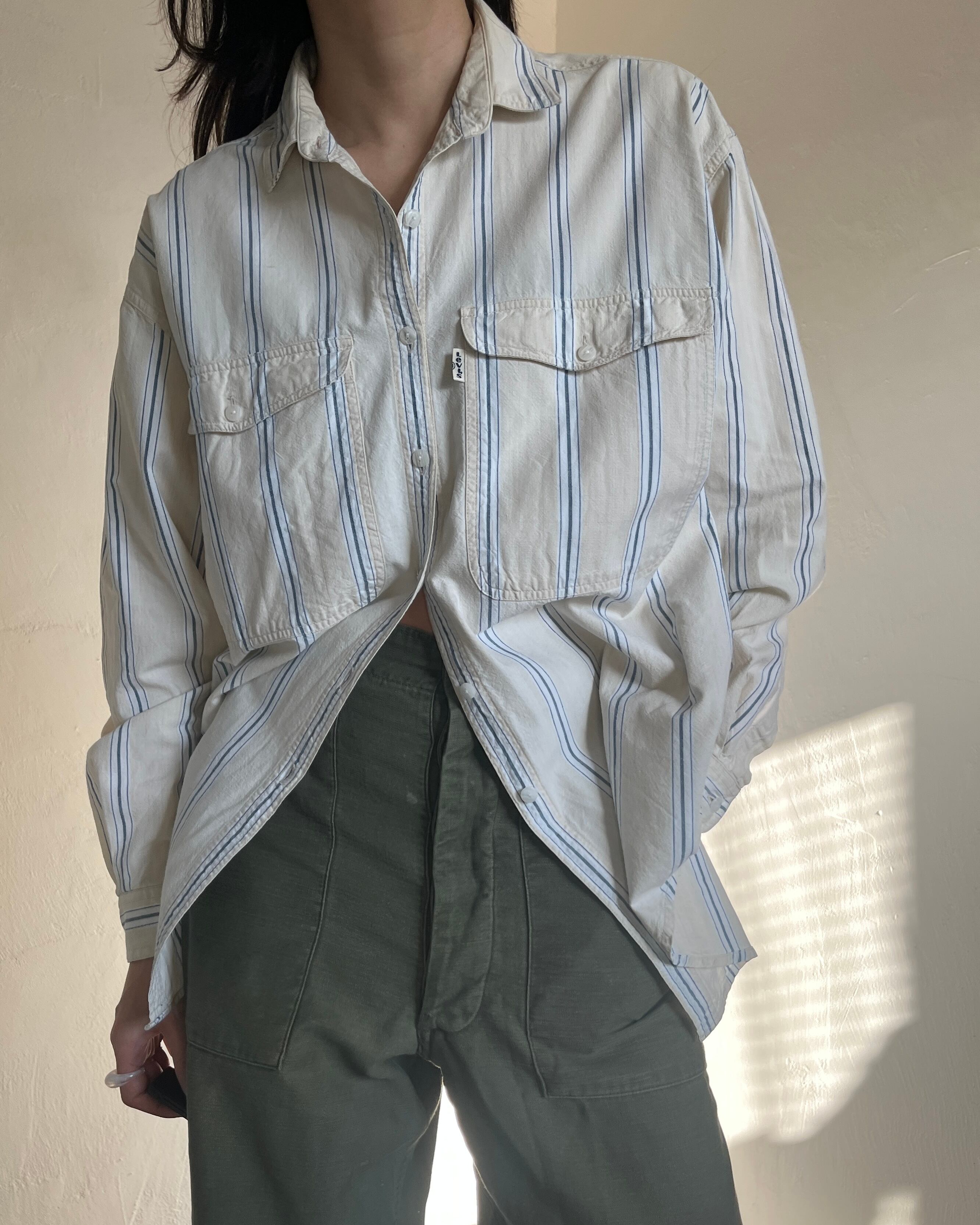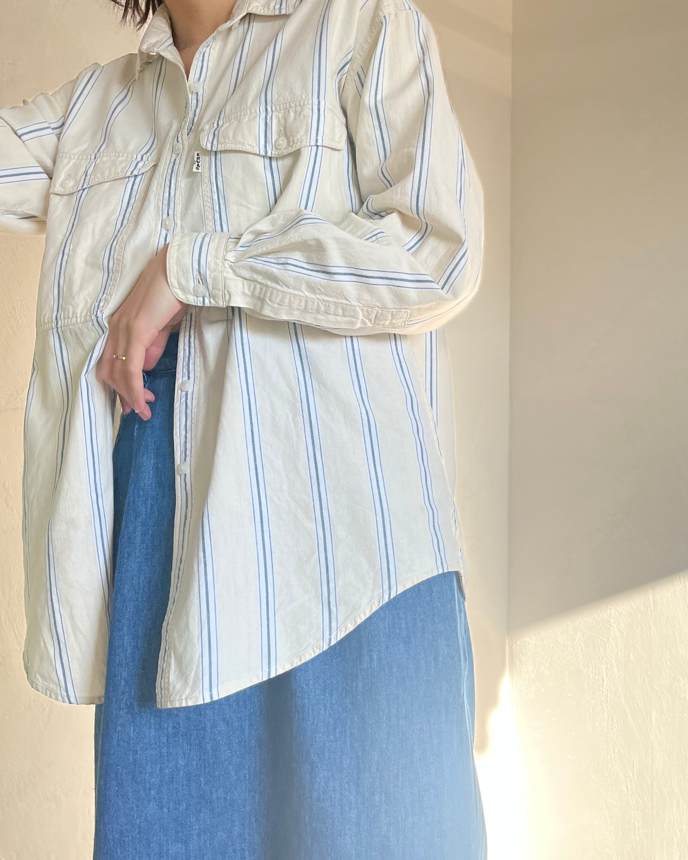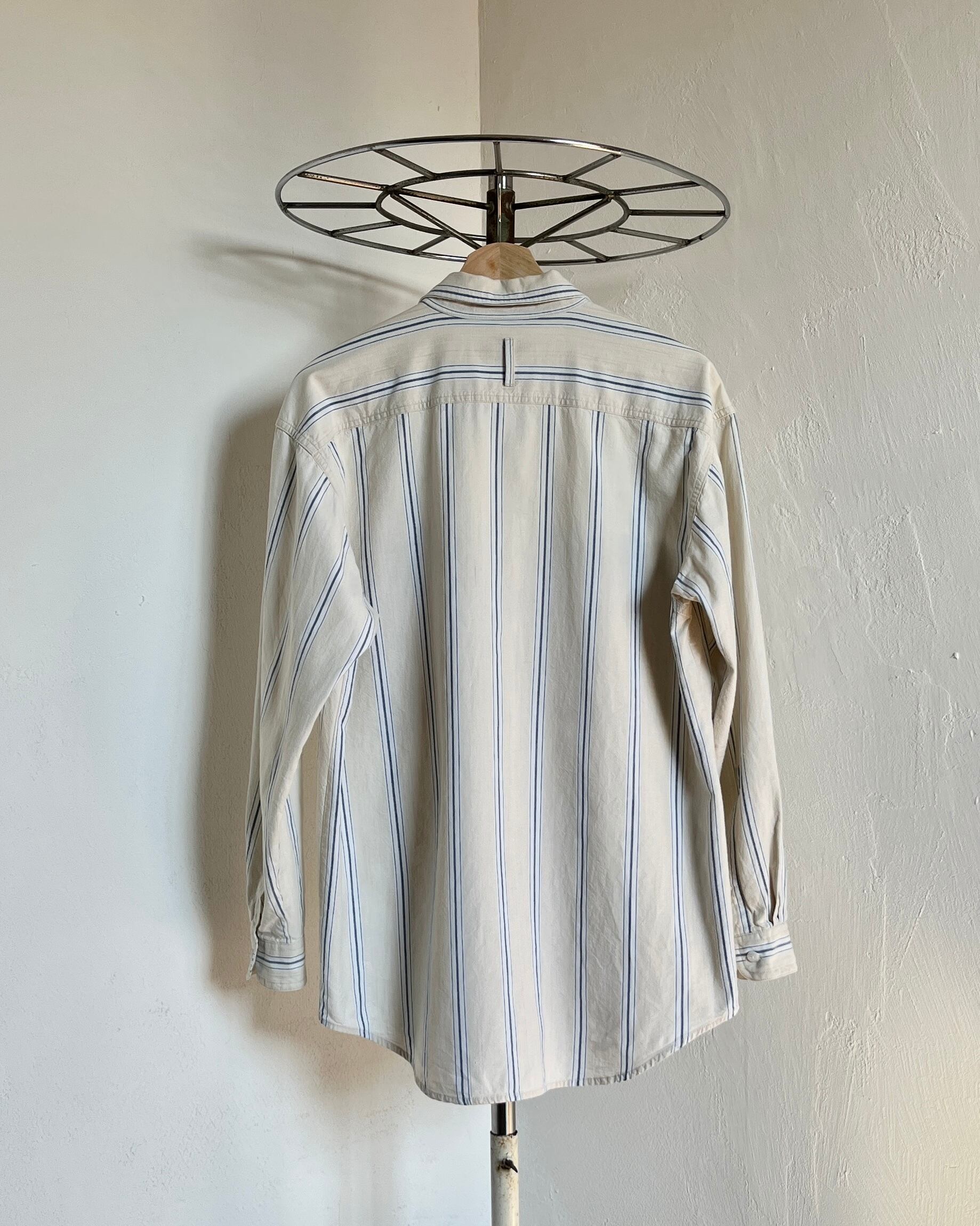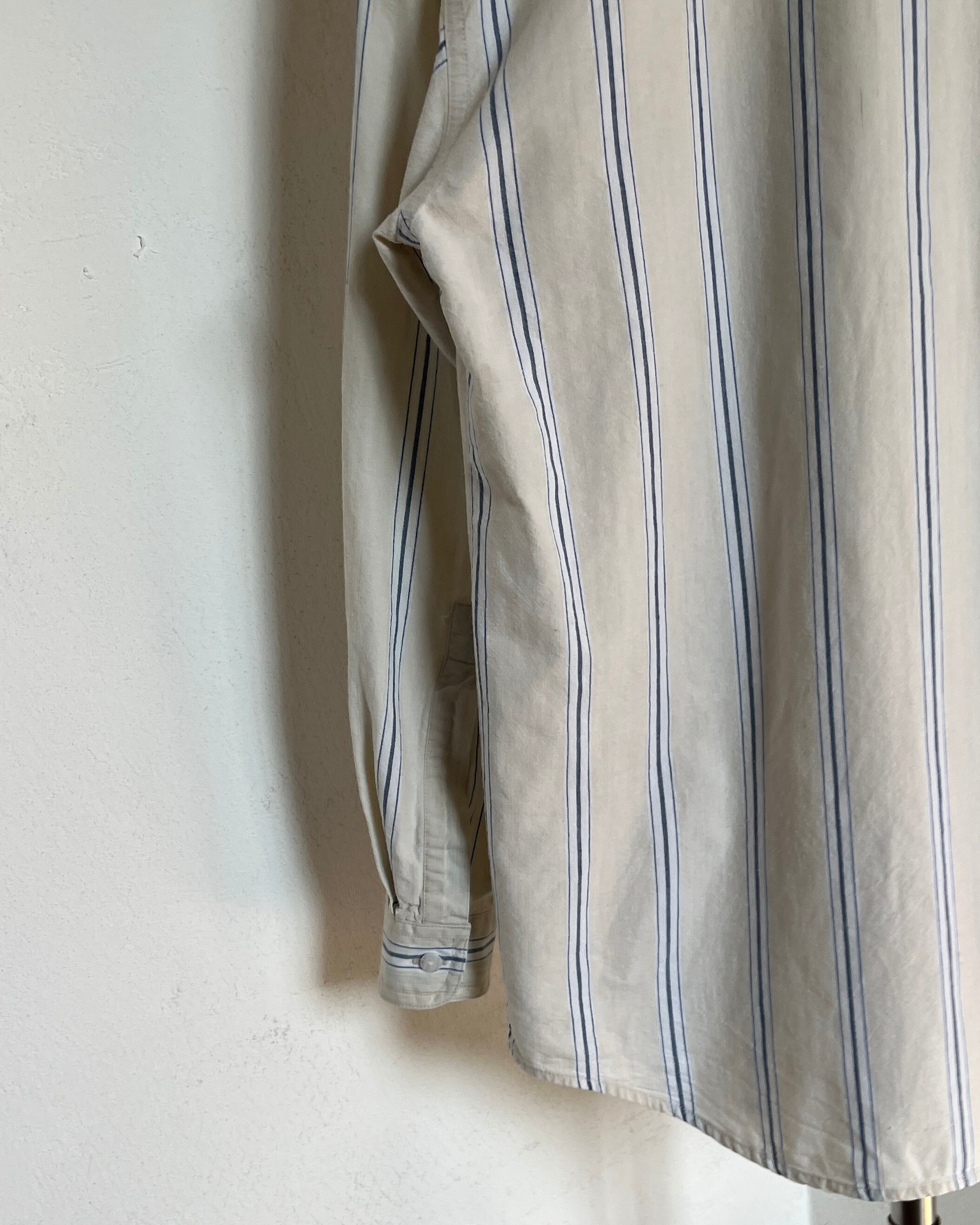 ベージュがベースのストライプシャツ。
