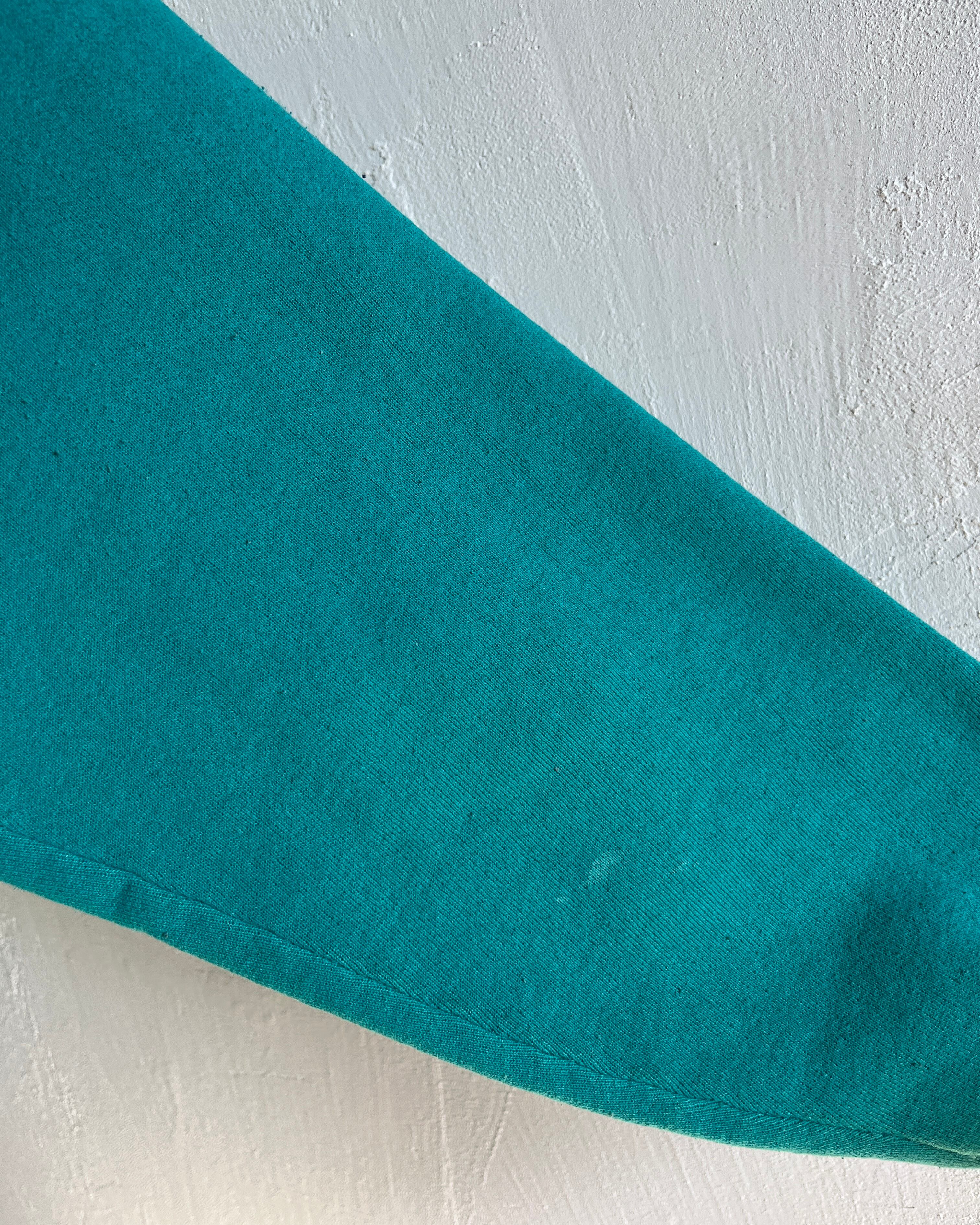 ターコイズグリーンのボディにふにゃっとしたホワイトの刺繍がシンプルながら印象的なデザイン。