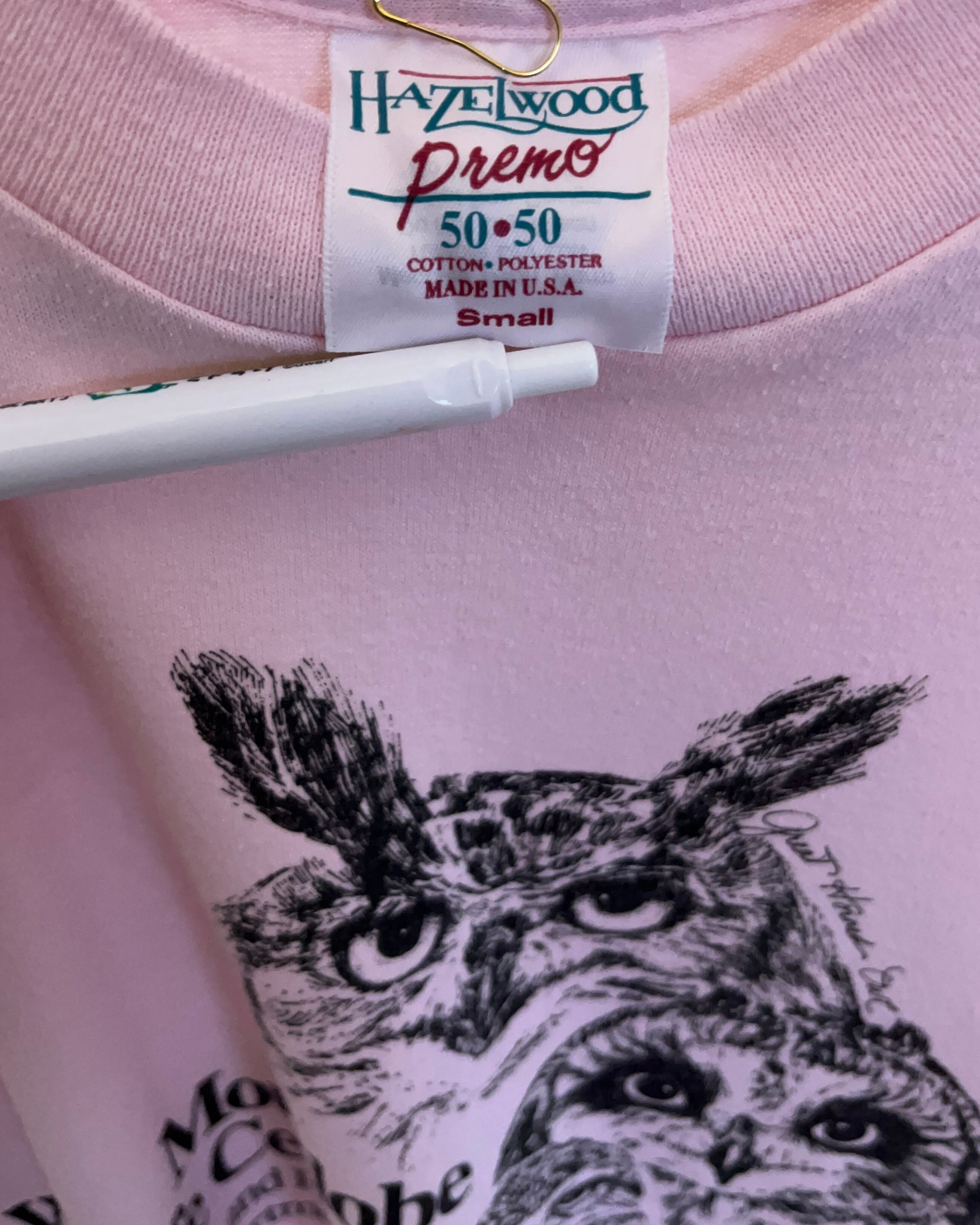 ベビーピンクのボディにじっとこちらを見つめる3羽のふくろうのプリントがシュールで目を奪われます。
