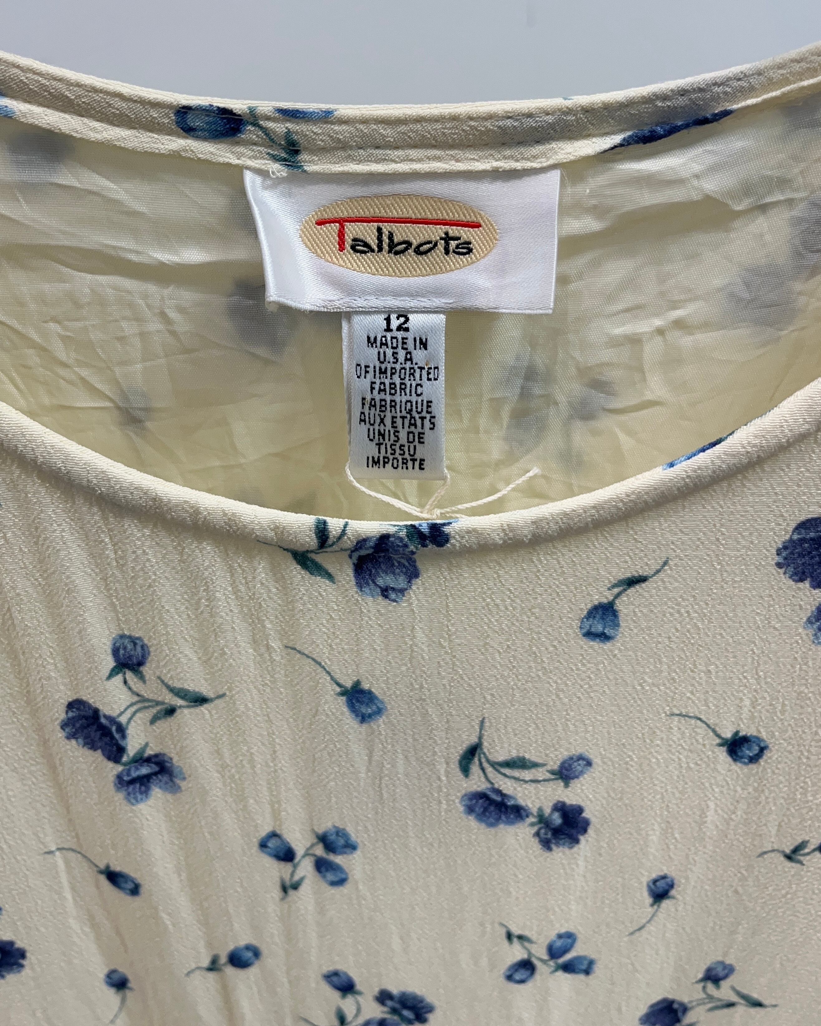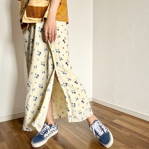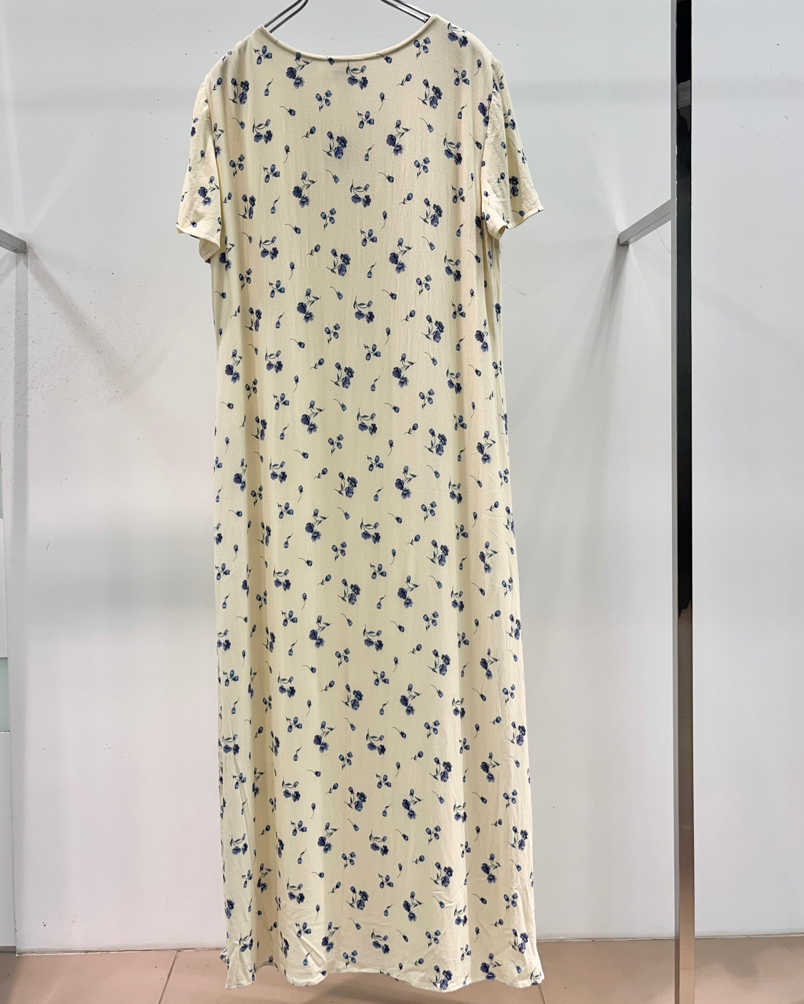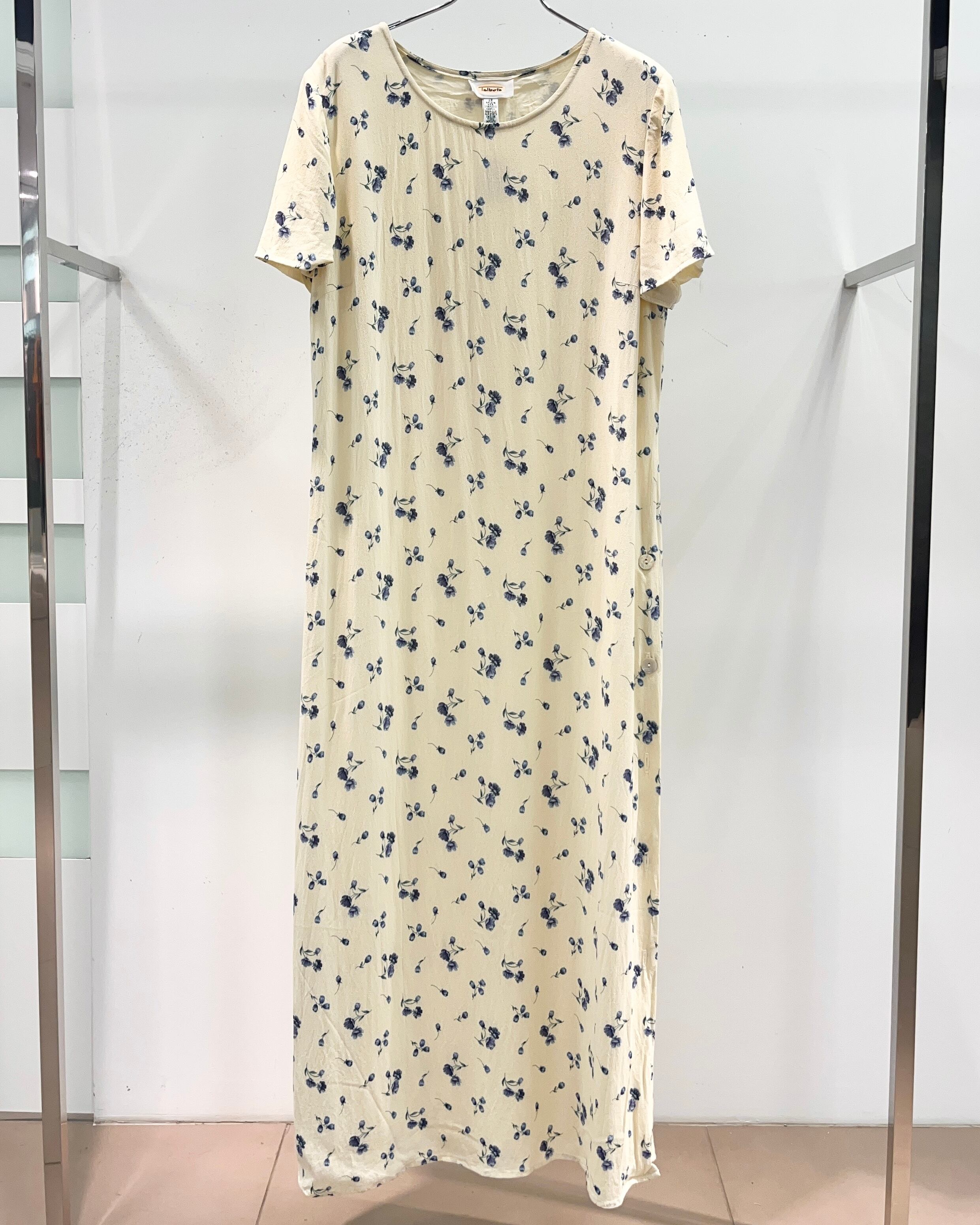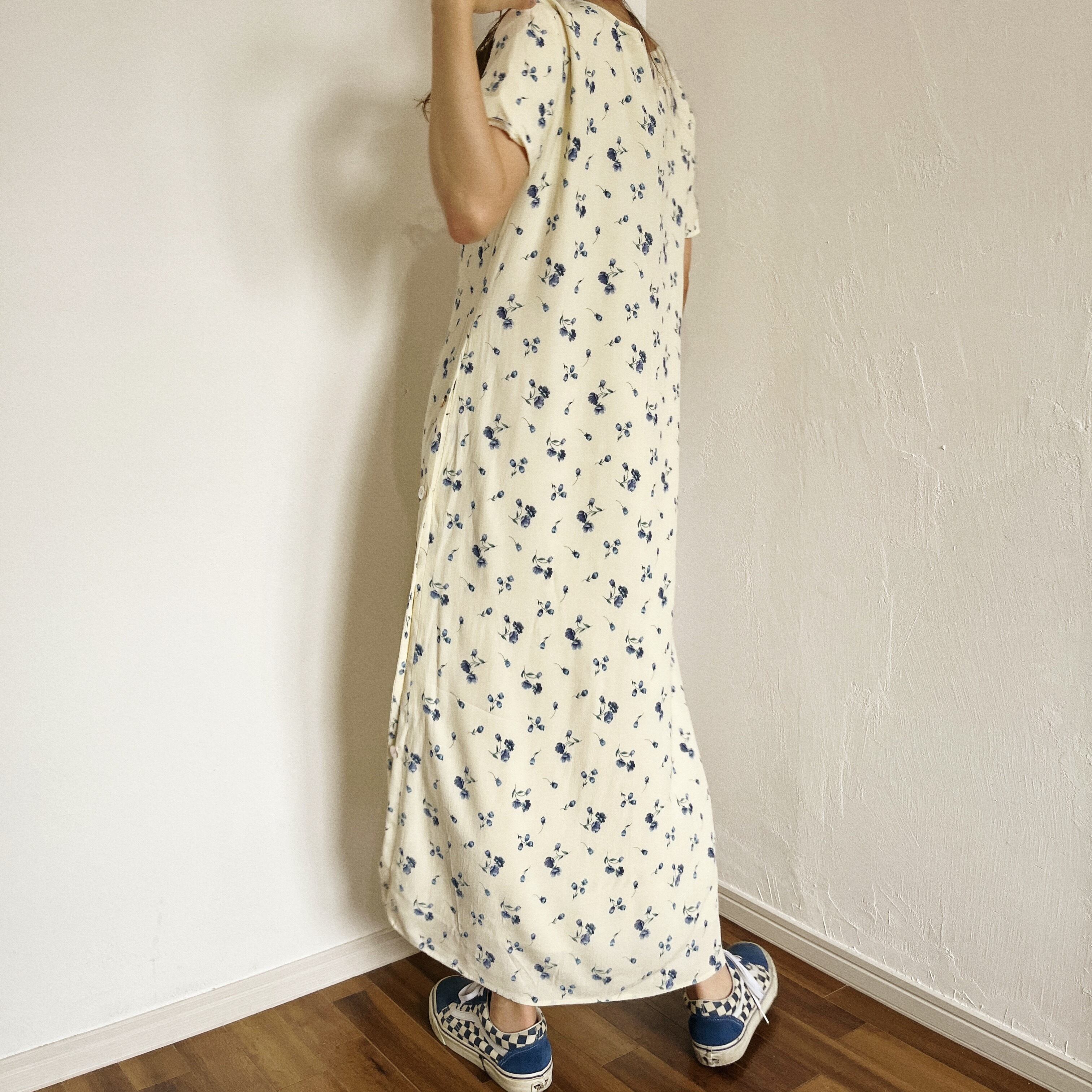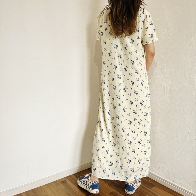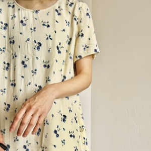 淡いレモンイエローにブルーの小花柄のワンピース。