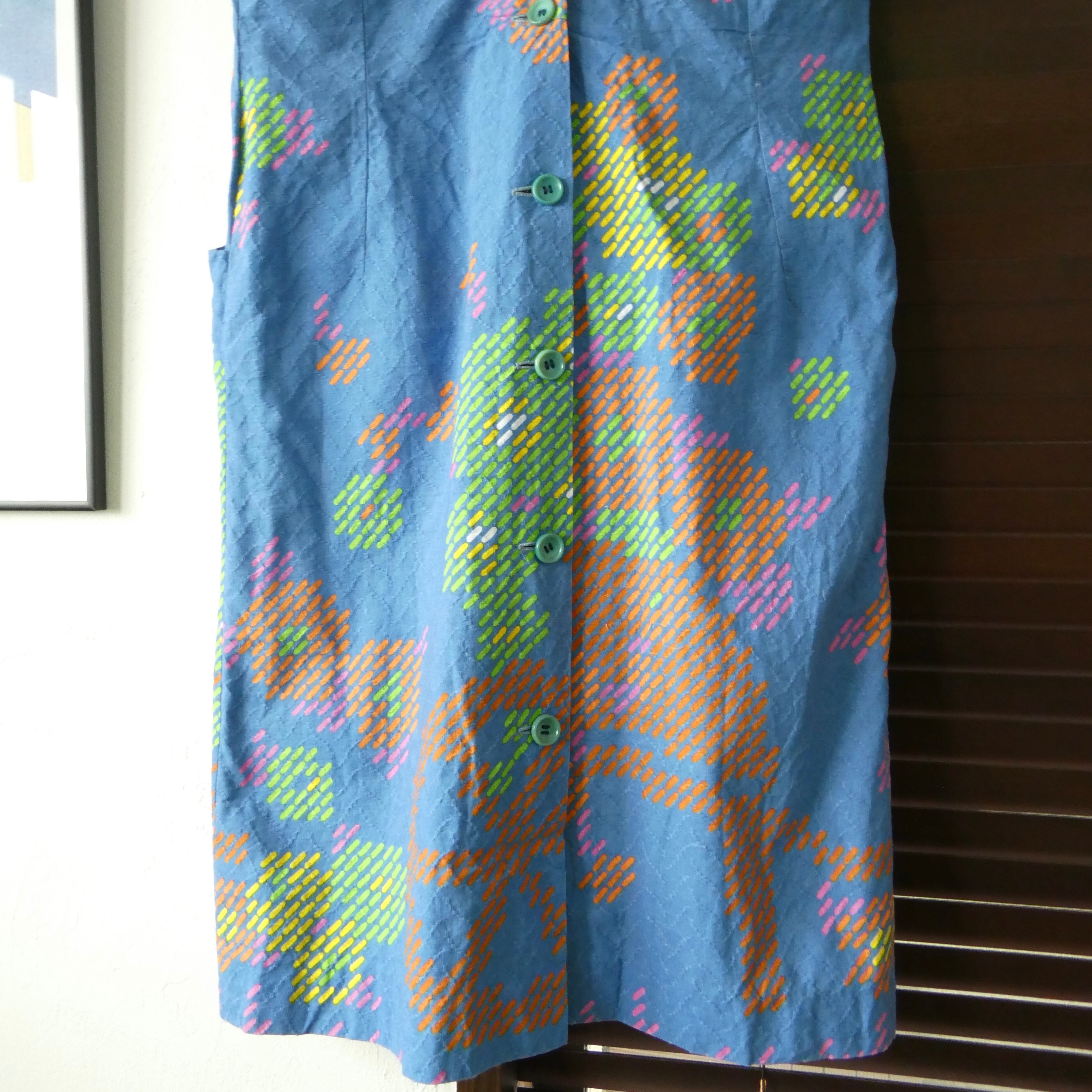 ハリのあるデニム素材にドット絵のようなカラフルなデザインが施されたワンピース。