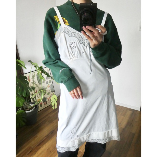 グリーンのボディにやわらかいタッチのひまわりが描かれたスウェット。