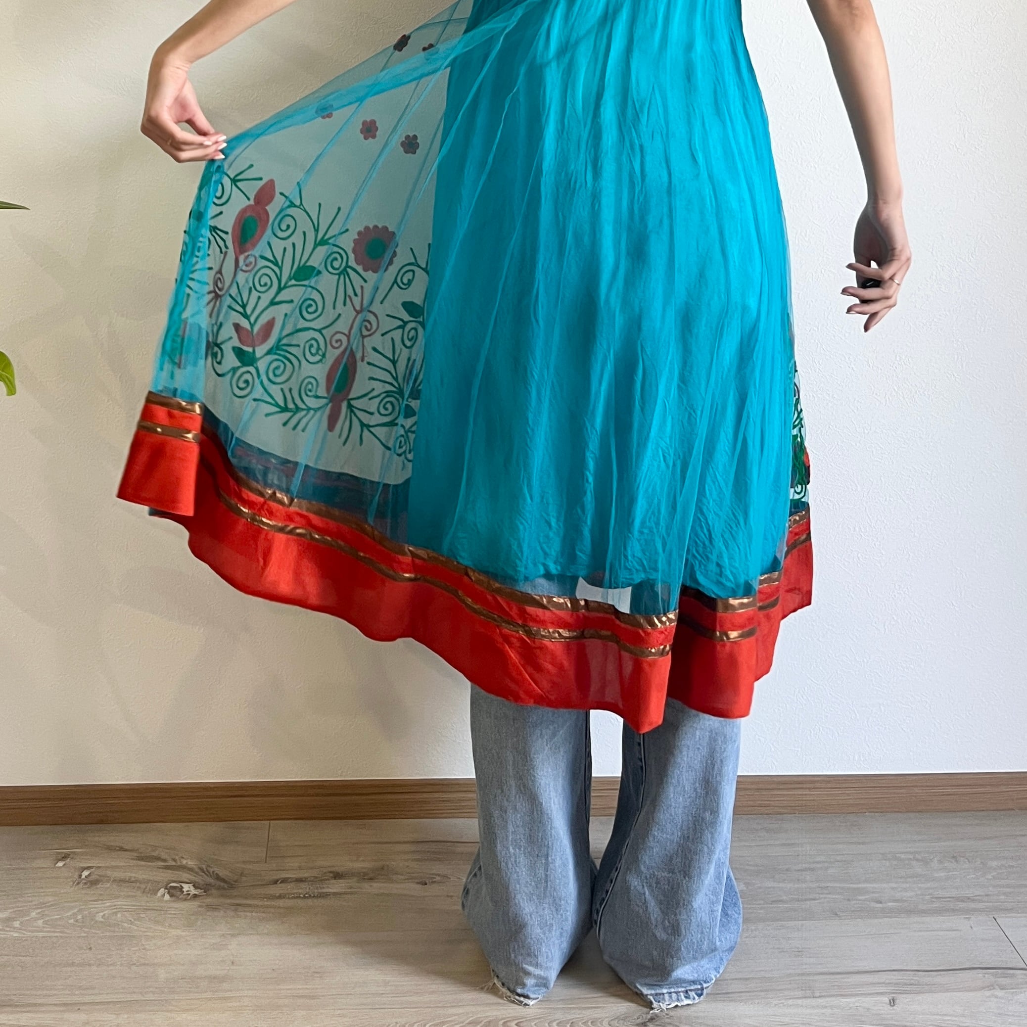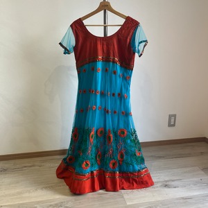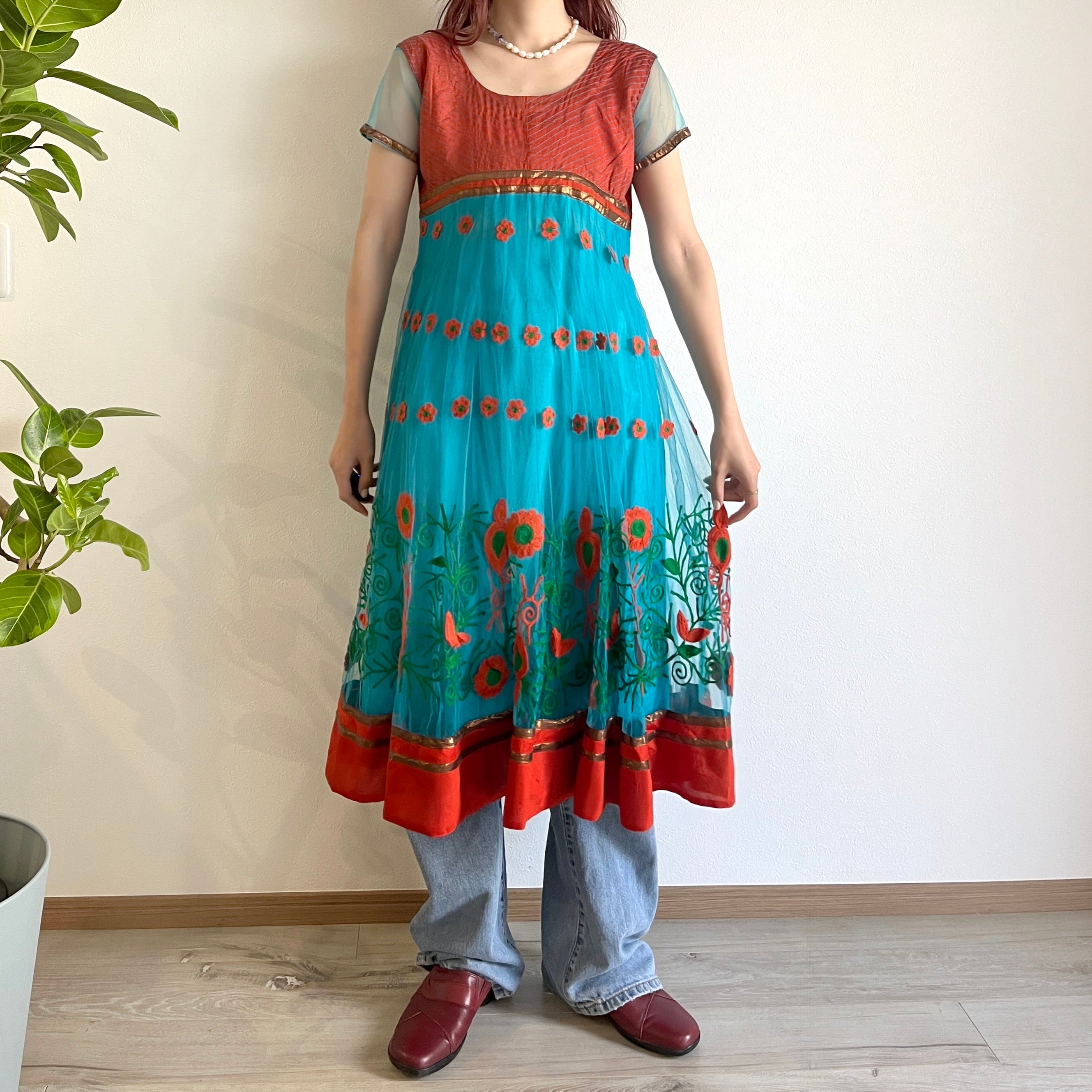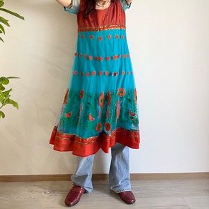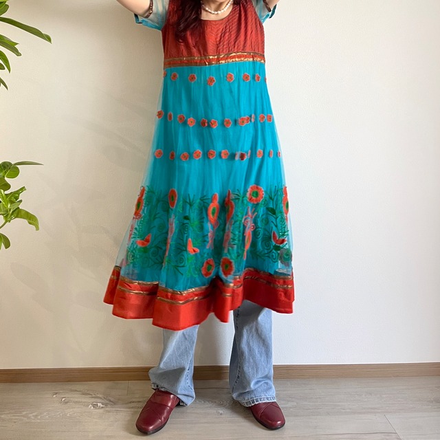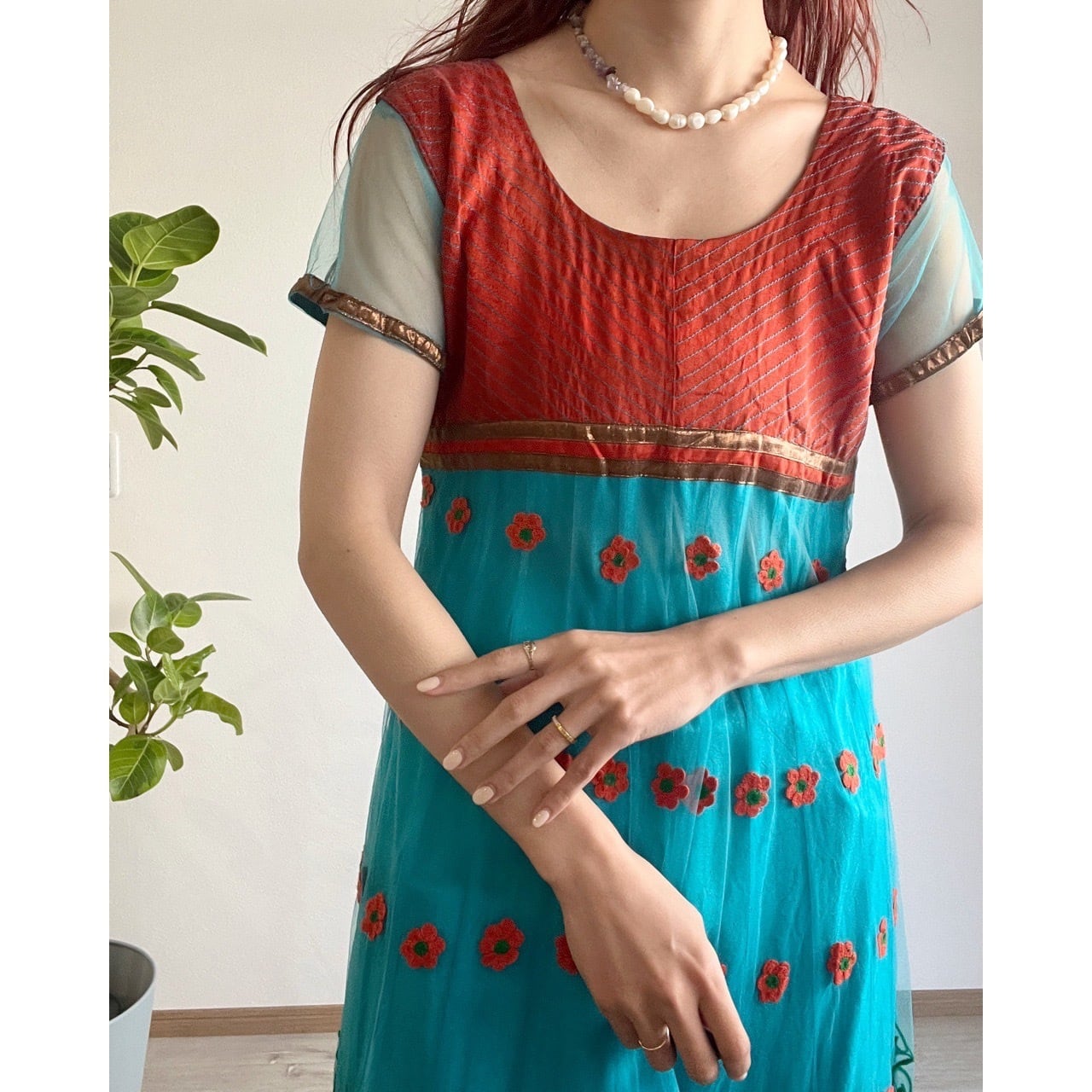 ターコイズブルーのチュールスカートにオレンジ、グリーン草花の刺繍が施されたワンピース。