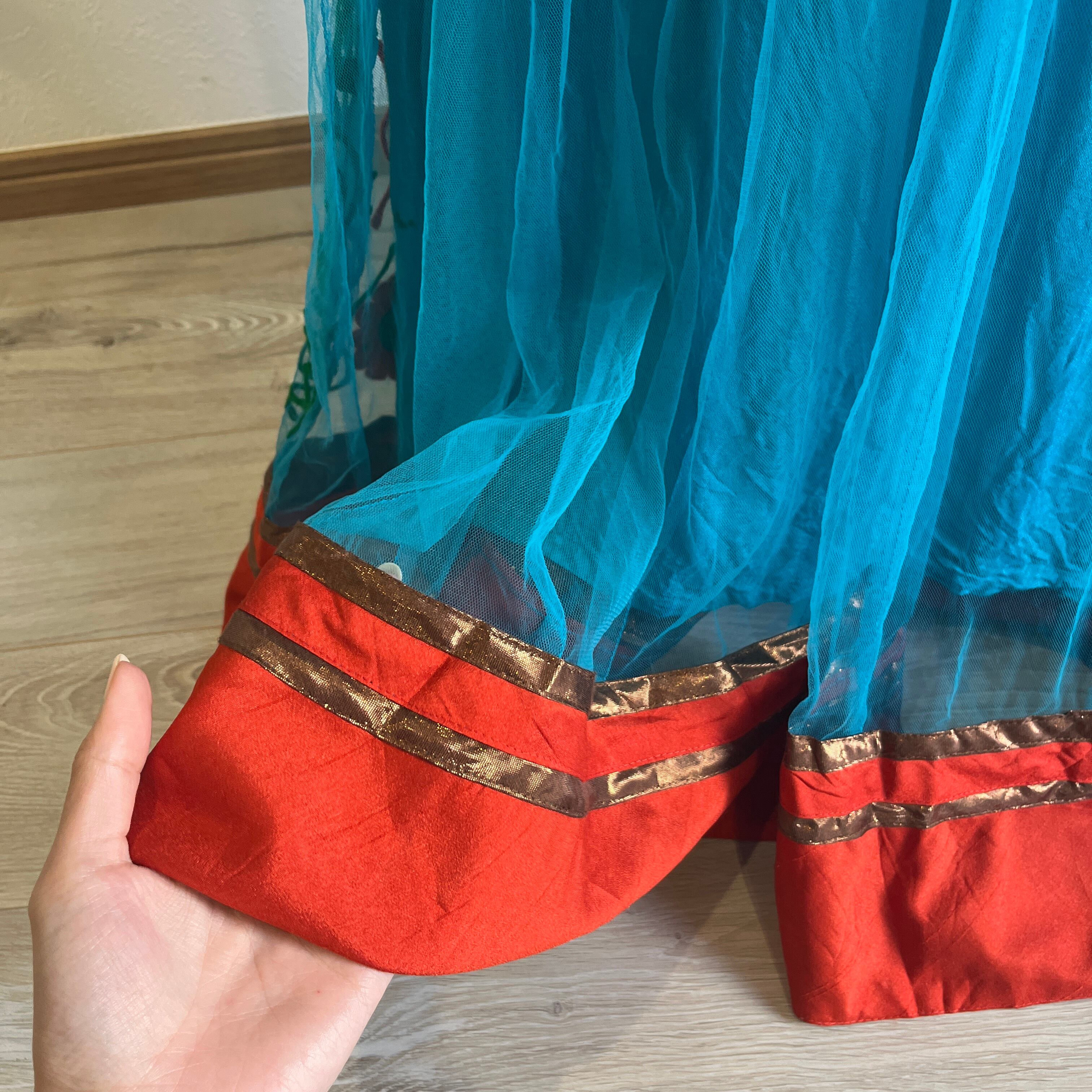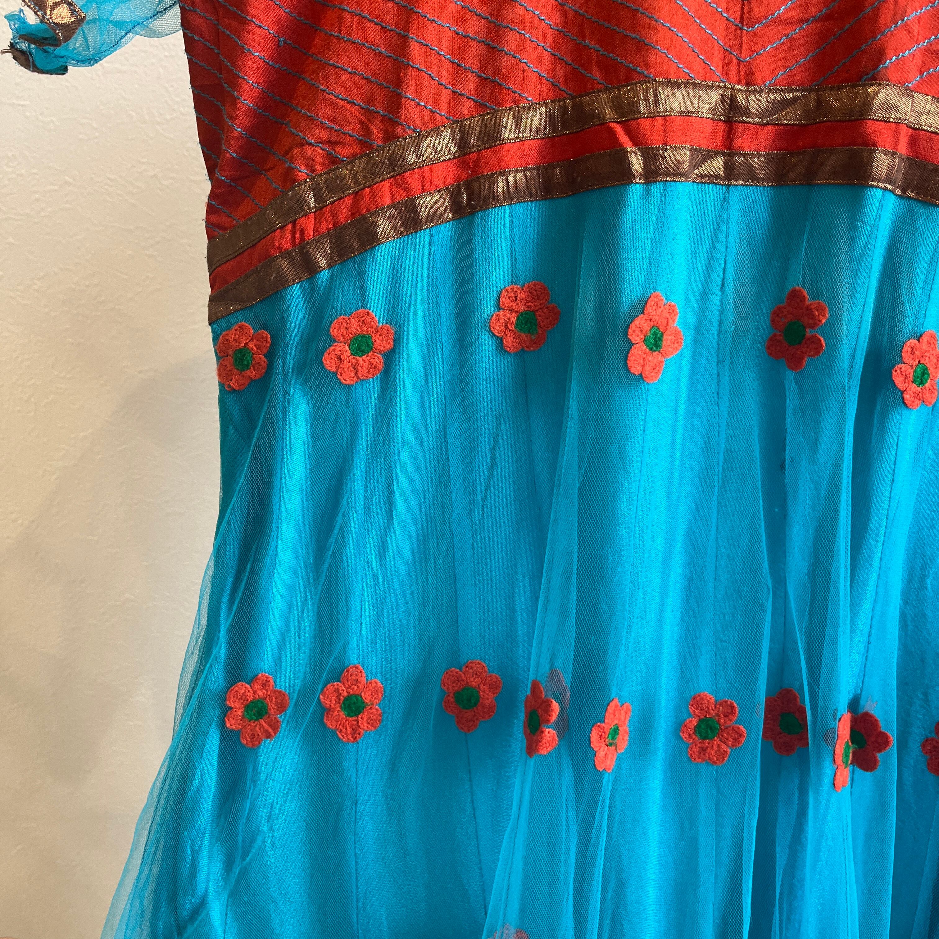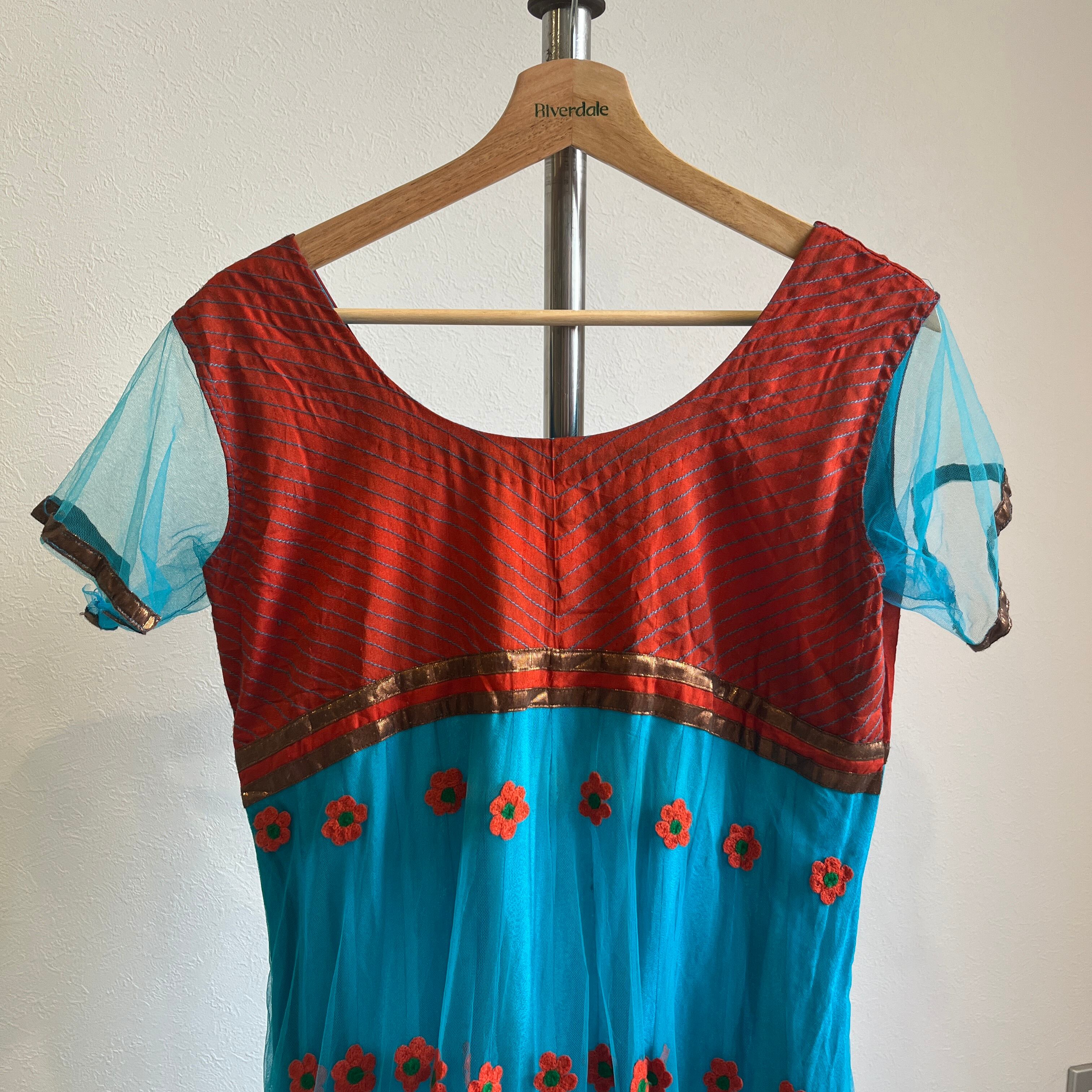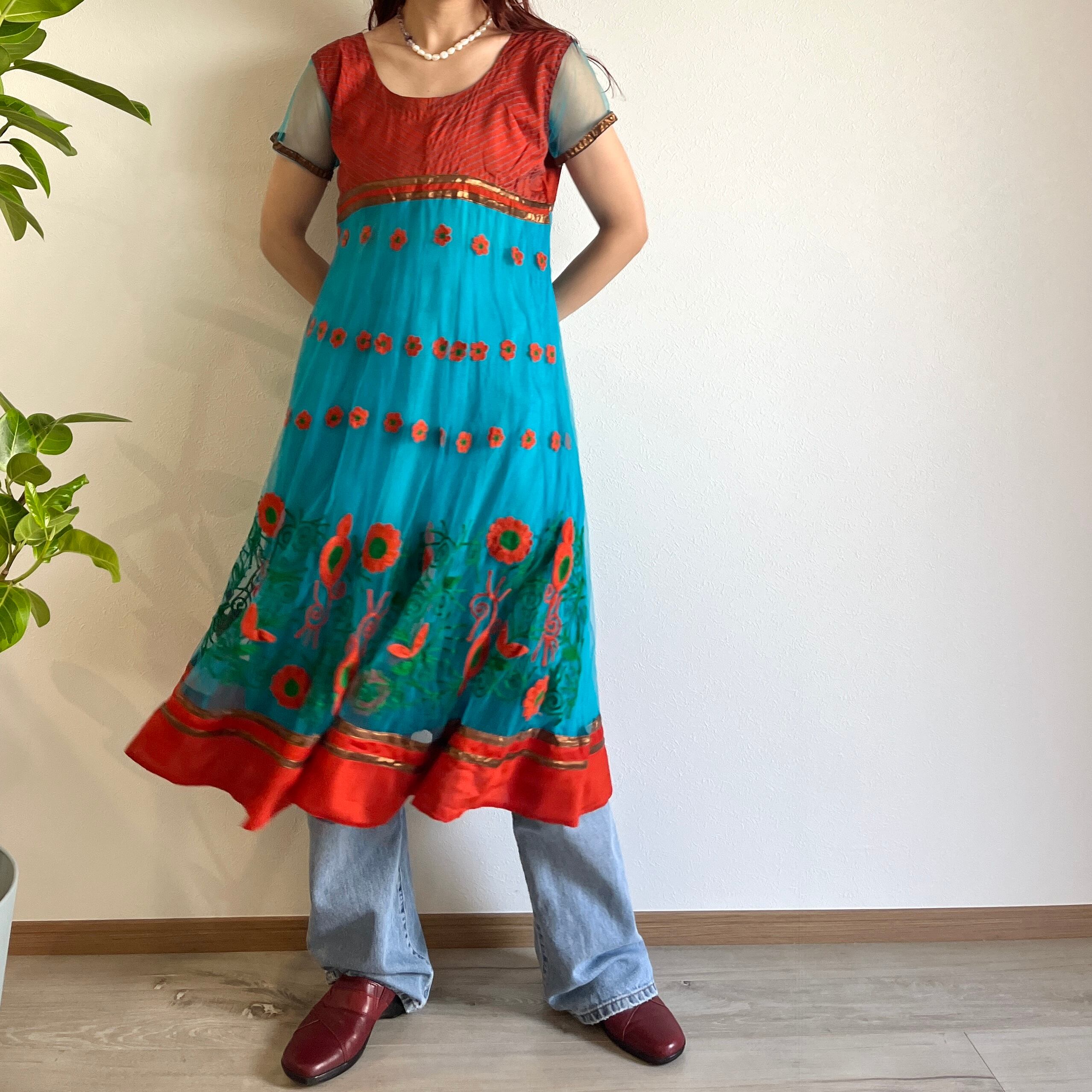 ターコイズブルーのチュールスカートにオレンジ、グリーン草花の刺繍が施されたワンピース。
