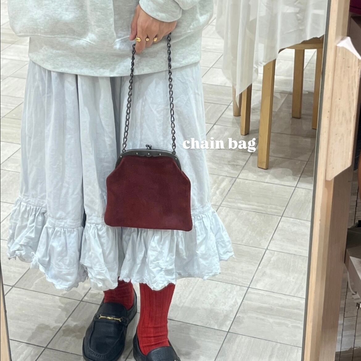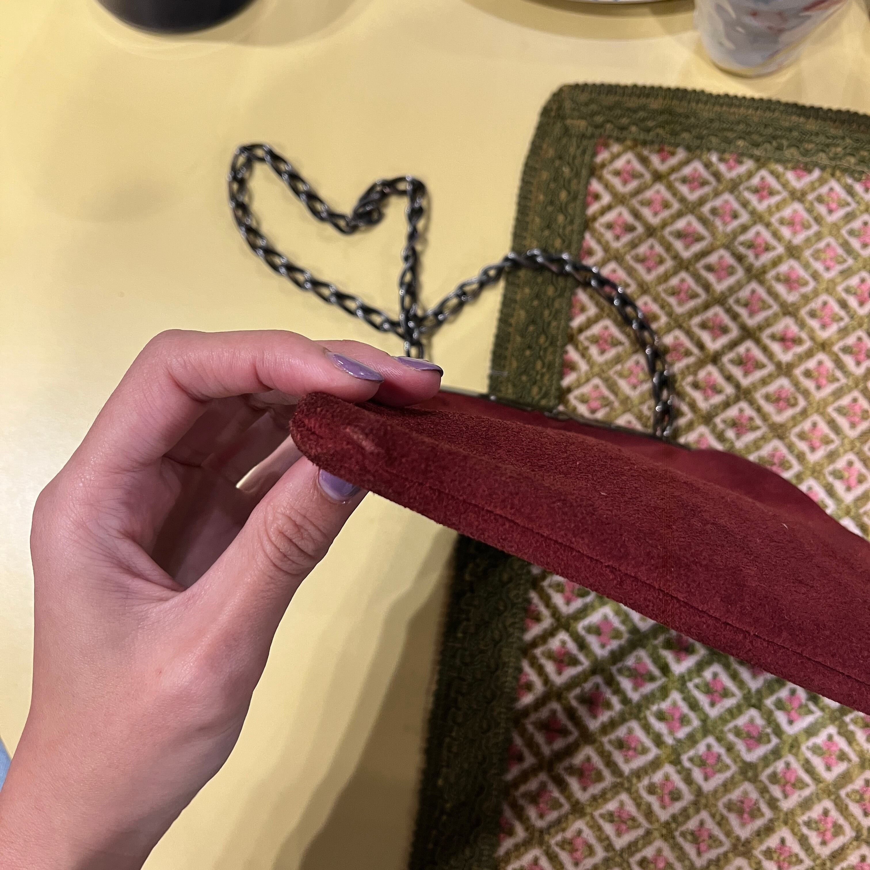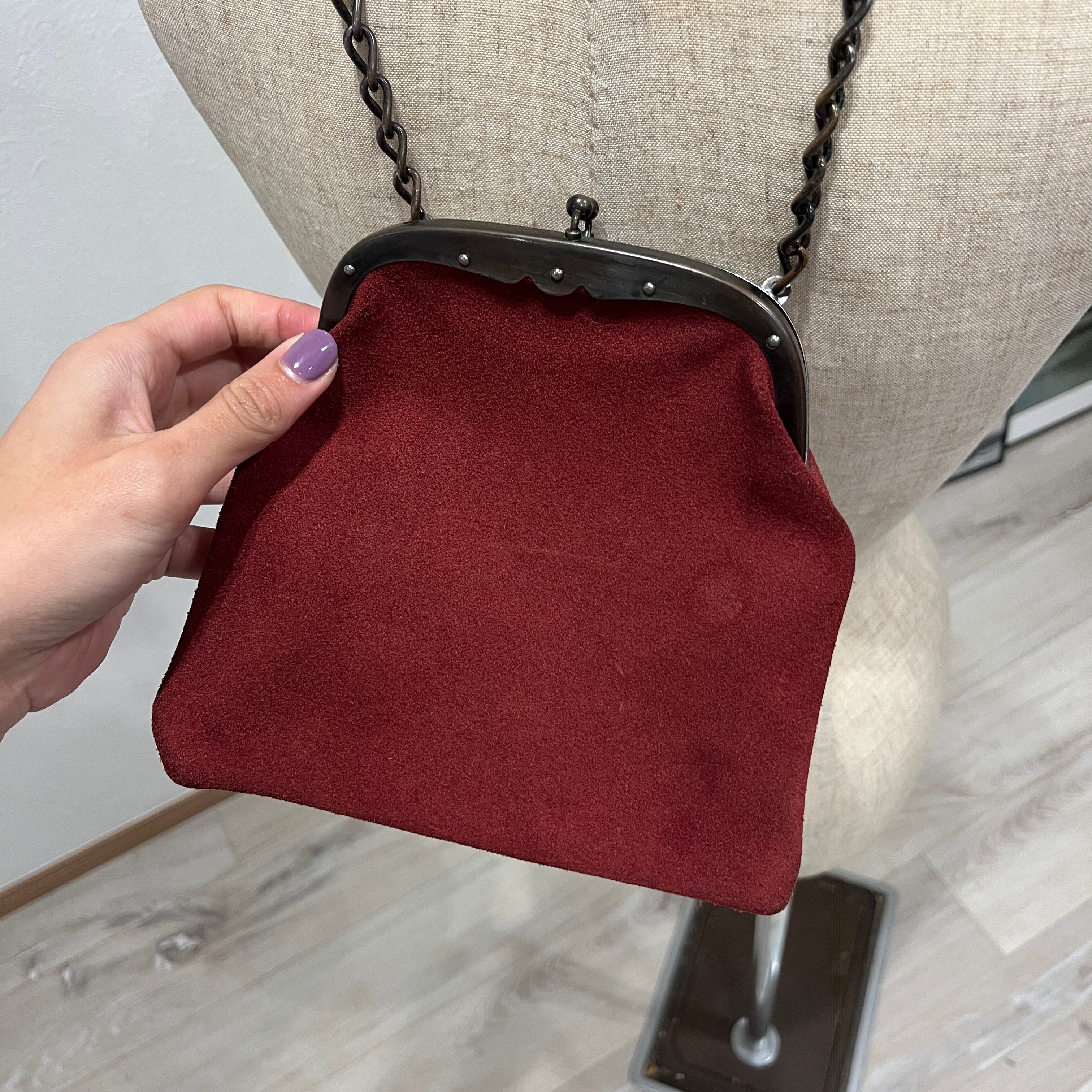 ダークレッドのスエードに、チェーンはグレーのようなシルバーのような絶妙なカラー