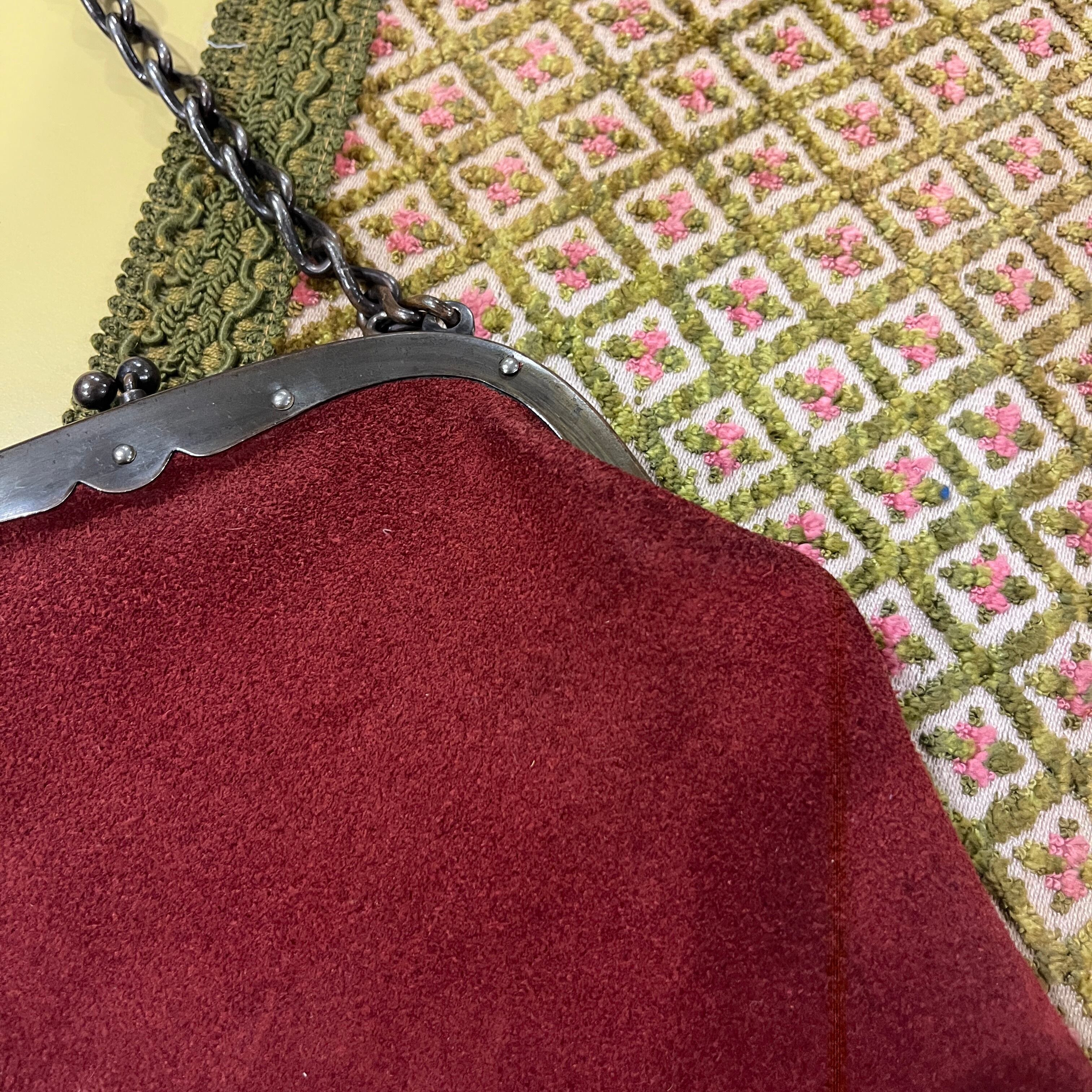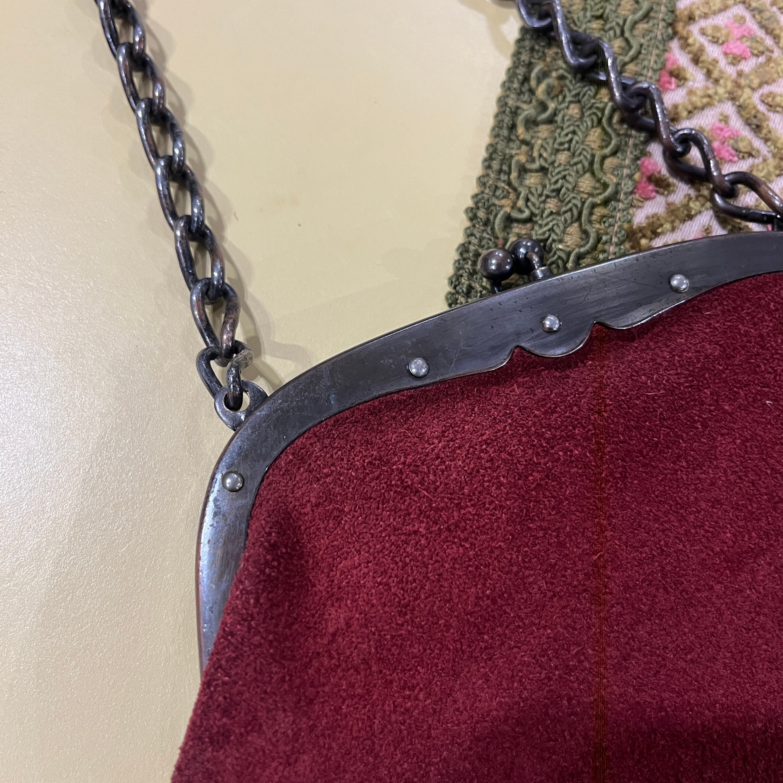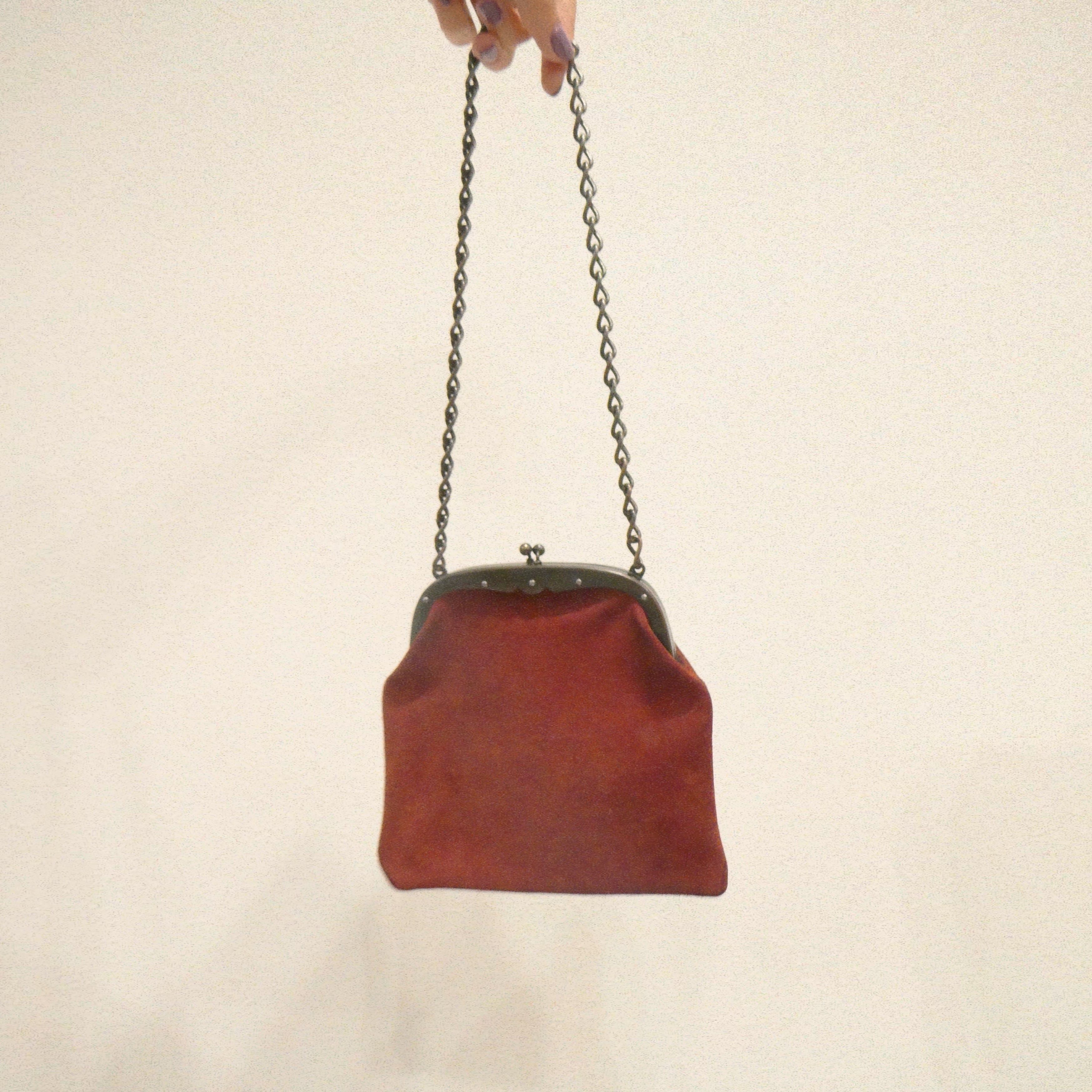ダークレッドのスエードに、チェーンはグレーのようなシルバーのような絶妙なカラー
